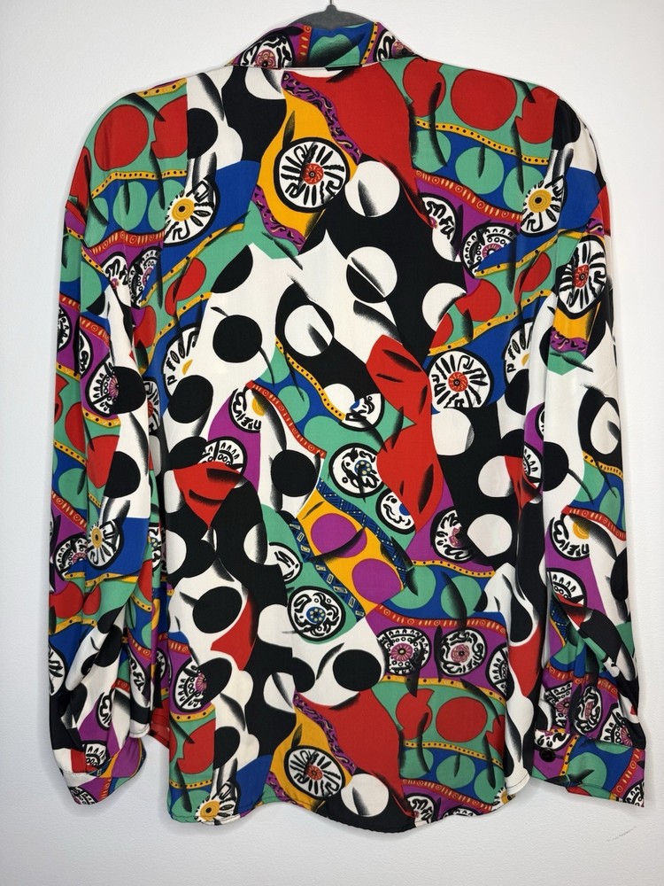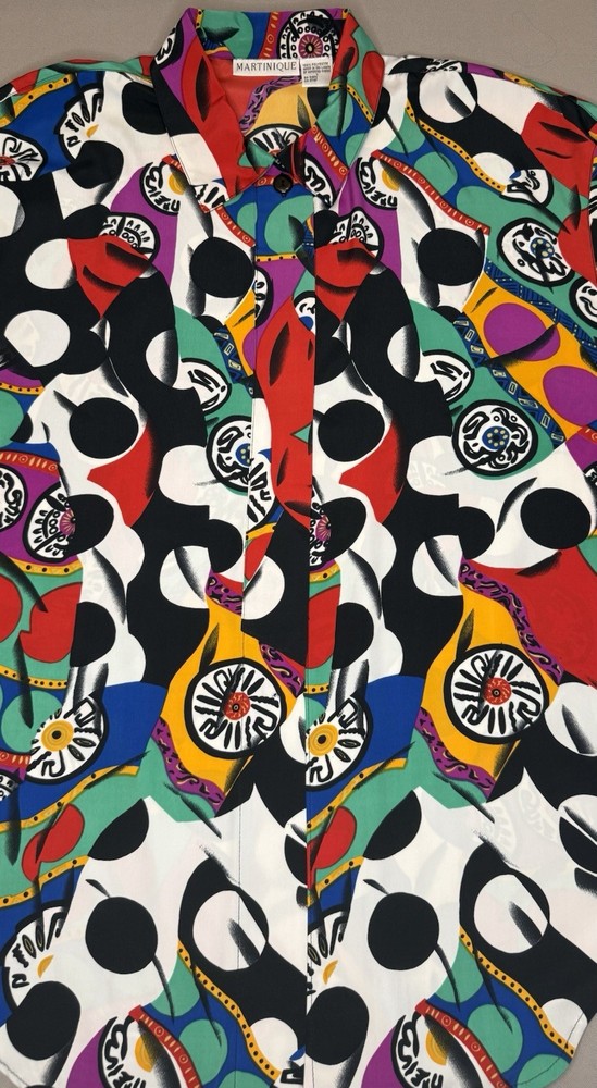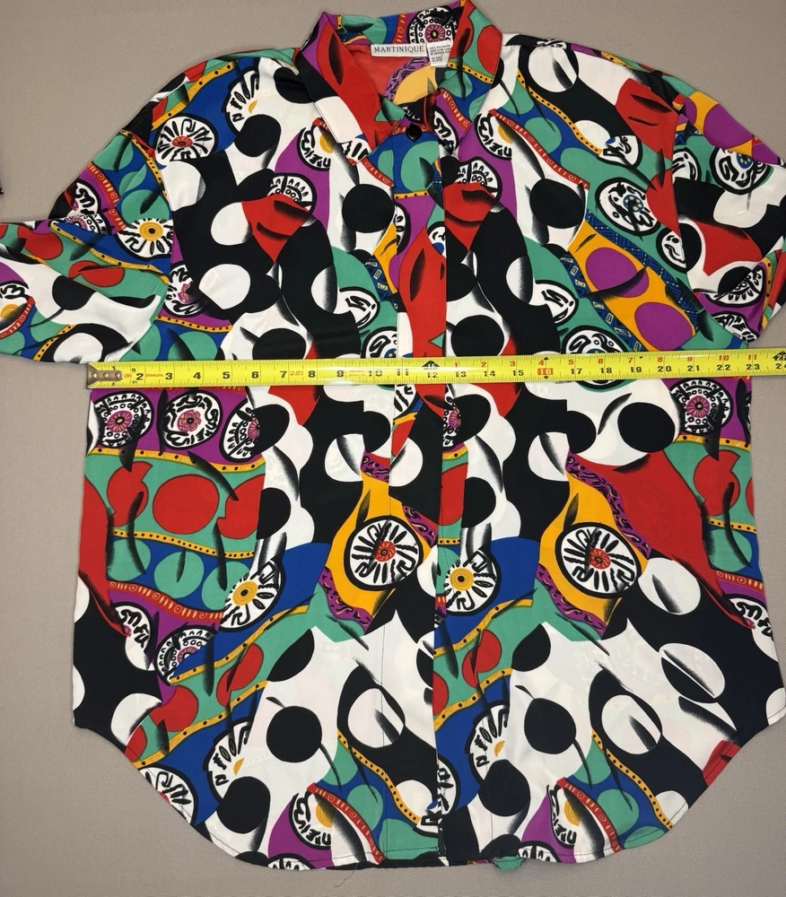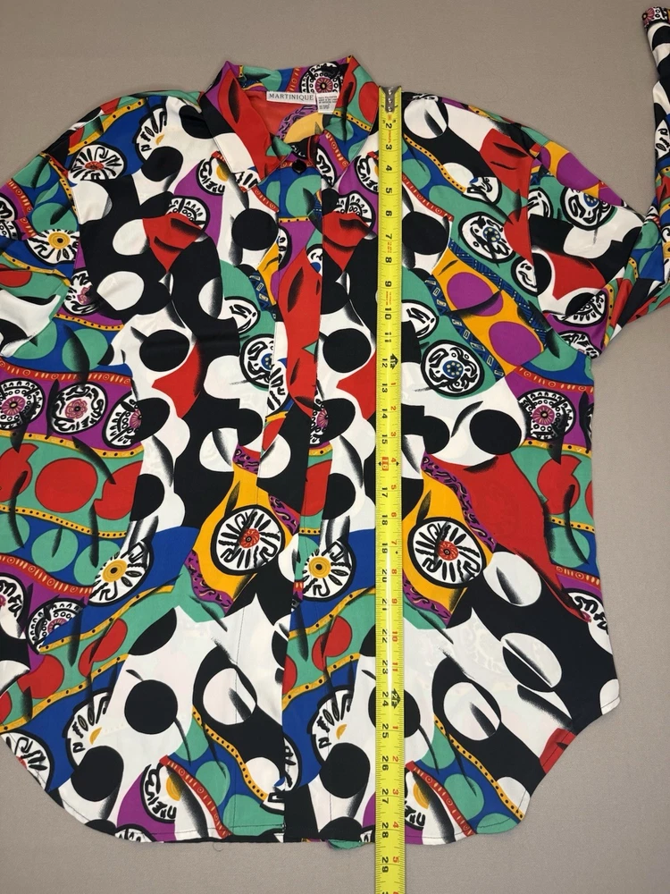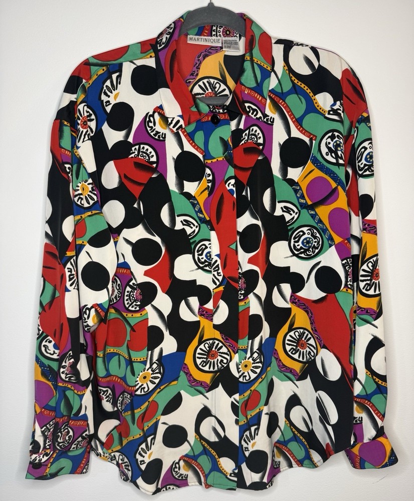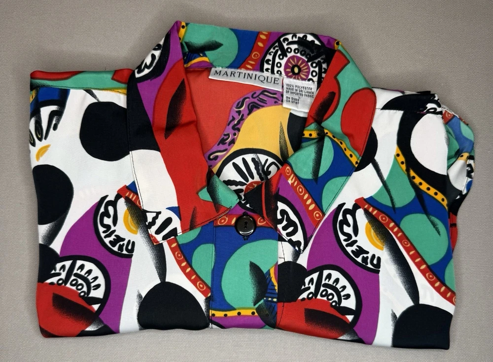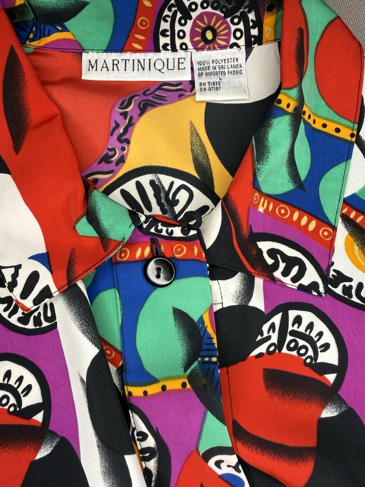 Vintage MARTINIQUE blouse featuring a bold abstract graphic print with colorful geometric shapes. Button front design with a relaxed vintage fit and lightweight fabric. A fun retro statement piece that can easily be styled casually or dressed up. Details • Brand: Martinique • Size: Women’s Large • Material: 100% Polyester • Button front • Long sleeves • Abstract geometric / graphic print • Made in Sri Lanka Condition: Pre-owned in excellent condition. Please review photos and measurements to ensure proper fit. Note: First image is a digitally enhanced model image for styling reference. See photos for actual item details and fit.
