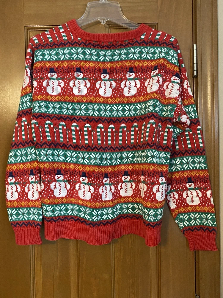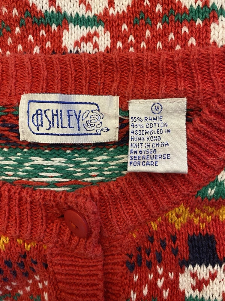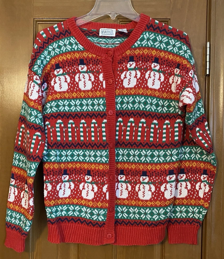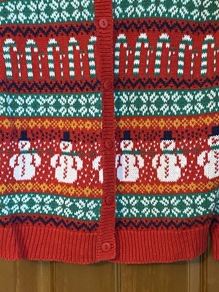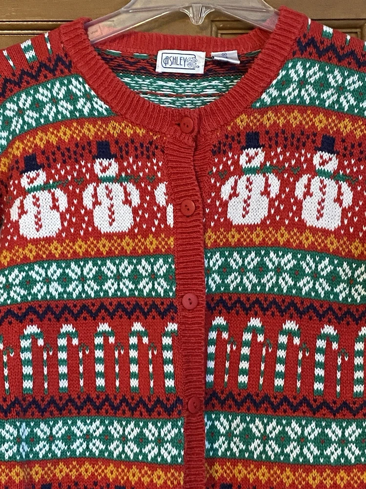 Get into the holiday spirit with this vintage 90s Ashley Busy Snowman Candy Cane Ugly Christmas Sweater Cardigan. This colorful and festive piece is made of a comfortable cotton blend material, perfect for any holiday occasion. The sweater features a multi-color design with a holiday theme, and is an original piece from the Ashley brand. The sweater has a regular size fit, with a shoulder to shoulder measurement of 42” chest, 22.5” sleeve from shoulder, and a shoulder to hem length of 23.5 inches. It was manufactured in Hong Kong during the 1990s and has a classic Christmas look. This sweater is perfect for anyone looking for a unique and comfortable holiday outfit. It is in gently used vintage condition.