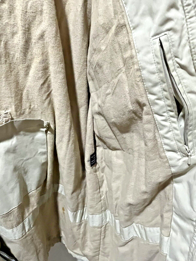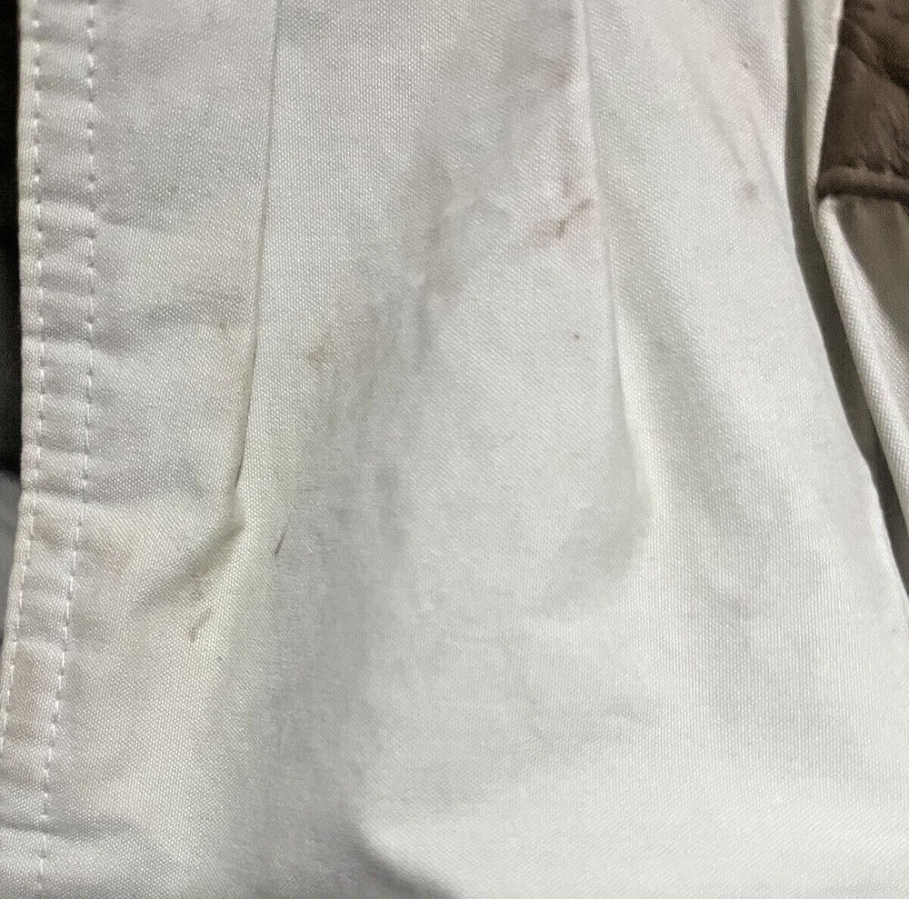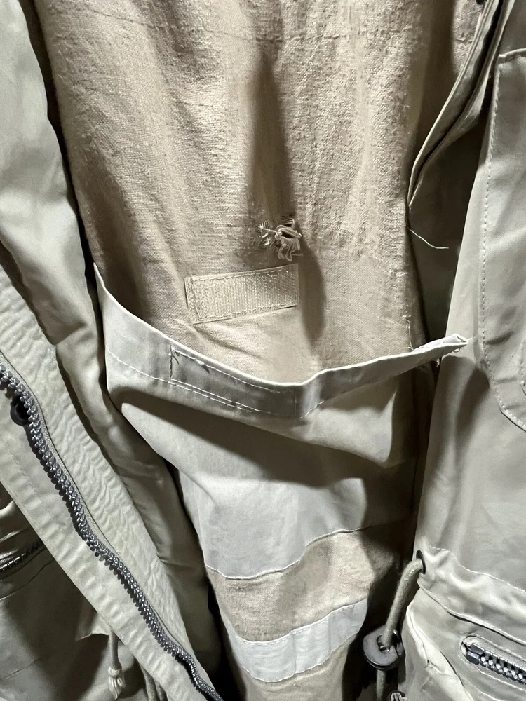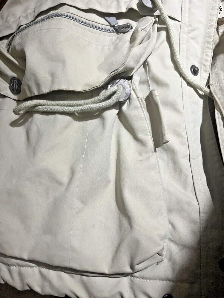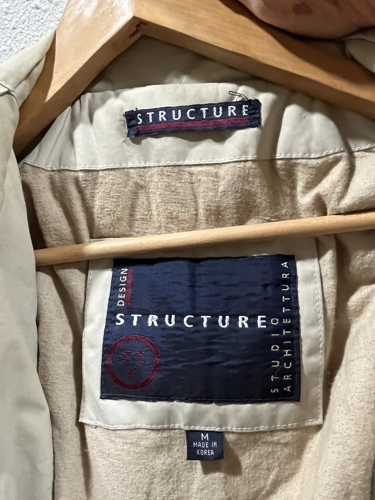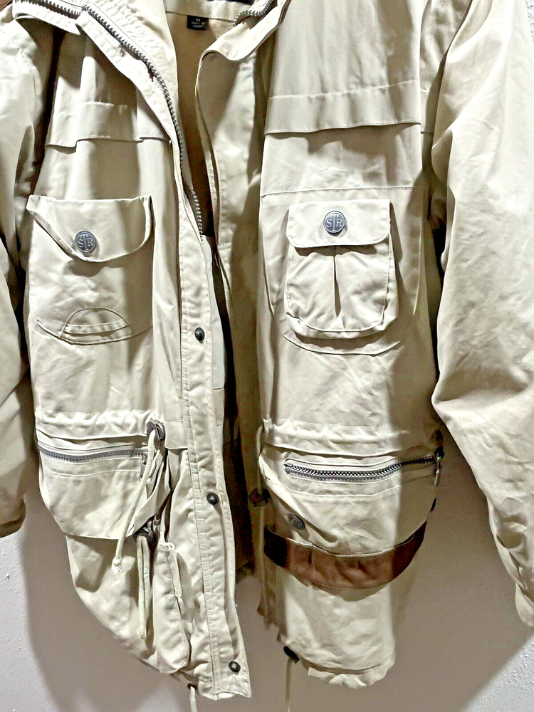 Vintage Structure Anorak Mid-LengthJacket Extra Pockets Travel Coat Barn Field Safari Hunting Fishing Waist Drawstring Cinch and Hemline Drawstring Cinch. Full zipper closure with covered snaps for wind protection. Snap closure long sleeves. Full zip closer with stand up collar. Plenty of pockets: 2 snap closure expandable breast pockets, extra large expandable front pockets with flap and snap close, additional zippered exterior small pockets on pocket flaps. One large pocket has a drawstring cinch and material loop. The second large pocket has a leather horizontal that can be used to hang accessories. On the inside is a zippered breast pocket. Another security pocket is hidden on the interior back with a hook-loop closure. Men's Tag Size Medium Chest 44 Length 32 inches. Interior snag hole near hidden pocket, small spots and interior collar discolor that may come out with extra spot cleaning. Beige Cotton Blend Coat.