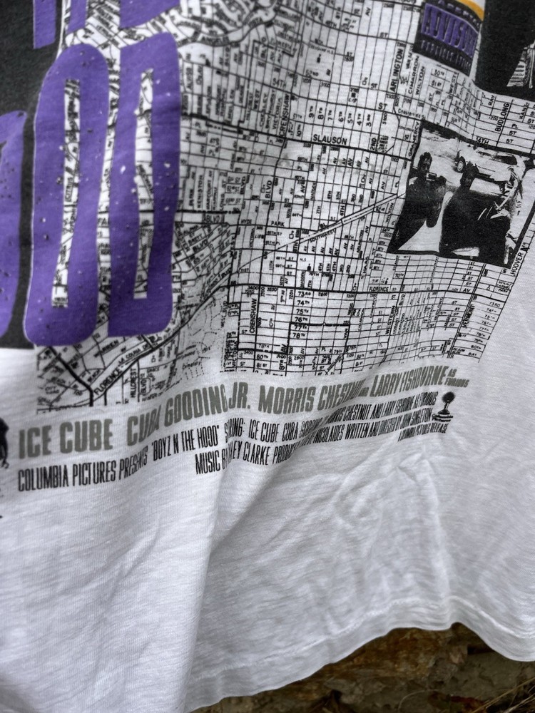 This Vintage 90s Boyz N Tha Hood Movie Promo T-Shirt in size Large features a graphic print design with a crew neck and short sleeves. Made of cotton, this white shirt is machine washable and has a regular fit. The hooded theme adds a unique touch to the movie-inspired piece, making it a stylish choice for fans of 90s music and fashion. Perfect for summer, fall, or spring, this American Vintage branded T-shirt is a must-have for any collector or enthusiast of vintage clothing.