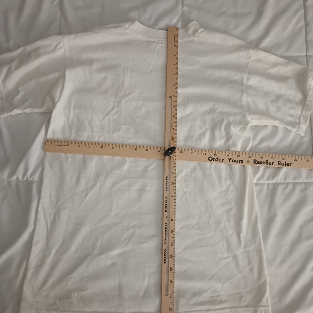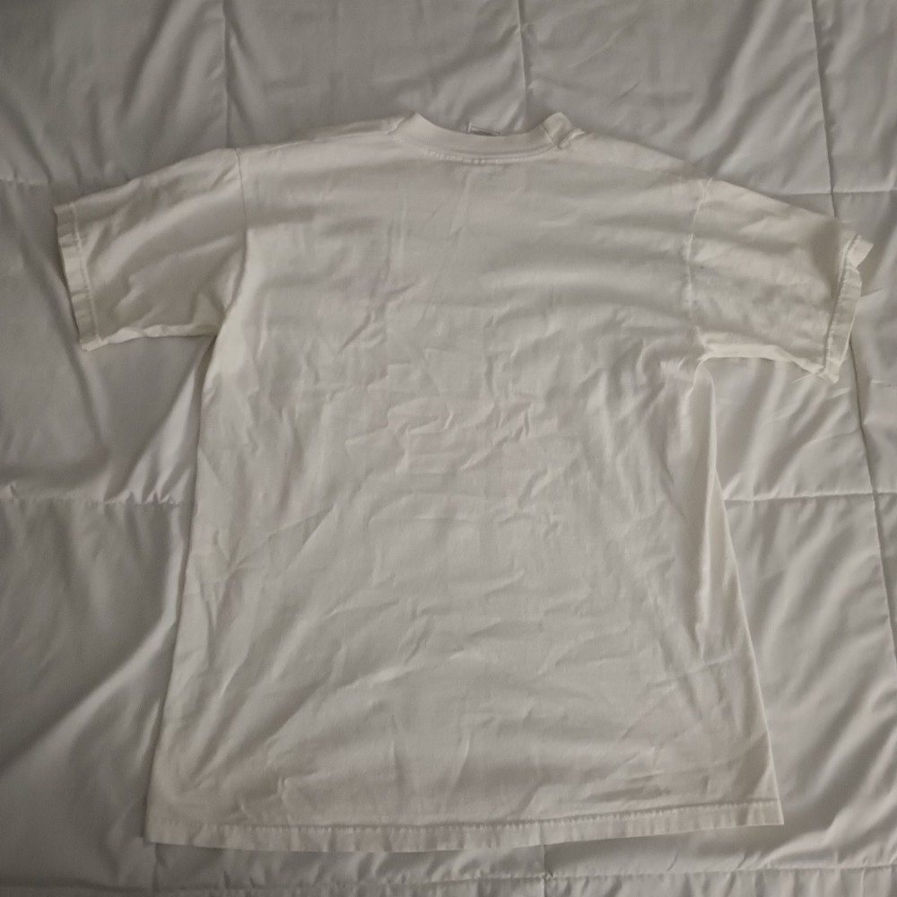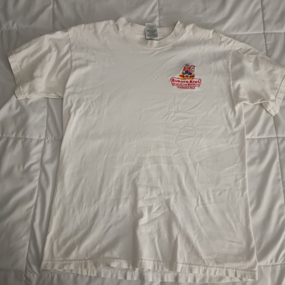 This vintage 90s M & M Burger King promo shirt is a white men's t-shirt in size Medium. It features an embroidered design with a USA theme. Made with high-quality materials, this shirt is a nostalgic piece perfect for those who appreciate 90s fashion and unique accents.