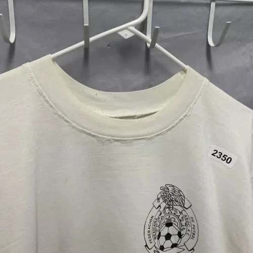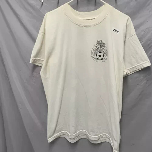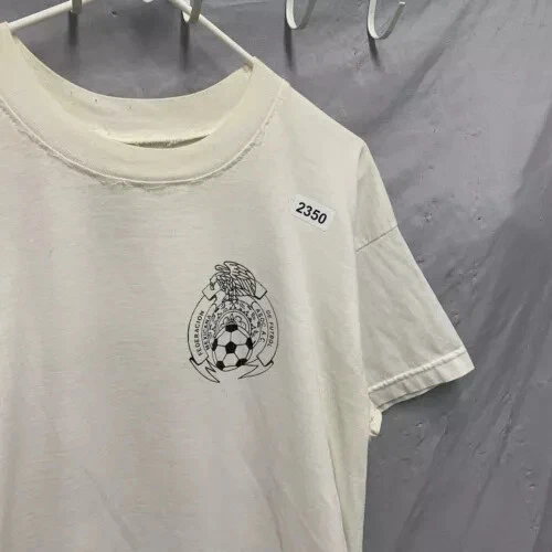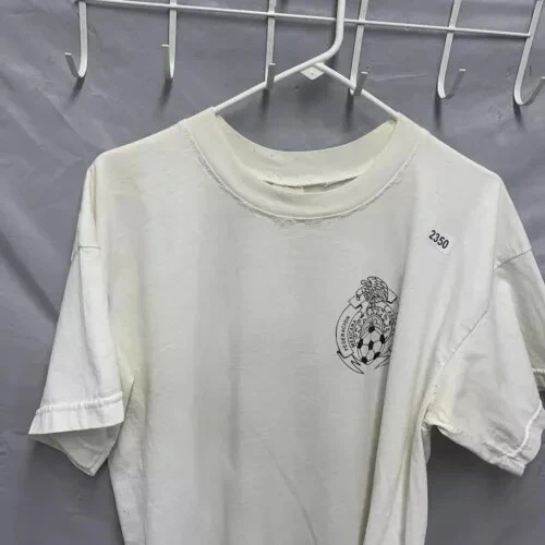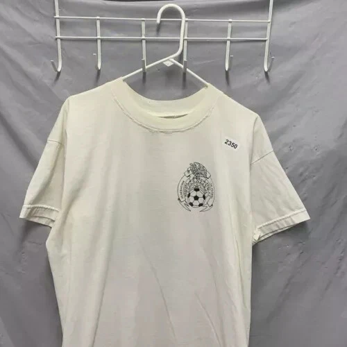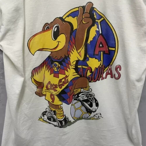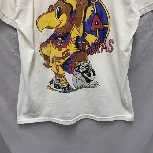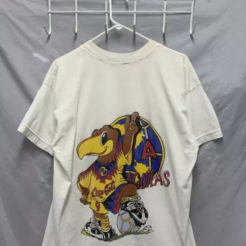 The Vintage 90s Club America Shirt is a rare and unique men's XL white t-shirt with a graphic print of the soccer team. Made of a cotton blend fabric with a crew neck and short sleeves, this shirt features embroidered accents and a button closure. With a regular fit and featuring themes from the 90s, this limited-edition shirt is perfect for all seasons and is designed for comfort and breathability. Handmade in the United States, this shirt is a must-have for any fan of Club America or collectors of vintage sports apparel.
