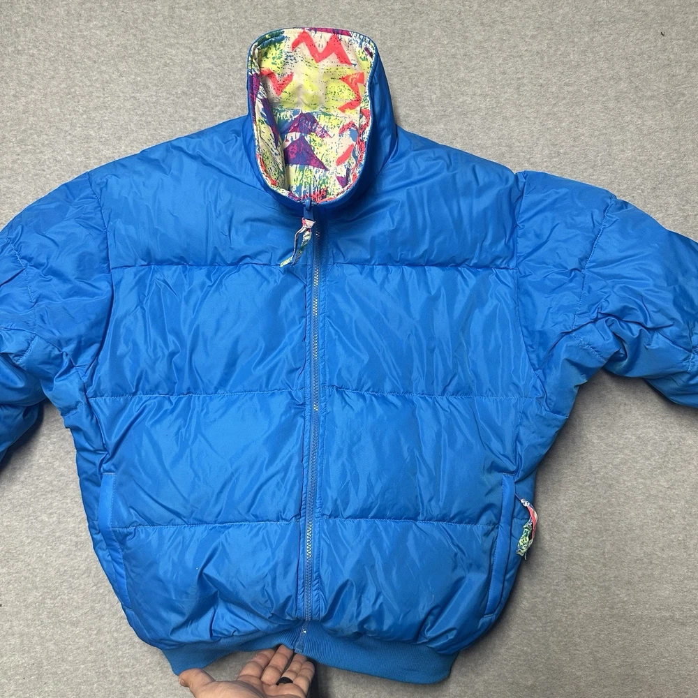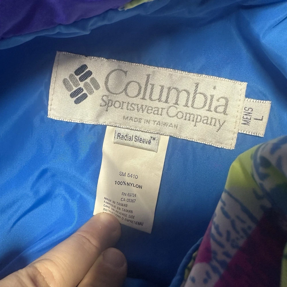 The Vintage Columbia Neon Bugaboo Ski Jacket is a retro piece from the 90s, featuring a colorful multicolor design with a unique radial sleeve and zipper accents. Made from durable nylon, this 3-in-1 jacket is perfect for casual occasions and outdoor activities like skiing and snowboarding. With waterproof features and multiple pockets for convenience, this Columbia Bugaboo Interchange model is a stylish and functional choice for men looking to add a touch of nostalgia to their winter wardrobe. This coat is in great shape and made fully of reflective material. You have the blue coat that lines the purple coat. The coat is reversible to full neon print that you can see in the interior of the coat.