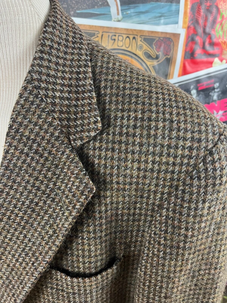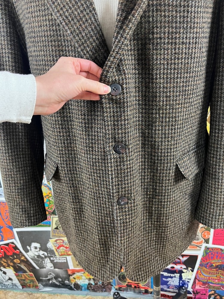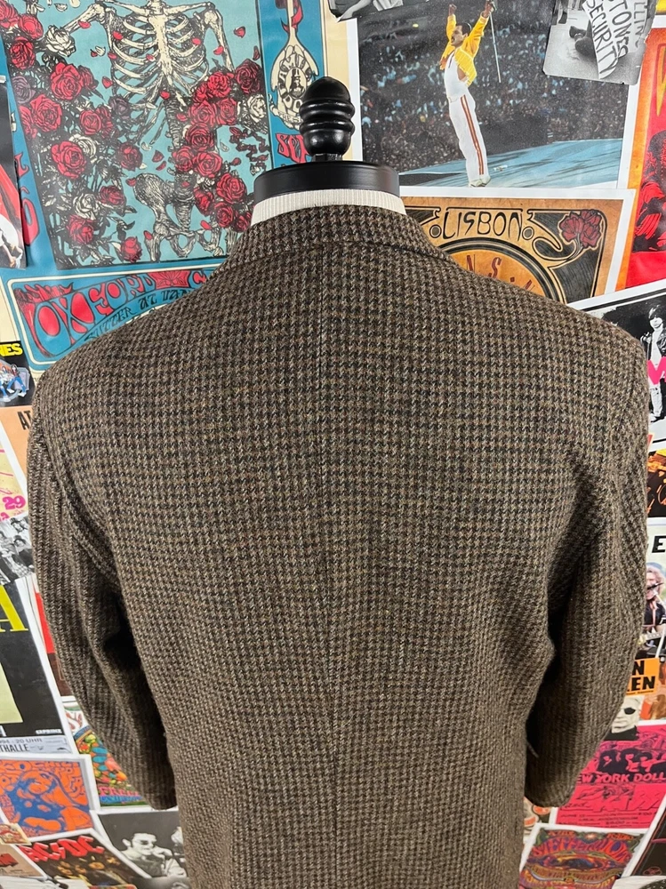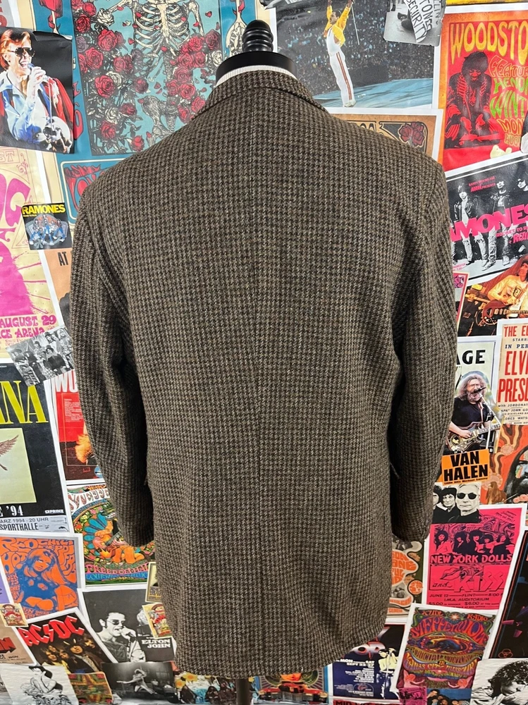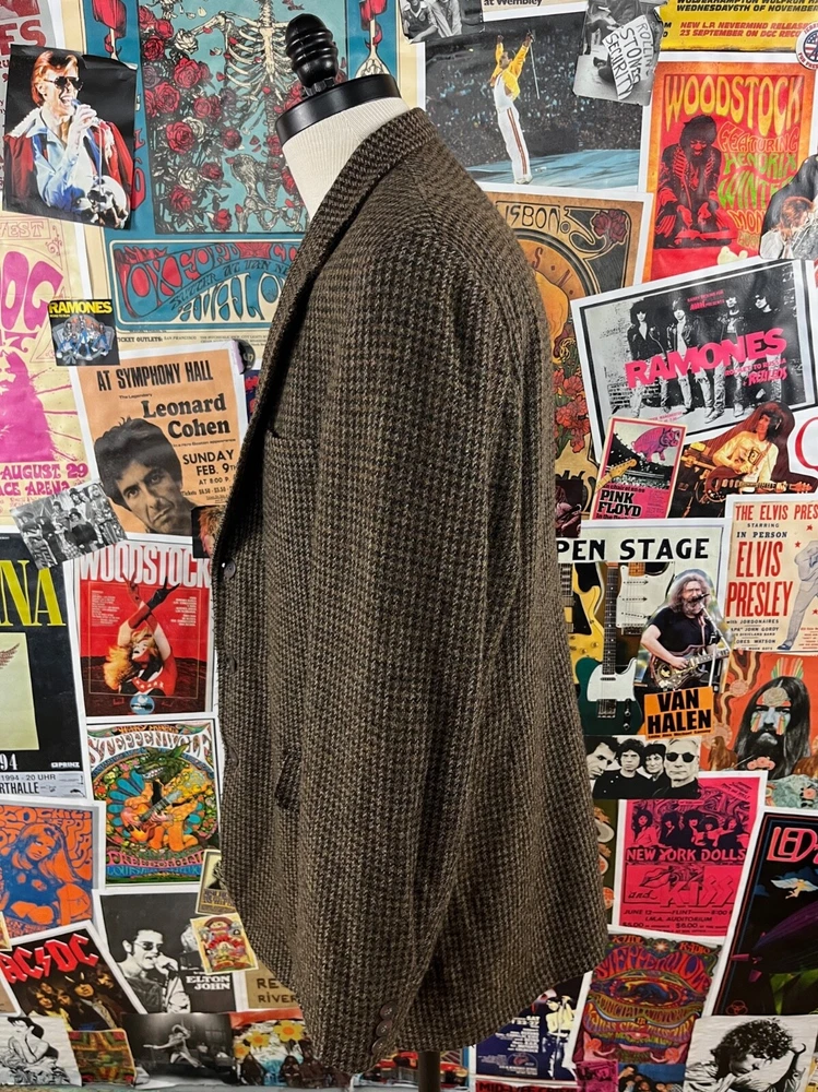 Vintage men's 90s brown tweed houndstooth single breasted sport coat by Haggar. Tagged size 44L. In good, pre-owned condition. Features built in shoulder pads. shoulders -- 20" chest -- 44" waist -- 43" sleeve length from shoulder seam -- 26" bottom of collar to sleeve cuff -- 33" total length -- 33.5" *please note any shipping overages will be refunded