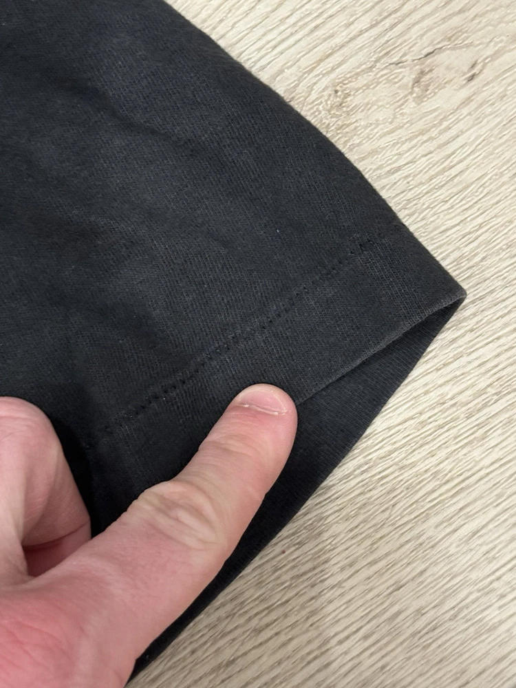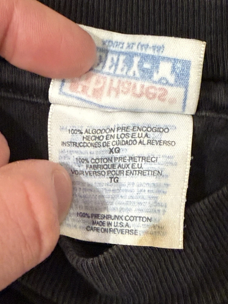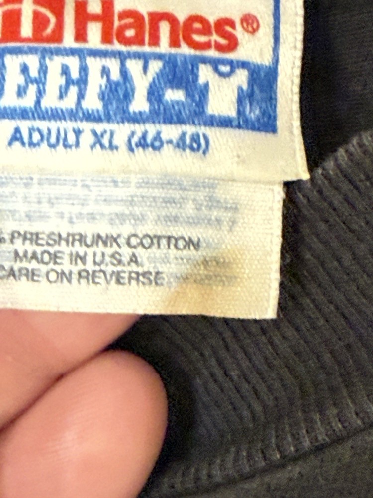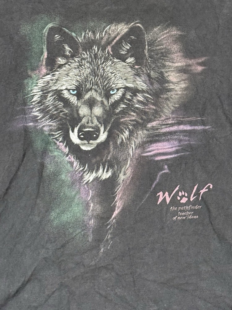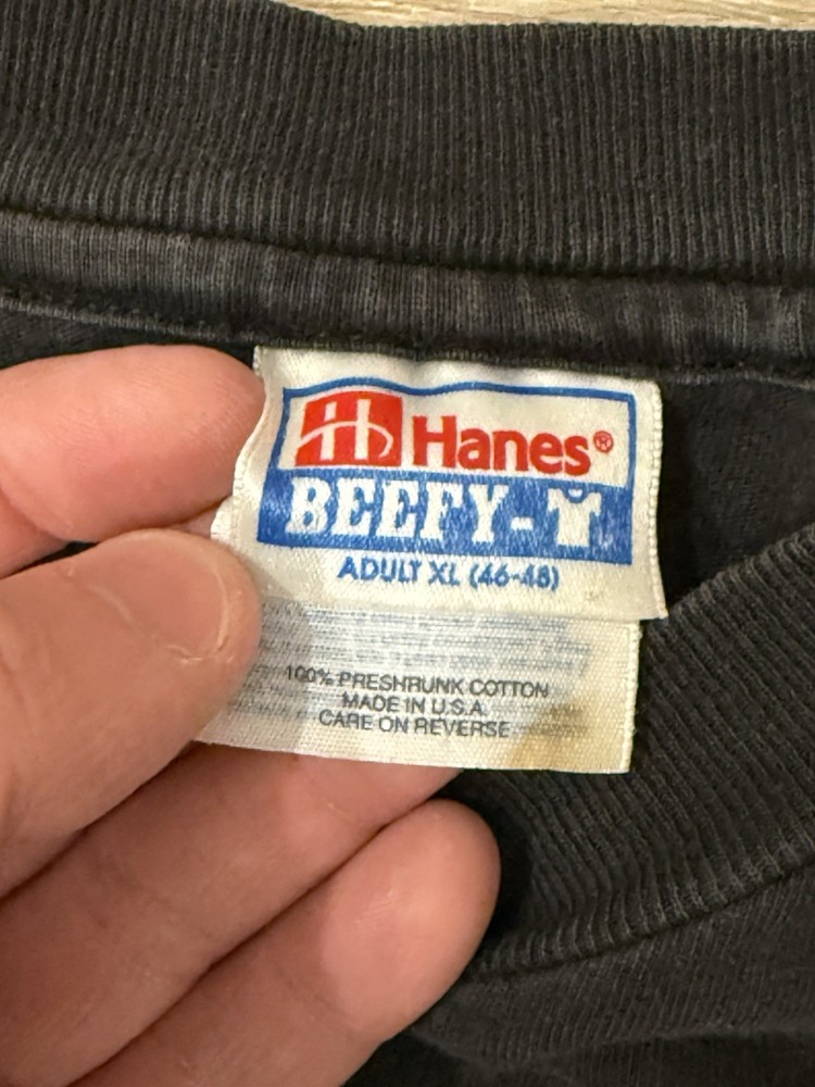 Stain shown on tag. This Vintage 90s Hanes Beefy Wolf Nature Single Stitch Tee in Men's Size XL is a heavyweight, all-season cotton t-shirt with a graphic print of a wolf nature design. The black tee features a crew neck and short sleeves, making it perfect for the summer, fall, and spring seasons. Made in the United States, this regular fit shirt by Hanes is machine washable and easy to care for, with a nostalgic 90s theme that is sure to appeal to nature and animal lovers.