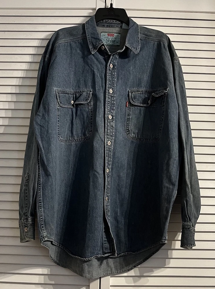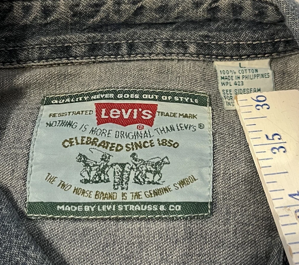 This vintage Levi's Green Label denim shirt is a must-have for any fashion-forward man's wardrobe. With its classic blue color and 90s theme, it's perfect for casual occasions or even a day at the office. The shirt features long sleeves, a button-up design, and is made from high-quality denim fabric that will stand the test of time. The shirt is available in a size L and is perfect for regular-sized men. The red tag Levi's logo adds a touch of authenticity to this vintage piece. Don't miss out on the chance to own a piece of fashion history.