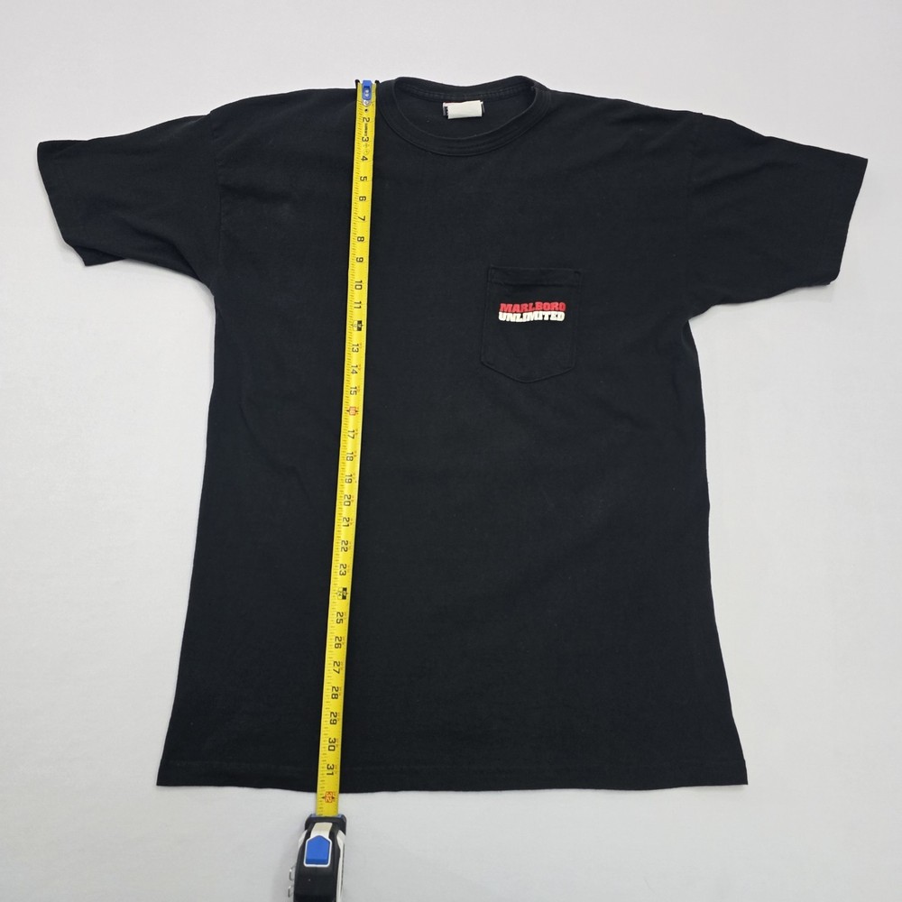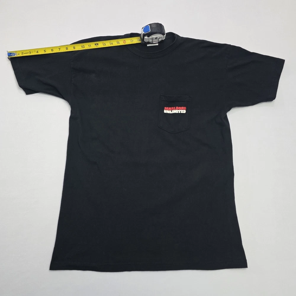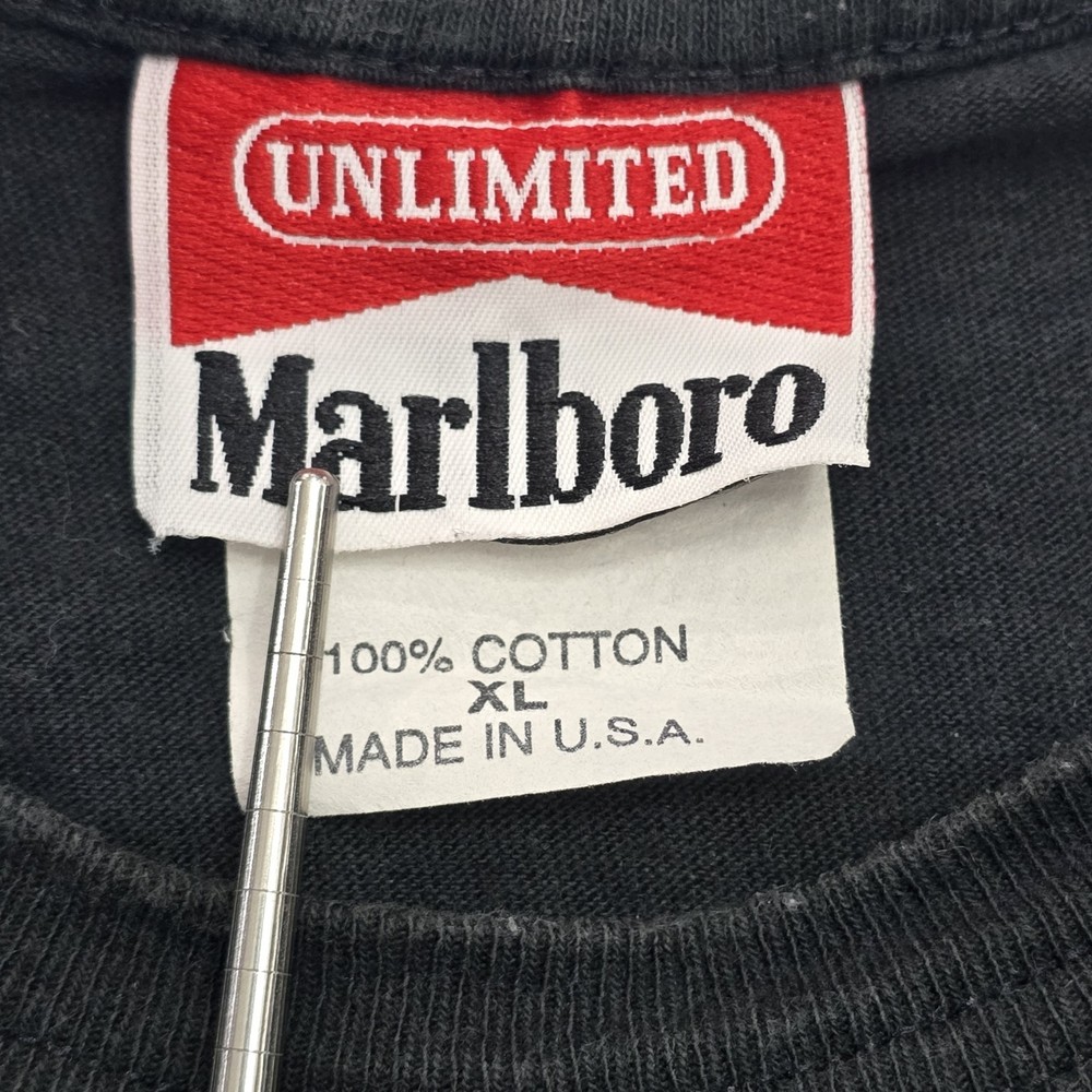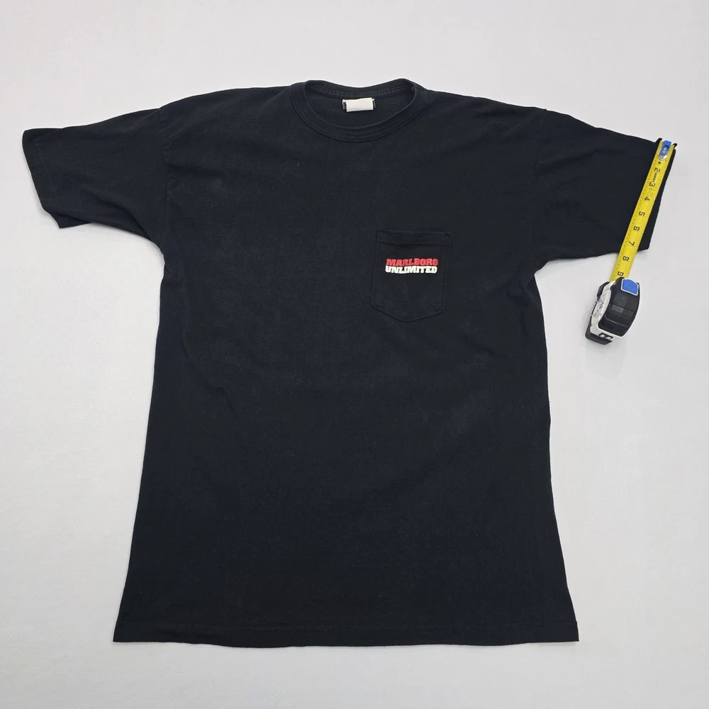 This Vintage 90s Marlboro Unlimited T-Shirt features a unique graphic print with a lizard character, making it a standout piece for collectors and enthusiasts. Made from black cotton knit fabric, this short sleeve shirt is machine washable and has a crew neck neckline. The regular fit and XL size make it comfortable for everyday wear, while the iconic Marlboro logo and USA origin add to its nostalgic appeal. With a classic 90s theme and added pockets for convenience, this t-shirt is a versatile piece that can be styled for any season. See Photos For EXACT Measurements