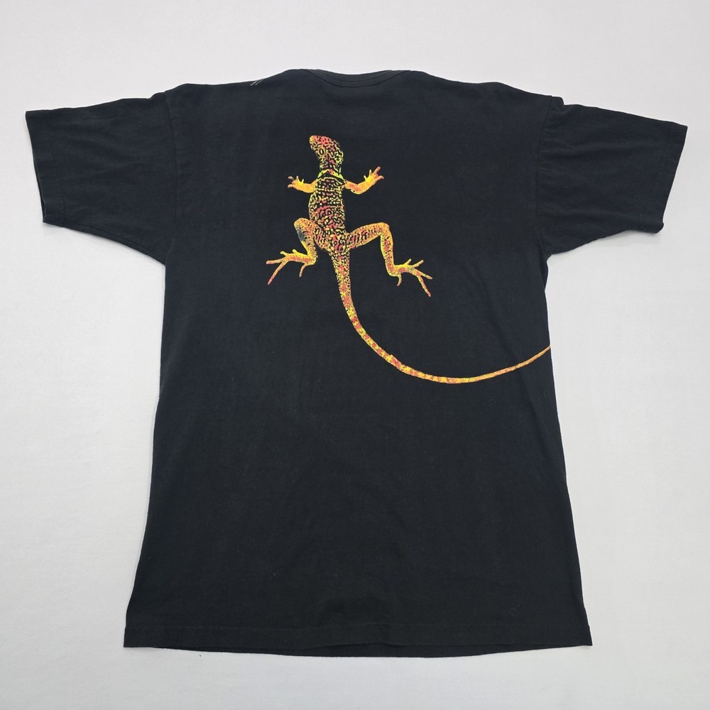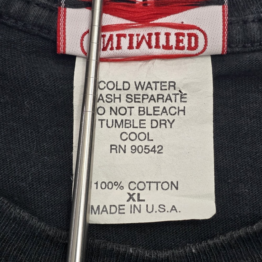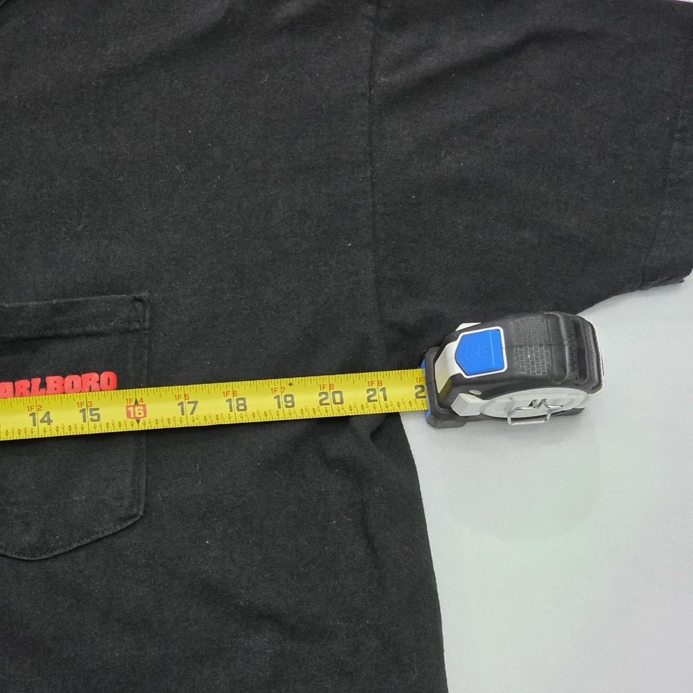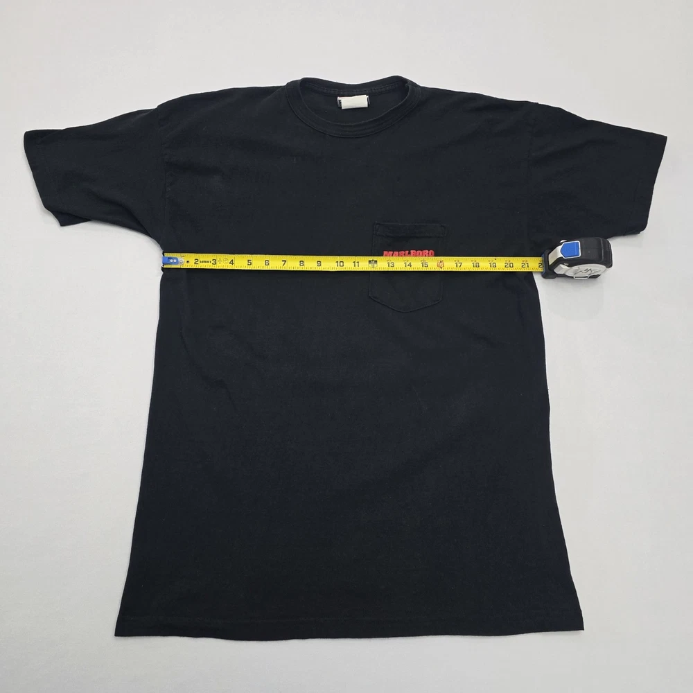 This Vintage 90s Marlboro Unlimited T-Shirt features a unique graphic print with a lizard character, making it a standout piece for collectors and enthusiasts. Made from black cotton knit fabric, this short sleeve shirt is machine washable and has a crew neck neckline. The regular fit and XL size make it comfortable for everyday wear, while the iconic Marlboro logo and USA origin add to its nostalgic appeal. With a classic 90s theme and added pockets for convenience, this t-shirt is a versatile piece that can be styled for any season. See Photos For EXACT Measurements