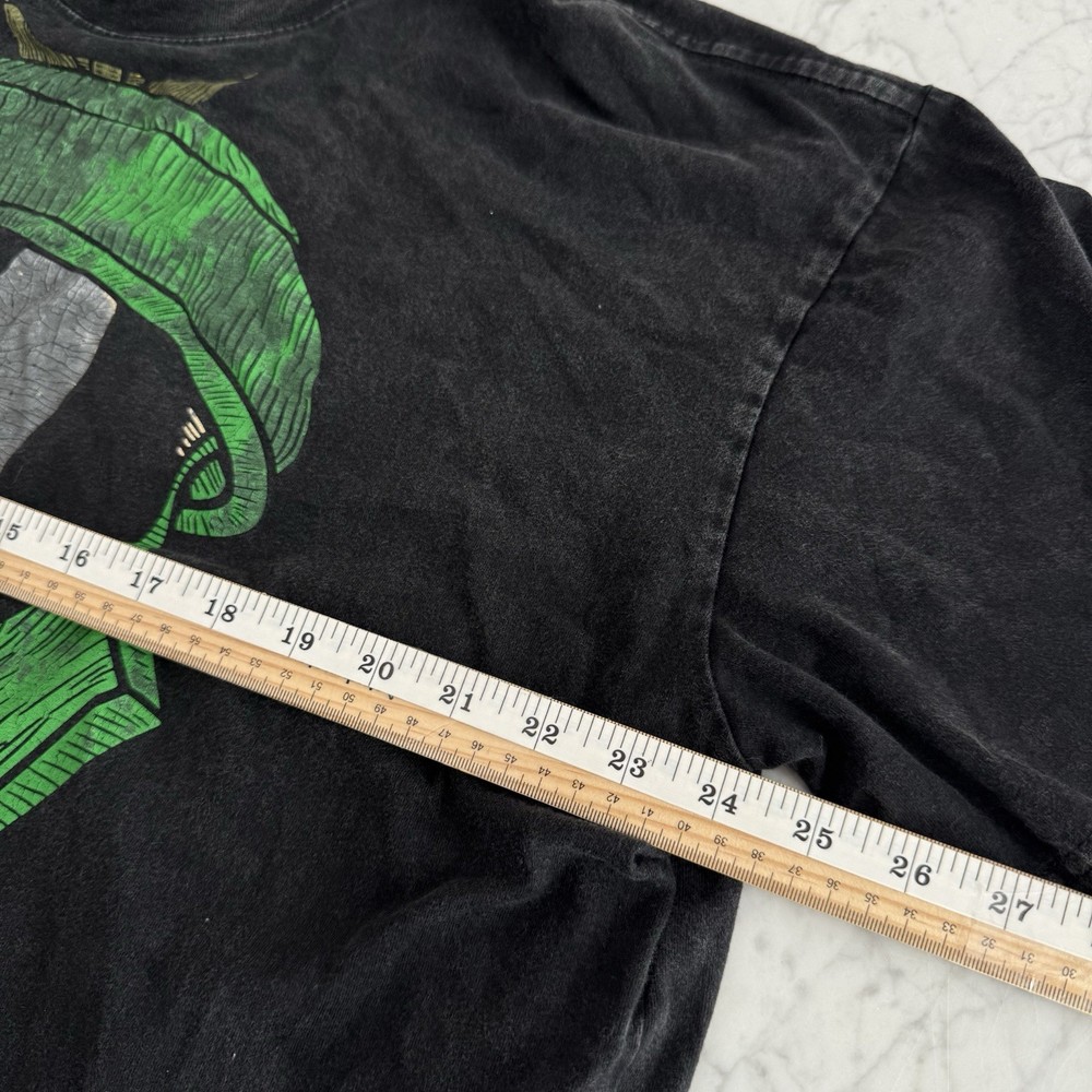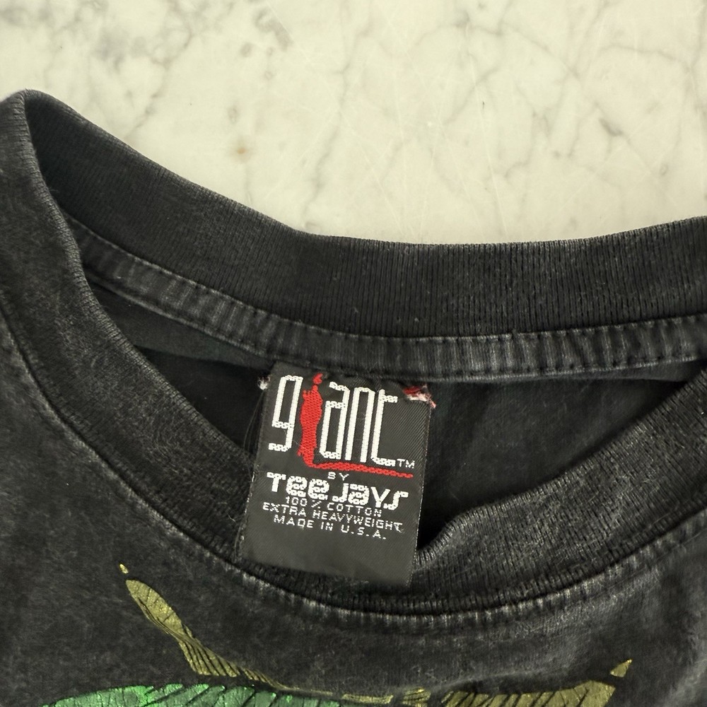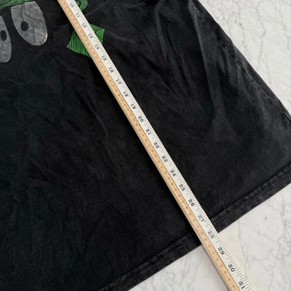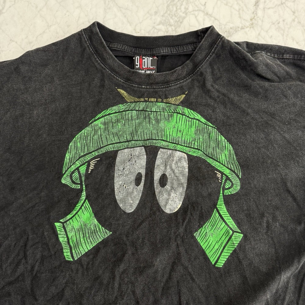 original 1990s Marvin the Martian tee printed on the iconic Giant by Tee Jays tag — 100% cotton, heavyweight, and made in the USA. Features a vintage fade front graphic with Marvin’s helmet in bright green on a perfectly worn black wash. True vintage Looney Tunes piece, not a modern reprint. Measurements (laid flat): • Chest (pit to pit): 22.5” / 57 cm • Length (collar to hem): 29” / 74 cm Soft, heavyweight feel with natural fading for authentic vintage character.