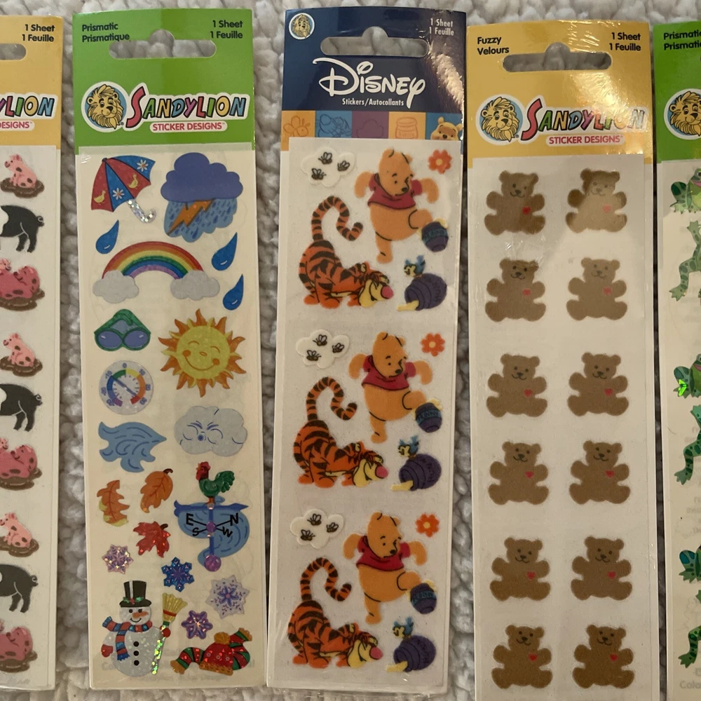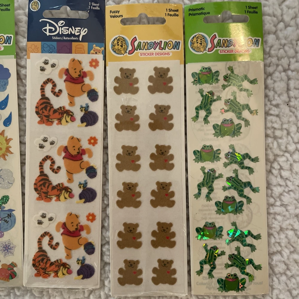 This is a lot of 7 vintage 90s Sandylion stickers, perfect for scrapbooking or collecting. The stickers feature a Prizmatic, Fuzzy, and Rare design, perfect for adding a unique touch to any project. The brand is Sandylion and the stickers are a great way to add some nostalgia to your crafts. These stickers are perfect for anyone interested in history and want to add a retro touch to their scrapbook or collection. Happy Birthday Frogs Disney Winnie the Pooh and Tiger Bears Hands