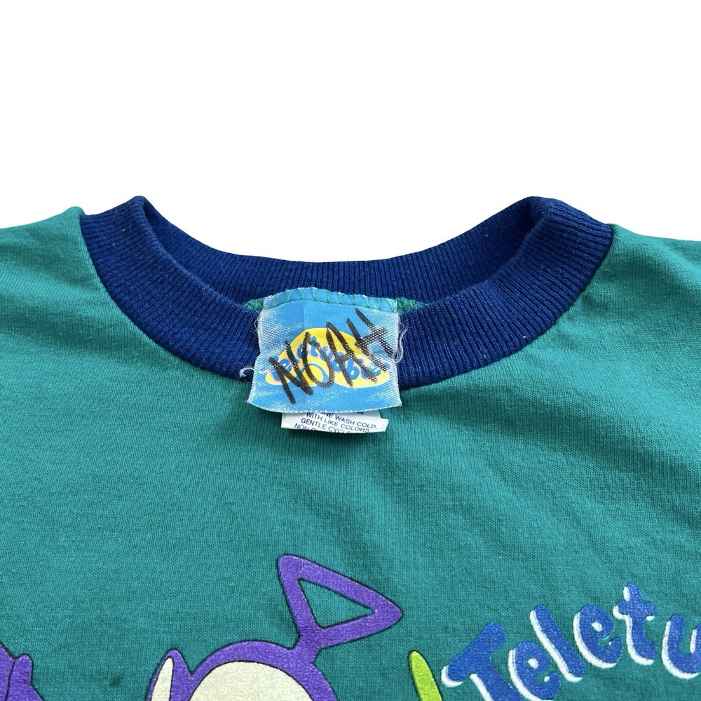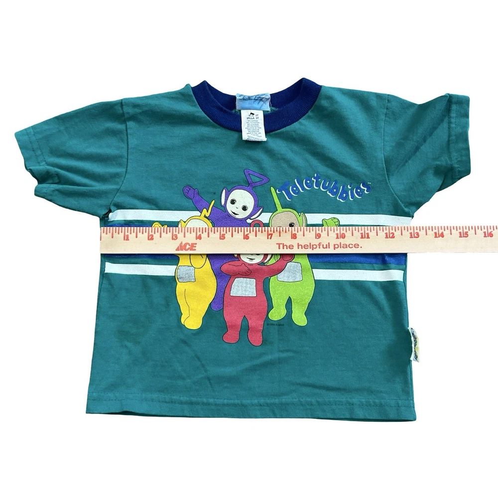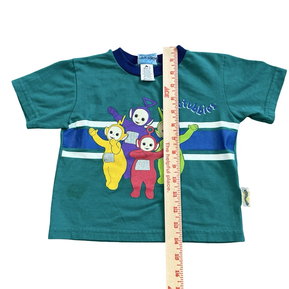 Brand: Teletubbies Style: Ringer T-Shirt, green body with navy crew neck and blue/white chest stripes Size: tag reads 3T Material: 50% Cotton, 50% Polyester (exclusive of trim) Details: Short sleeve toddler tee with full front graphic print of Teletubbies characters Tinky Winky, Dipsy, Laa-Laa and Po Tag text (as shown): 3T / TALLA 3T / 50% COTTON / 50% POLYESTER / 50% ALGODON / 50% POLIESTER / EXCLUSIVE OF TRIM / MADE IN THE USA / MACHINE WASH COLD / WASH WITH LIKE COLORS / GENTLE CYCLE Made in the USA Keywords: Teletubbies shirt, boys 3T, green ringer tee, toddler graphic, Tinky Winky Dipsy Laa-Laa Po