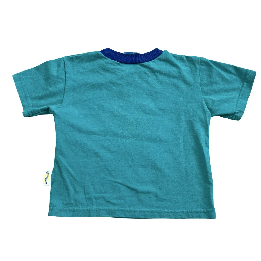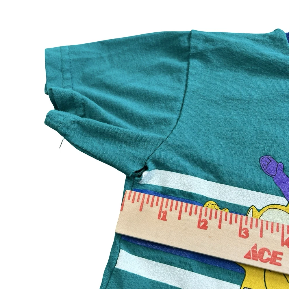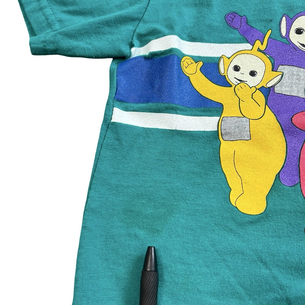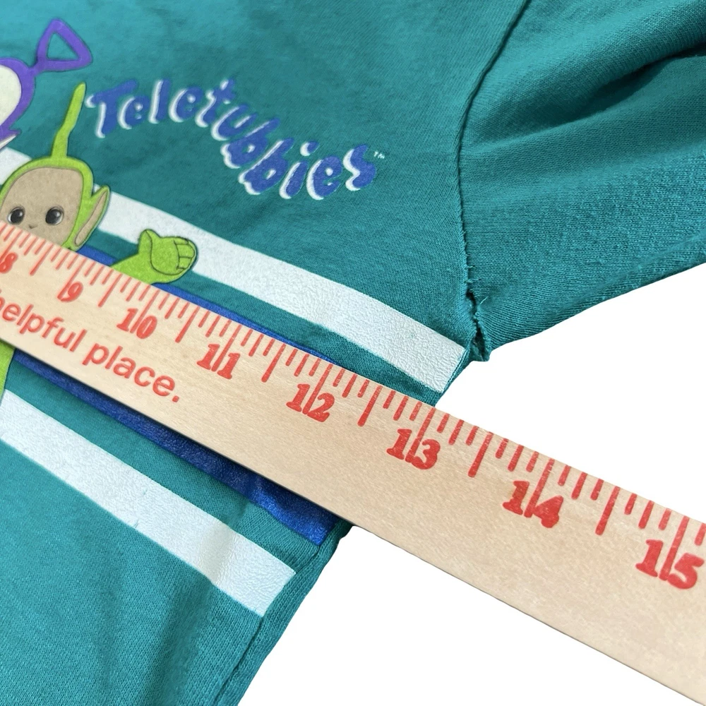 Brand: Teletubbies Style: Ringer T-Shirt, green body with navy crew neck and blue/white chest stripes Size: tag reads 3T Material: 50% Cotton, 50% Polyester (exclusive of trim) Details: Short sleeve toddler tee with full front graphic print of Teletubbies characters Tinky Winky, Dipsy, Laa-Laa and Po Tag text (as shown): 3T / TALLA 3T / 50% COTTON / 50% POLYESTER / 50% ALGODON / 50% POLIESTER / EXCLUSIVE OF TRIM / MADE IN THE USA / MACHINE WASH COLD / WASH WITH LIKE COLORS / GENTLE CYCLE Made in the USA Keywords: Teletubbies shirt, boys 3T, green ringer tee, toddler graphic, Tinky Winky Dipsy Laa-Laa Po