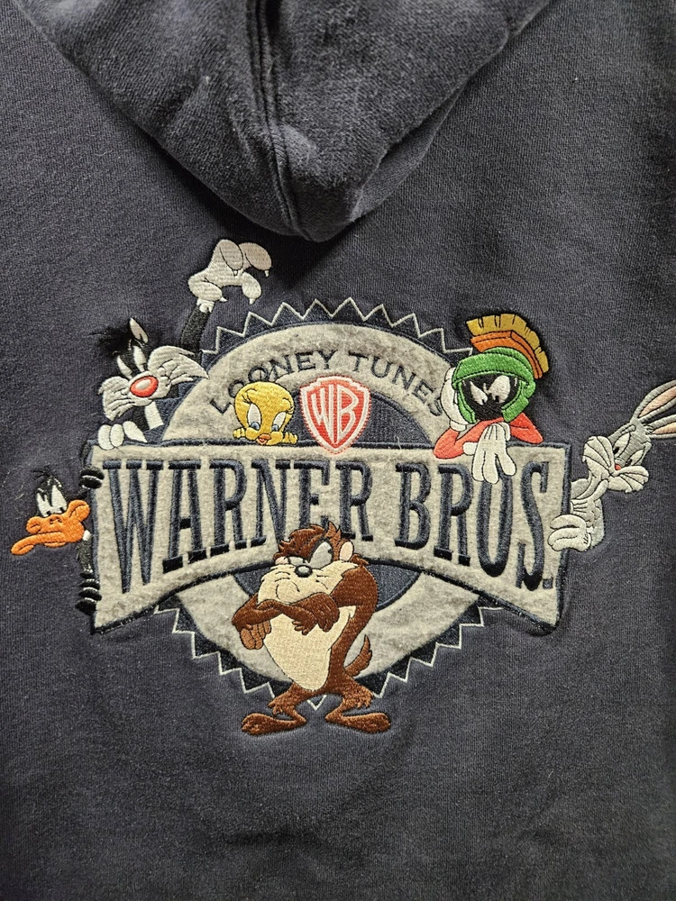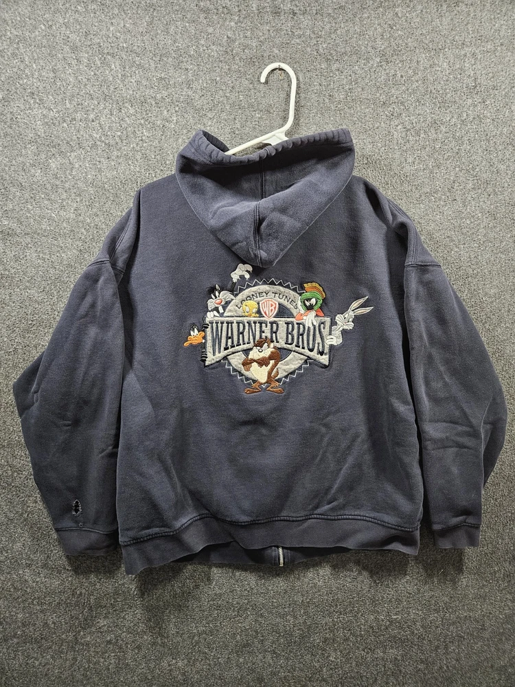Brand: Warner Bros. Department: Men Closure: Zip Features: Hooded, Pockets Size: XL Style: Full Zip Type: Hoodie Size Type: Regular Accents: Embroidered Vintage: Yes Sleeve Length: Long Sleeve Color: Blue Theme: 90s, Cartoon