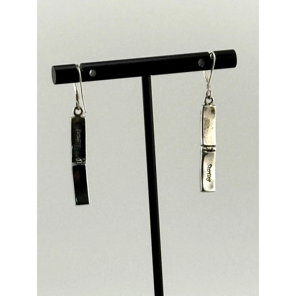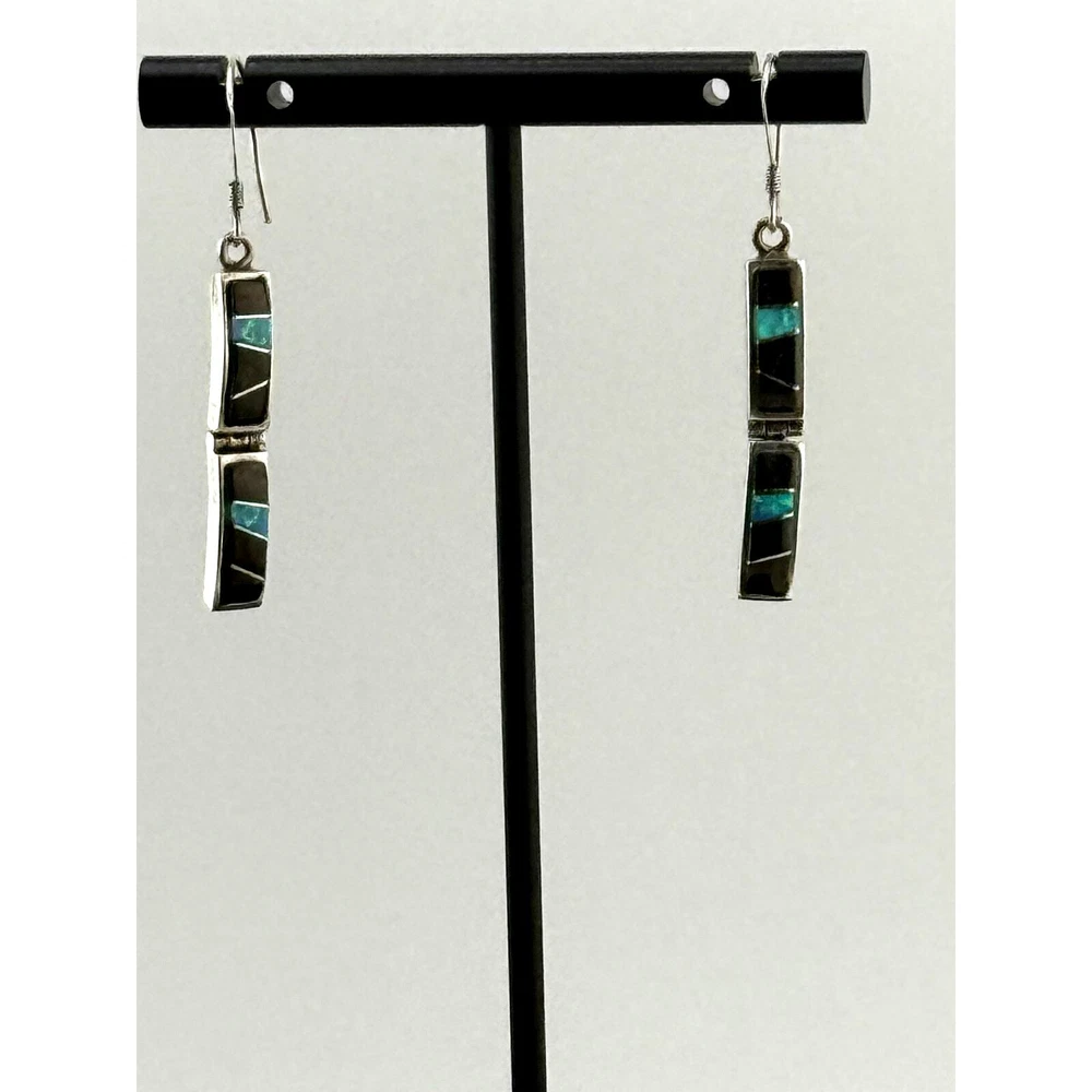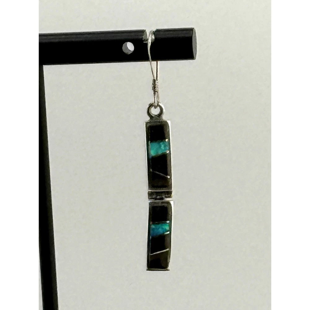 Gorgeous fire opals in black onyx. Rectangles are articulated on each earring and measure 1.75 inches by 0.25 inches. Beautiful pair for your collection.