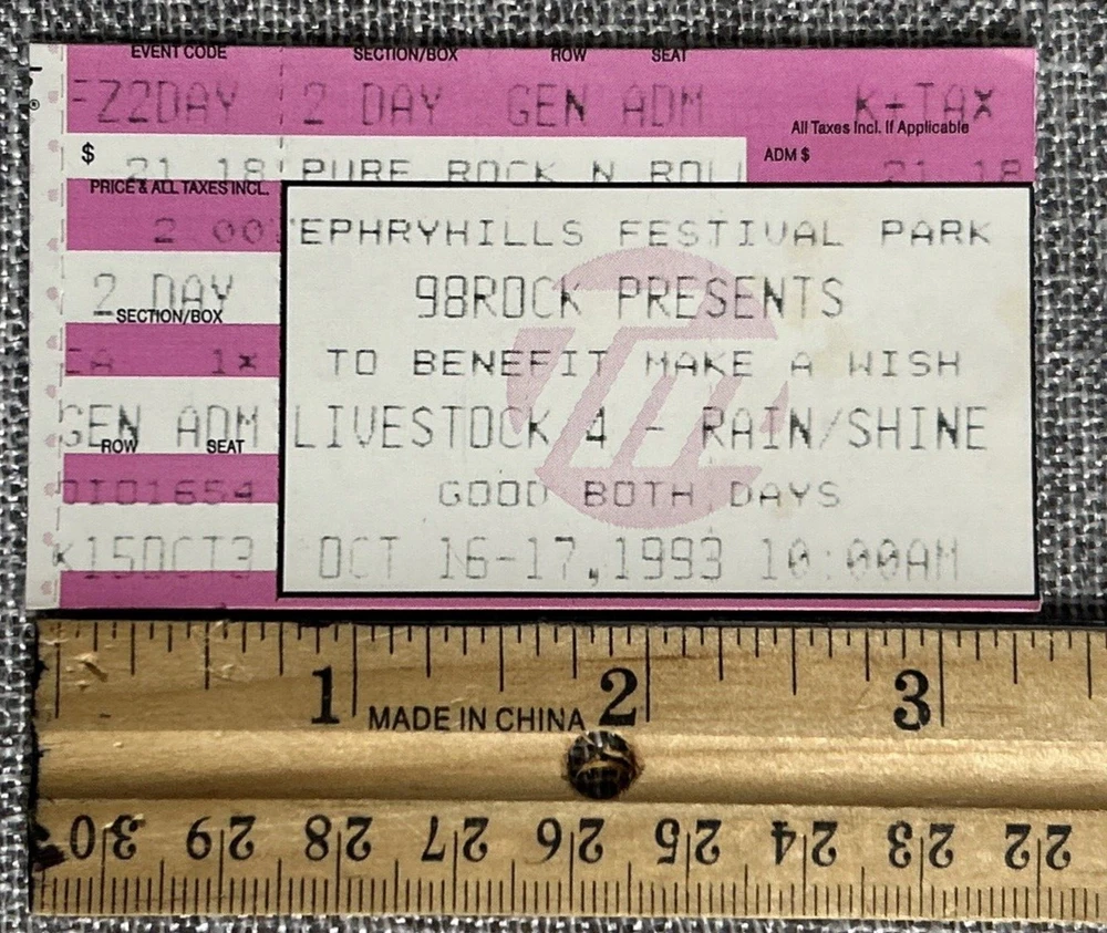 Vintage 98 Rock Presents Livestock 4 Concert Ticket Stub 10/16-17/93 Zephyrhills Florida Freaks Rule, Colorblind, Pride, Green Apple Quick Step, Forget the Name, Lillian Axe, Eric Gales Band, Nudeswirl, Animal Bag, Saigon Kick, I Mother Earth, Anthrax, Eyewitness, Here Comes Rusty, Screamin' Cheetah Wheelies, Candlebox, John Kay & Steppenwolf. Pre-Owned - Please see Pictures for Details