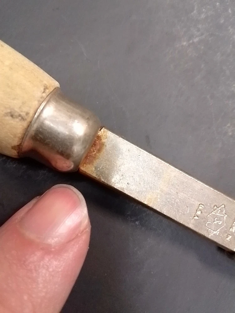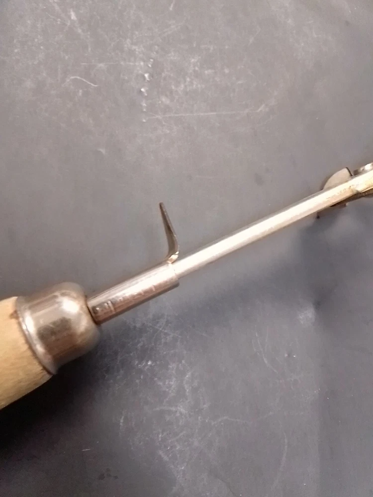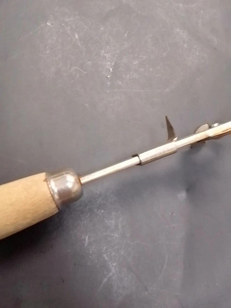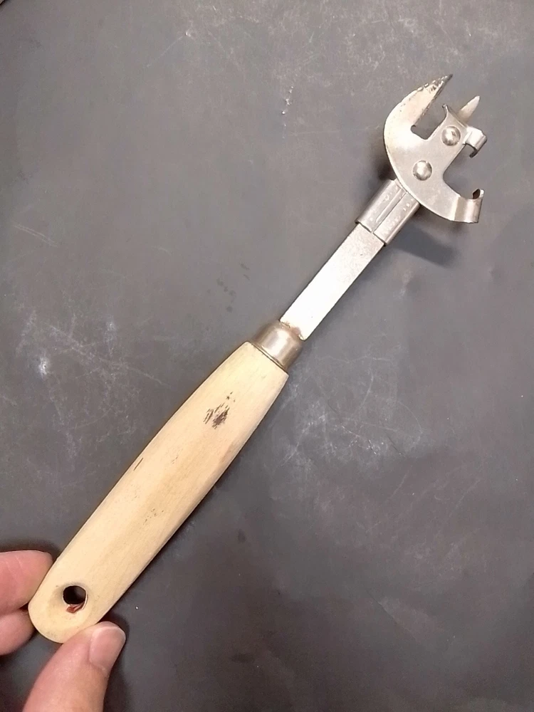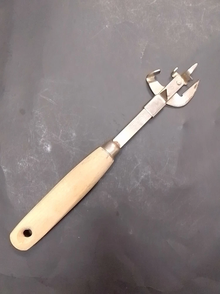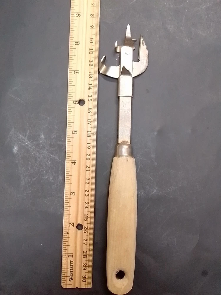 Vintage A&J Can Opener Tool Kitchen Utensil Steel Tempered USA wood handle Blade