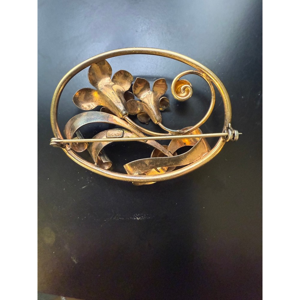 Gorgeous 12K (stamped) gold filled on silver brooch elaborately shaped flowers and bowtie. Amazing detail on this piece. Measures approx. 2.25 inches by 1.8 inches. A beautiful wearable artwork. Makers initials stamped "A&Z".