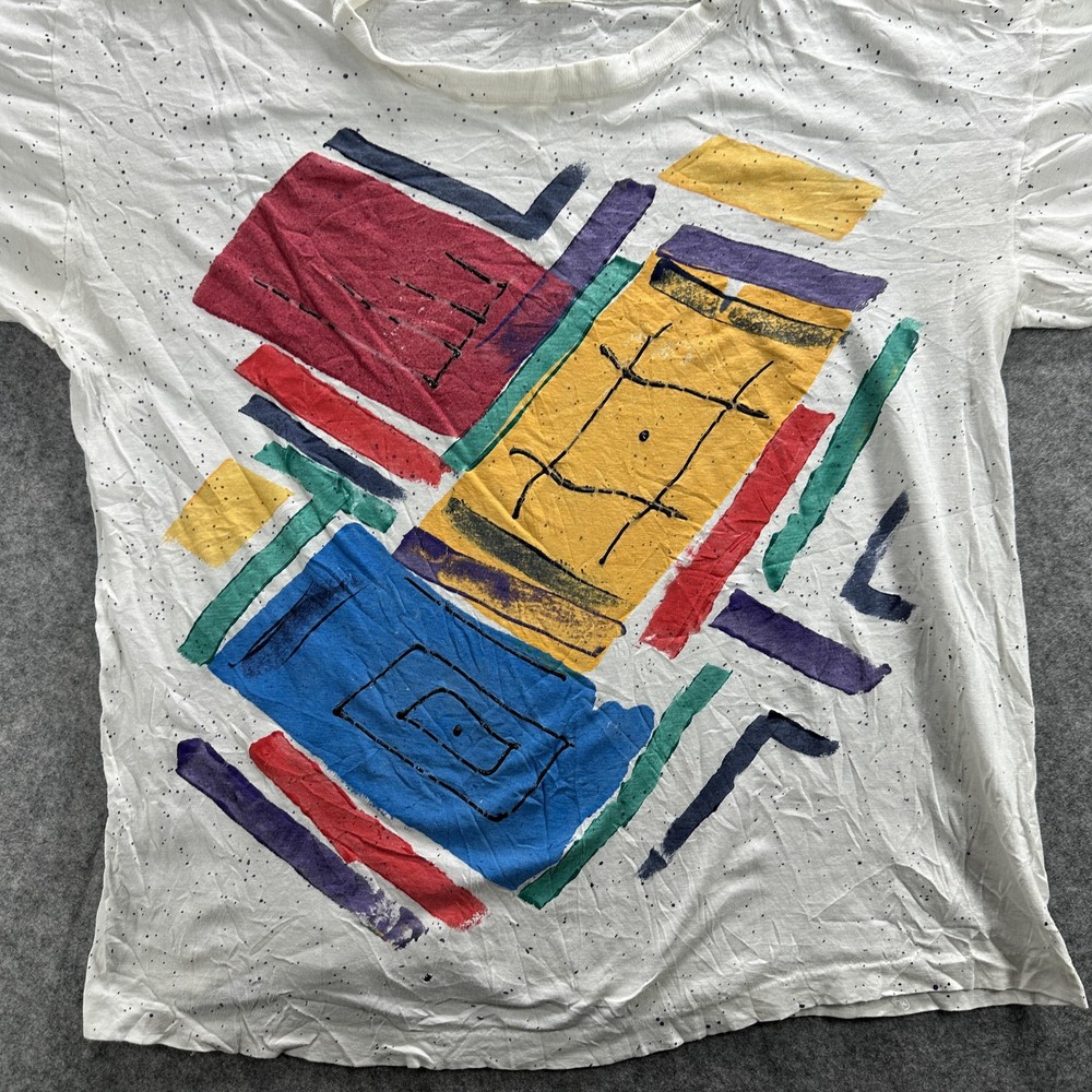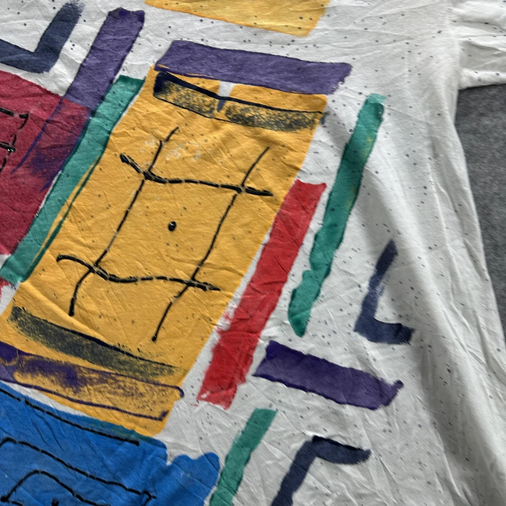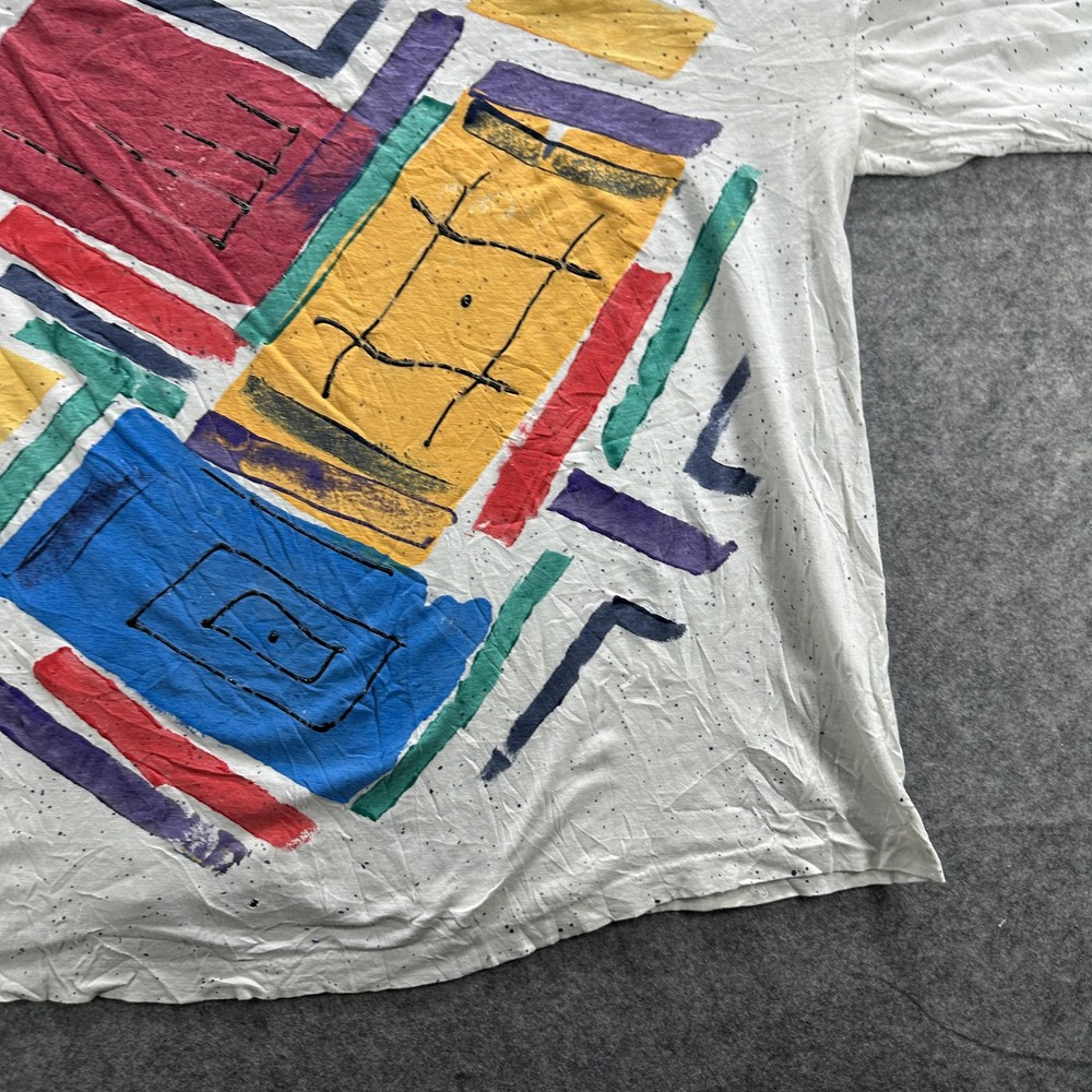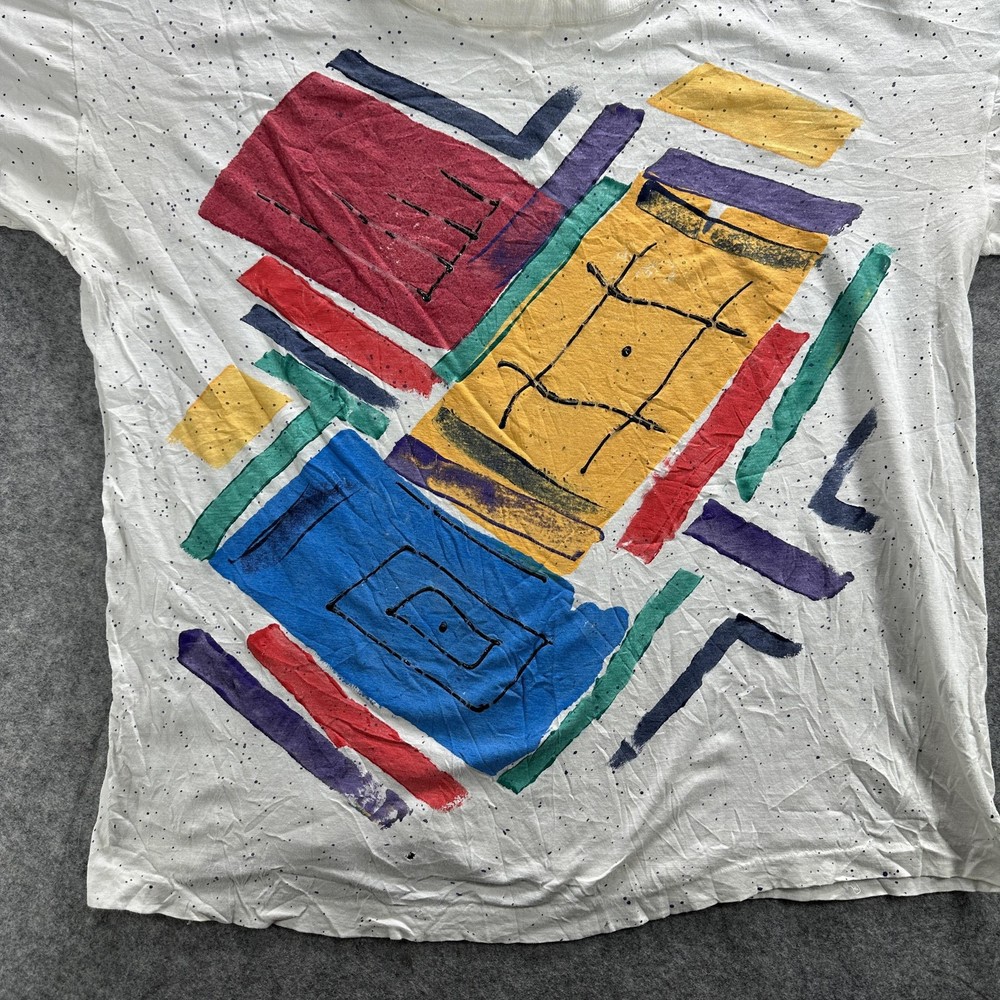 Vintage Abstract Art Shirt Mens Large White 90s Colorful Graphic Paint Splatter Tee Condition: Fair vintage condition with moderate wear. Shirt is wrinkled and has some minor signs of age related wear throughout. Small hole noted near hem (see photo). Print retains vibrant multi-color design, some minor cracking and fading visible on graphic. Material tag is missing and brand label is completely unreadable; feels like soft cotton or cotton blend. No sizing tag; based on provided measurements and overall cut, fits like a Mens Large. Please refer to measurements for accurate fit. Features a bold geometric abstract graphic print with red, yellow, blue, green, and purple blocks and black line detail. Classic 90s paint splatter effect on a white background. Single stitch vintage construction. Short sleeves. Crew neck. No visible brand or logo information. Tag size: Not visible, fits like Mens Large (see measurement photos) Measurements and photos provided for reference. Made in unknown country. Great piece for collectors of vintage abstract or 90s art shirts.
