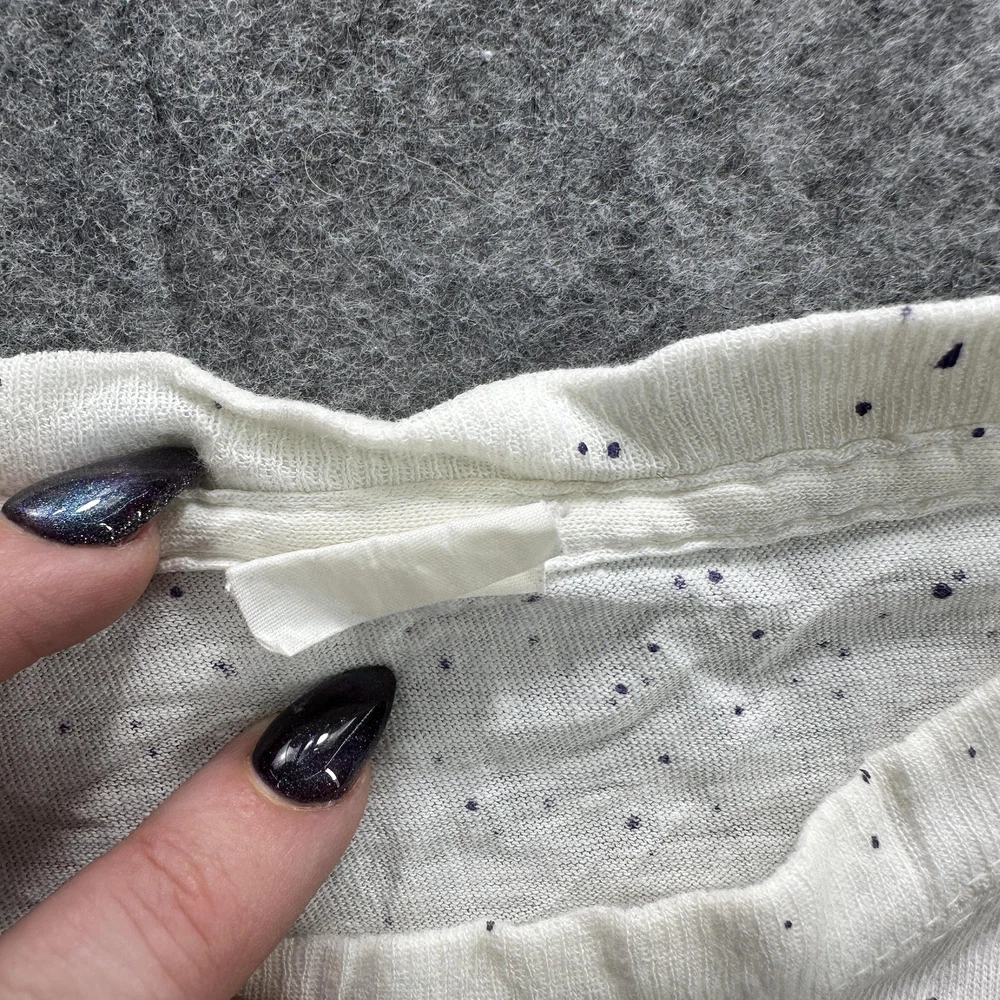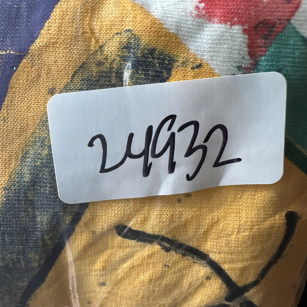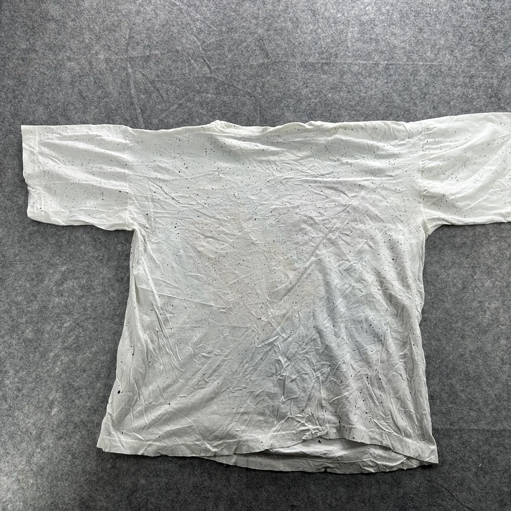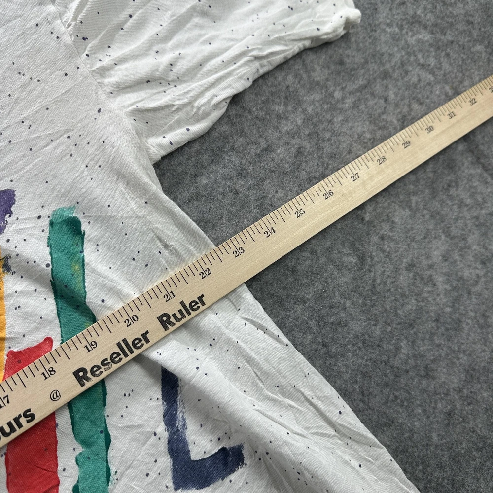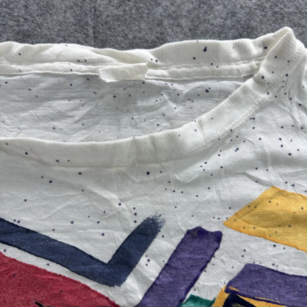 Vintage Abstract Art Shirt Mens Large White 90s Colorful Graphic Paint Splatter Tee Condition: Fair vintage condition with moderate wear. Shirt is wrinkled and has some minor signs of age related wear throughout. Small hole noted near hem (see photo). Print retains vibrant multi-color design, some minor cracking and fading visible on graphic. Material tag is missing and brand label is completely unreadable; feels like soft cotton or cotton blend. No sizing tag; based on provided measurements and overall cut, fits like a Mens Large. Please refer to measurements for accurate fit. Features a bold geometric abstract graphic print with red, yellow, blue, green, and purple blocks and black line detail. Classic 90s paint splatter effect on a white background. Single stitch vintage construction. Short sleeves. Crew neck. No visible brand or logo information. Tag size: Not visible, fits like Mens Large (see measurement photos) Measurements and photos provided for reference. Made in unknown country. Great piece for collectors of vintage abstract or 90s art shirts.