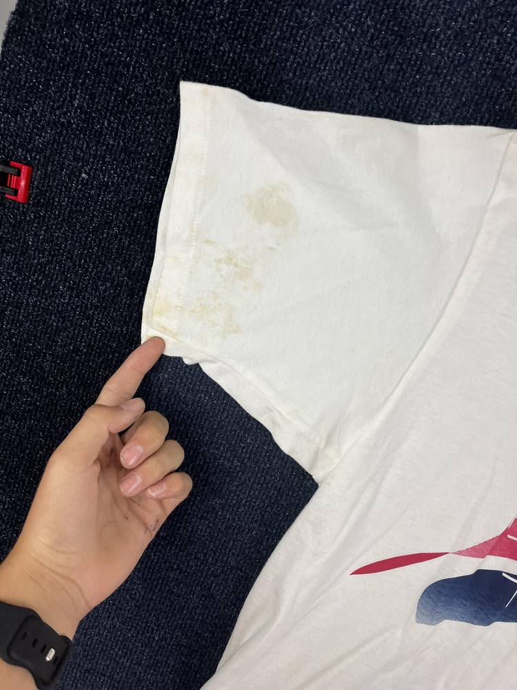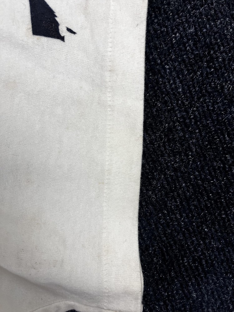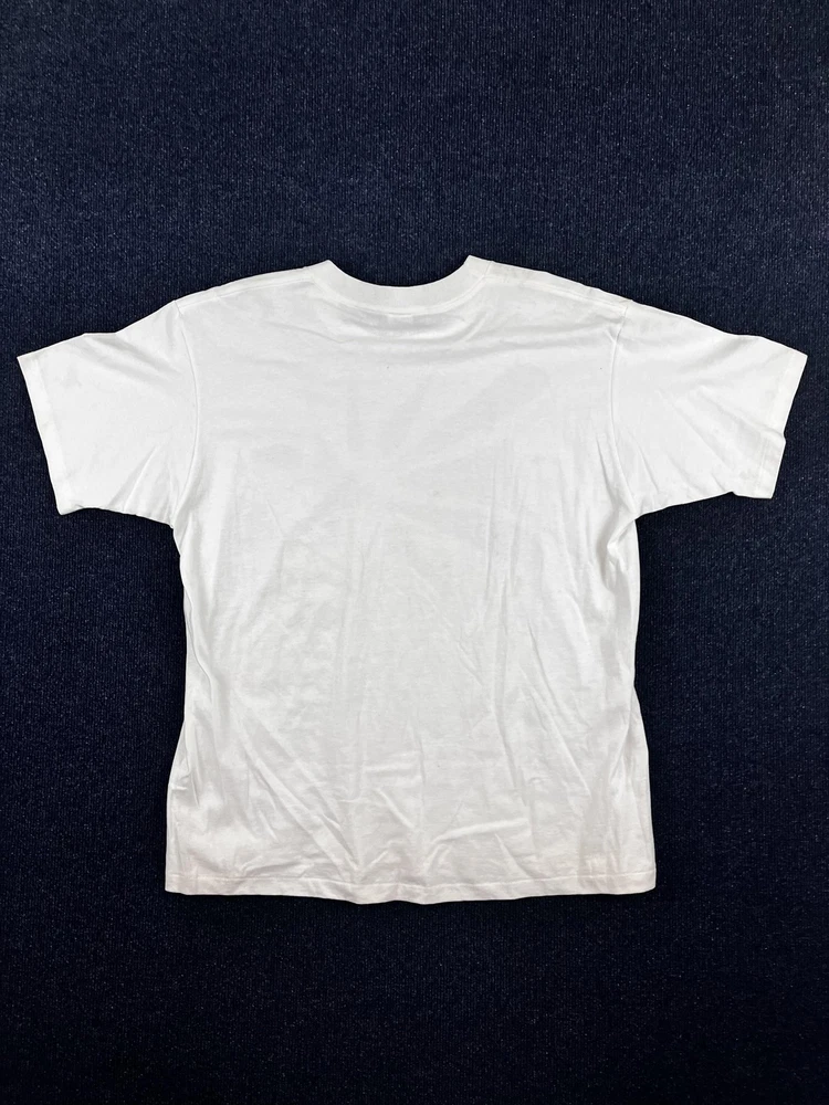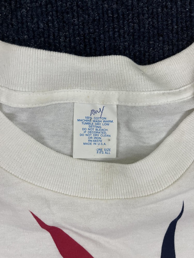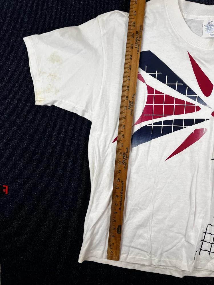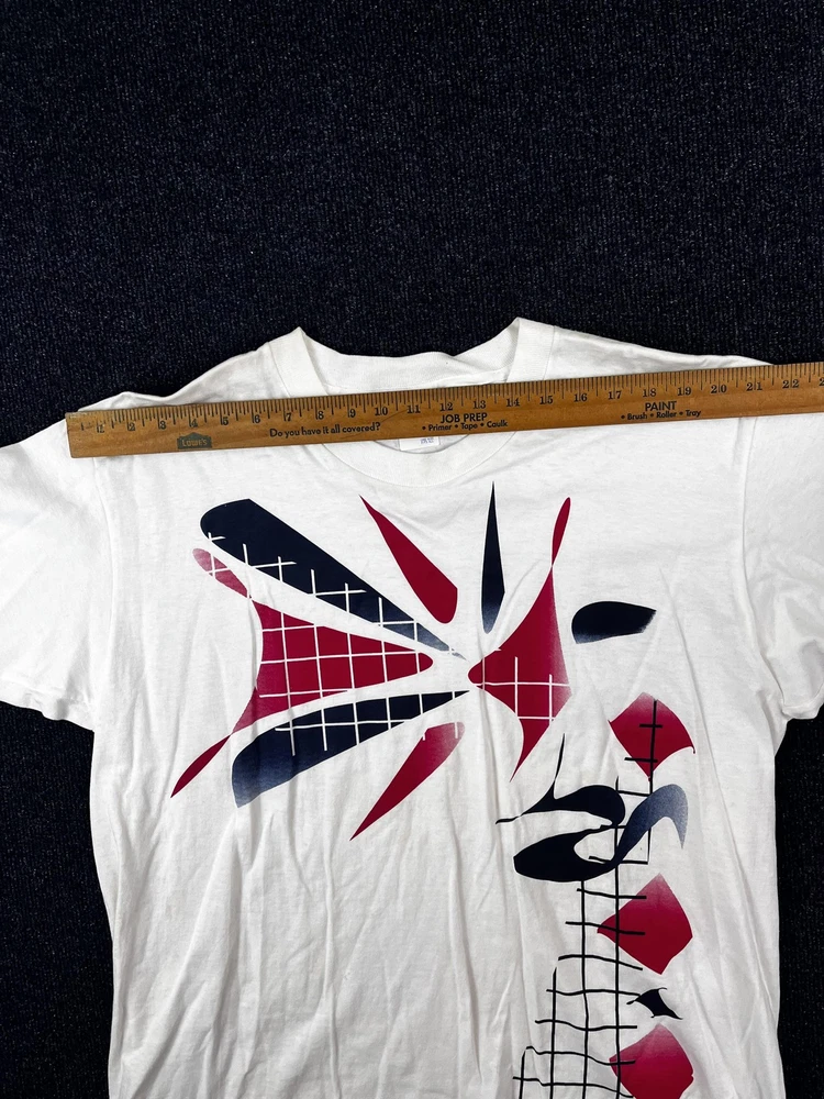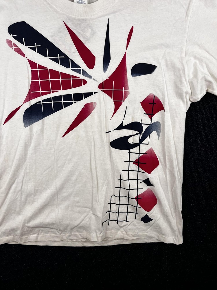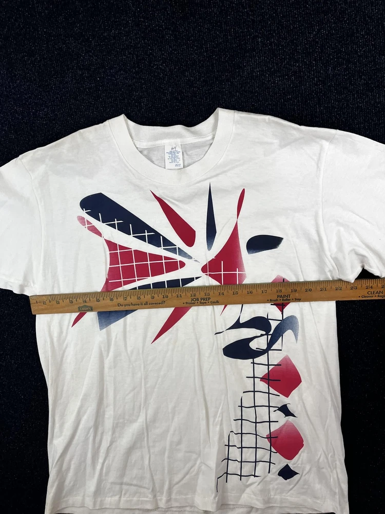 Vintage Abstract Graphic Shirt Mens One Size White Red Blue Geometric Art 90s USA Condition: Fair used vintage condition. Noticeable discoloration/stains on the left sleeve as shown in photos. Minor marks near other seams, see close-ups for detail. No holes or major structural damage. Made in USA. 100% cotton material, as stated on the garment tag. Features a bold 90s geometric abstract graphic in red, blue, and black across the front. Print features crisscross grid patterns and dynamic retro shapes, true to the era. Tag reads "One Size Fits All". Please refer to measurements for best fit. (Pit to pit approximately 22"; Length from collar to hem about 27"). No branding present on tag or artwork, classic unbranded vintage tee style. Back is plain white with no graphic. Crewneck with short sleeves, boxy 90s vintage fit. Excellent 90s collectible statement piece or wearable art. Made in USA