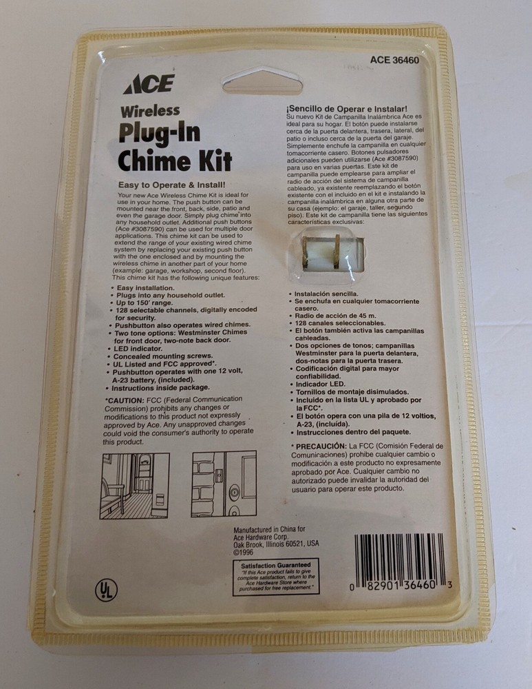 Vintage 1996 Ace Wireless Plug-in Door Chime Kit #36460 Brand New in Original Packaging ***Plastic is a little bit dented, but item has never been opened and is completely sealed.*** 12 Volt A-23 Battery Supplied Ships the next day after receiving payment.