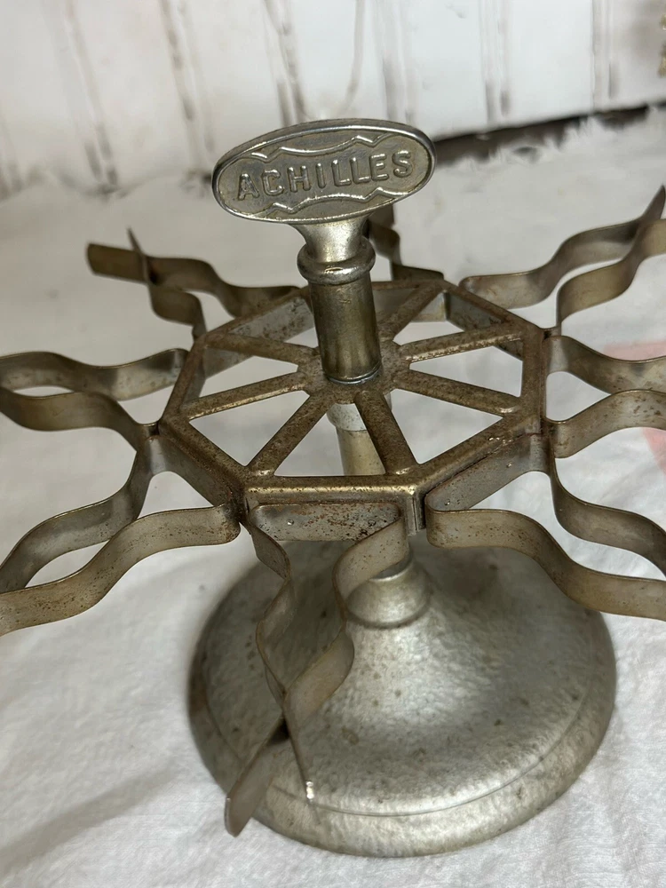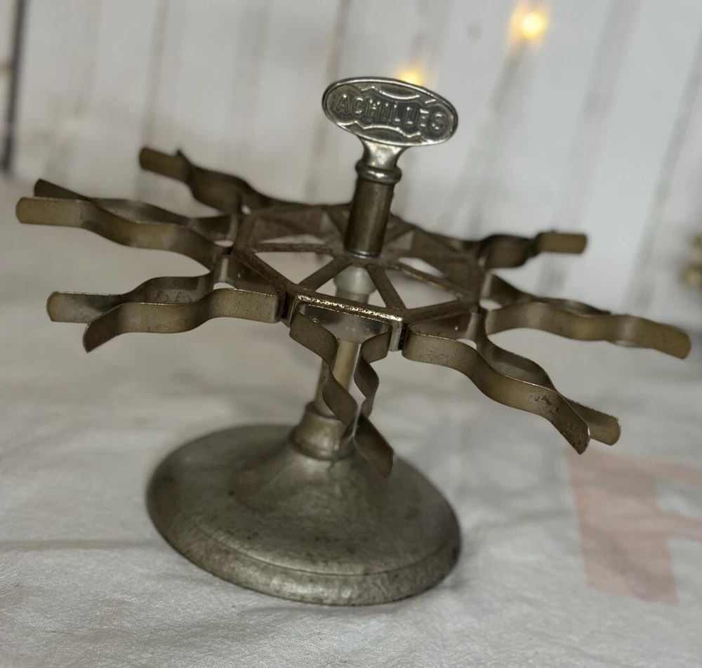 This vintage Achilles 8 rubber stamp holder carousel stand is a unique accessory that will add a touch of nostalgia to your collection. Made of metal, it features a revolving design that will showcase your stamps in a stylish and functional way. Perfect for collectors and enthusiasts alike, this a must-have for anyone who appreciates vintage items. Whether you're a fan of vintage stamps or simply looking for a unique accessory, this rubber stamp holder carousel stand is sure to impress.