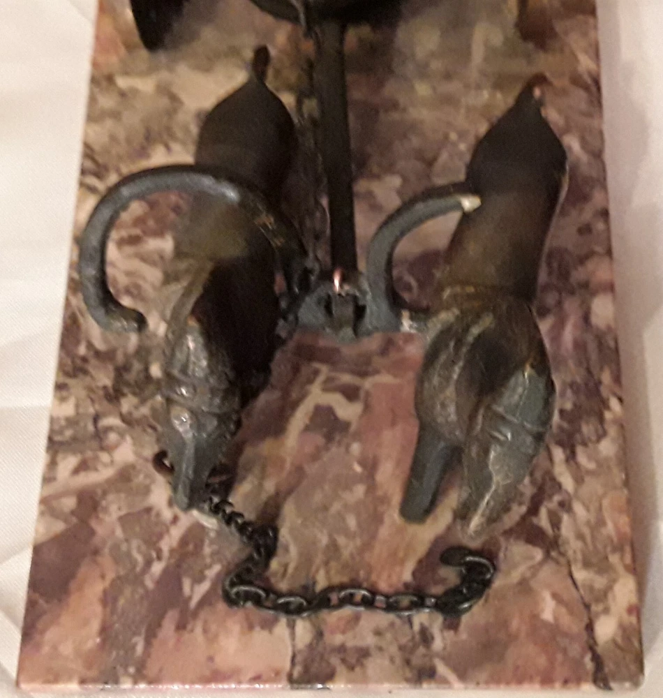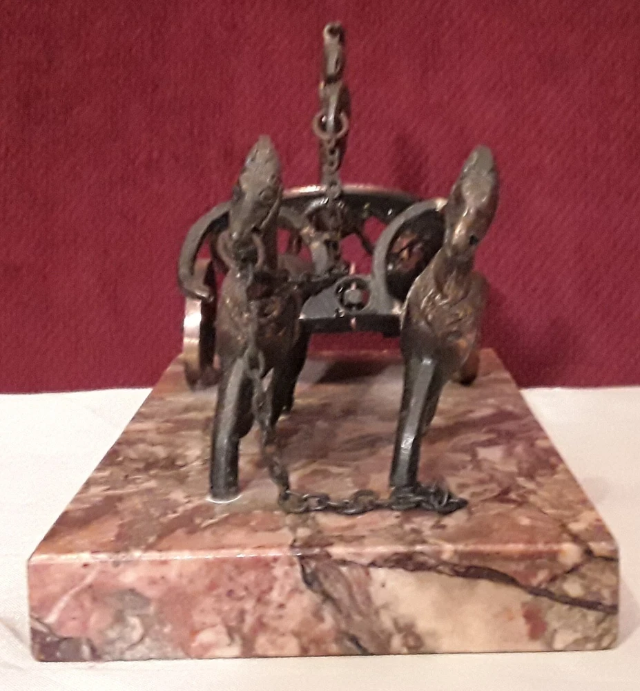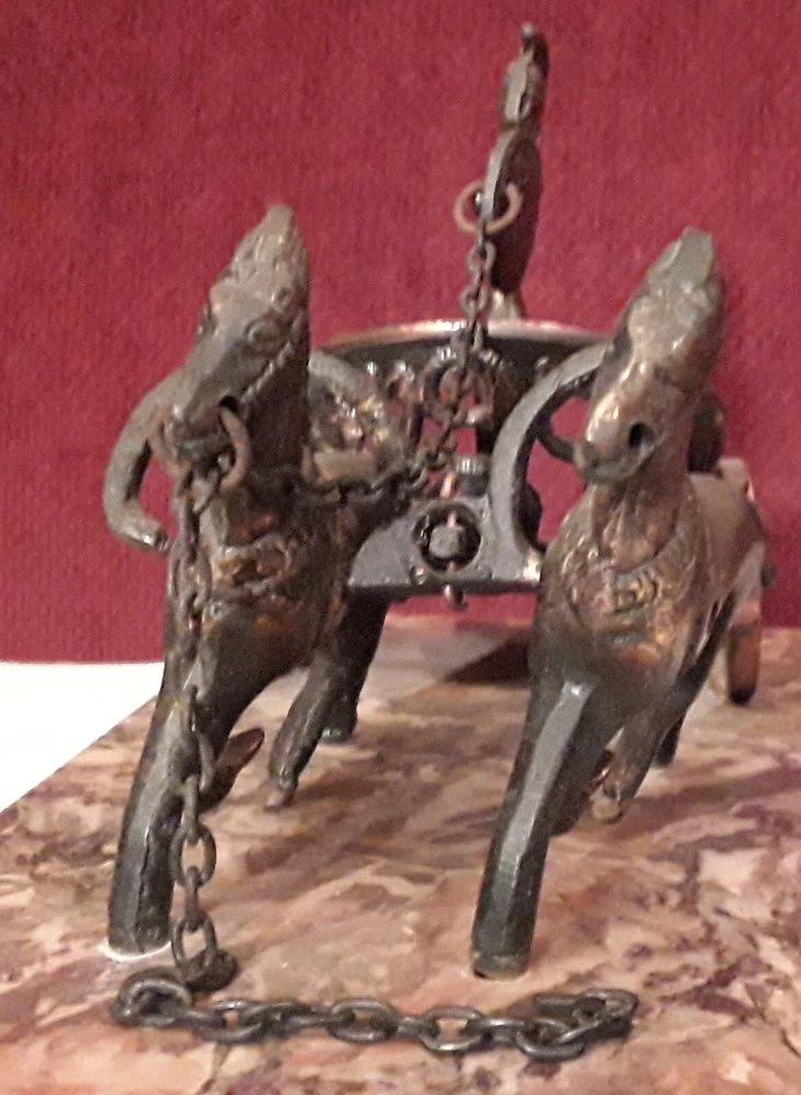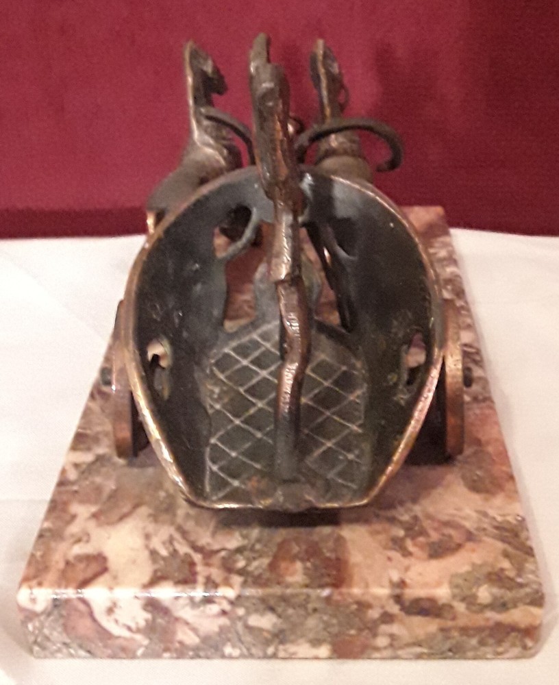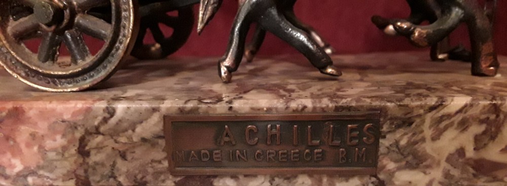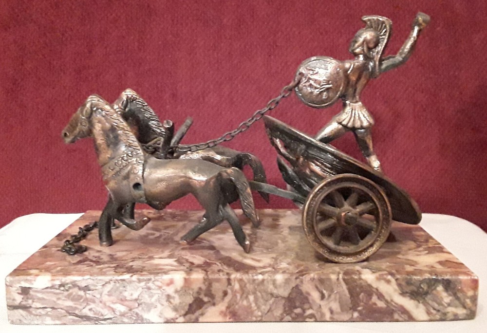 Vintage Achilles Bronze Sculpture Gladiator Chariot with 2 Horses on Marble Base - Made In Greece Length: 8 inches Marble Base Width: 4 1/2 inches Marble Base Height: 6 inches Statue on the Marble Base