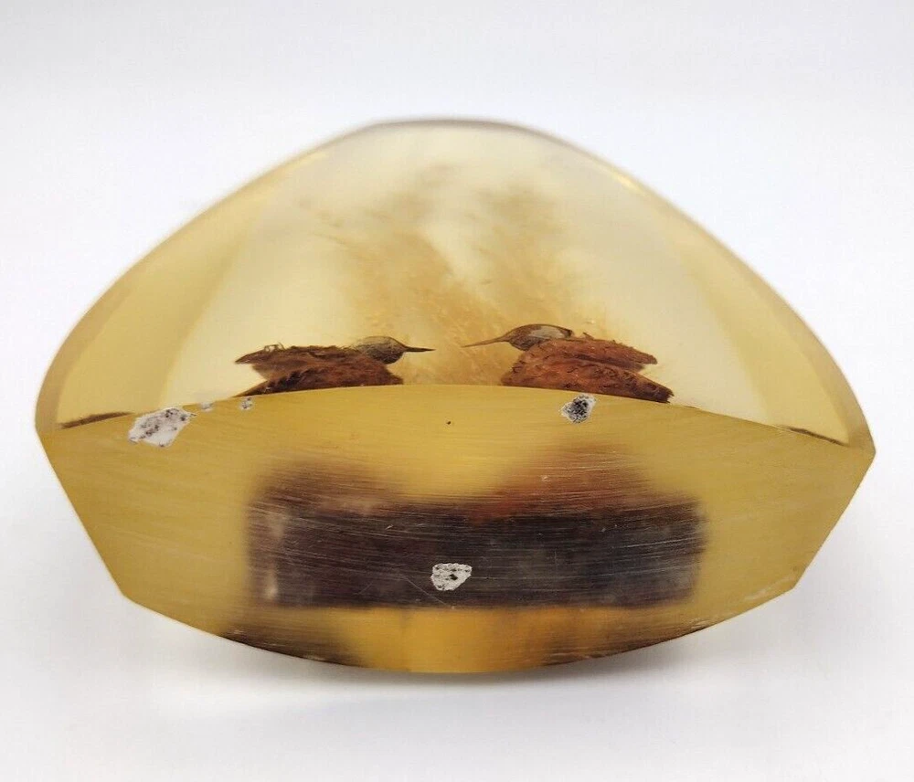 This handmade acrylic/resin paperweight measures 5.5" in height, 4" in width and its widest, and 1.5" at its thickest. It has a seed pod made into the shapes of ducks sitting on a piece of bark (log) with a 'wheat' talk in the background. Shipped with USPS Ground Mail. St