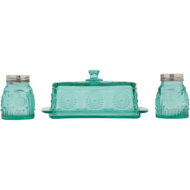 Spread a little cheer and shake things up with The Pioneer Woman Adeline Glass Butter Dish with Salt and Pepper Shaker Set. It's perfectly functional for everyday use and beautifully decorative to give as a gift as well. This set is made of gorgeously embossed glass and makes a nice addition to any table setting. The butter dish features a lid with a handle for easy access, and the glass salt and pepper shakers have pin-sized holes on each lid, so you can easily get just the right amount of flavor on your food. Each of the items are dishwasher safe, making them ideal for serving at dinner parties and big meals with the family. Everyday vintage style is brought to your home with The Pioneer Woman Adeline Glass Butter Dish with Salt and Pepper Shaker Set. Meet Ree: Ree Drummond is a NY Times Best Selling Author, TV personality, social media phenom, and the woman behind the popular Pioneer Woman lifestyle blog that started it all. She's also a lover of butter, basset hounds, Ethel Merman, her hunky, cowboy husband Ladd, and their four kids. Her casual country style and delicious recipes have made her a go-to for all things cooking and entertaining. The Pioneer Woman Adeline Glass Butter Dish with Salt And Pepper Shaker Set: 3-piece serveware set Set includes (1) butter dish with lid, (1) salt shaker with lid and (1) pepper shaker with lid Made of beautifully embossed glass Available in turquoise and clear colors Dishwasher safe 7. 5" x 4. 5" x 3. 5" butter dish Pairs with other glass serveware items from The Pioneer Woman collection