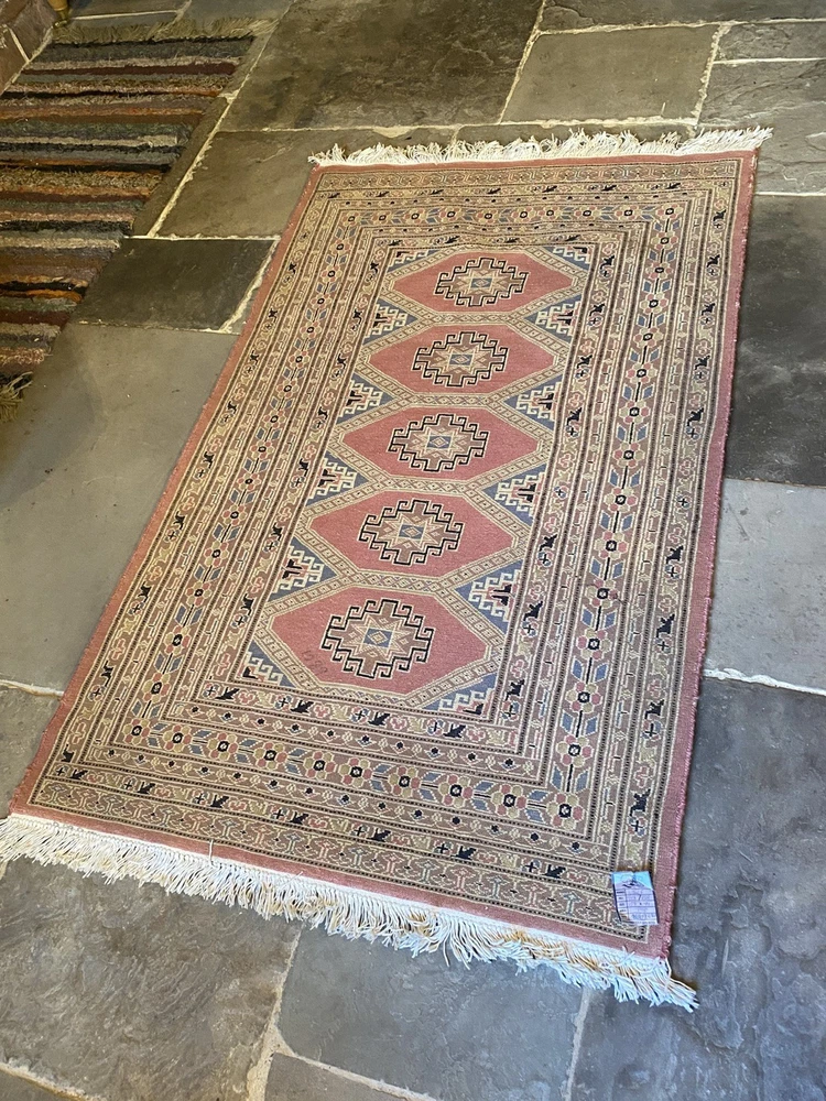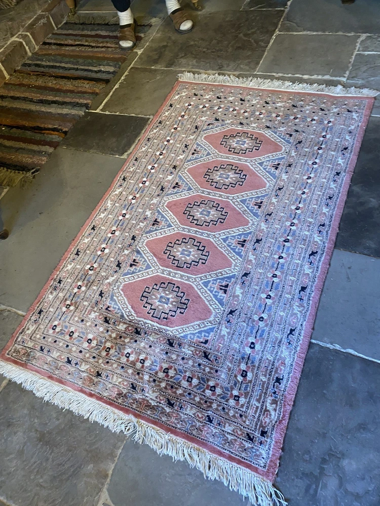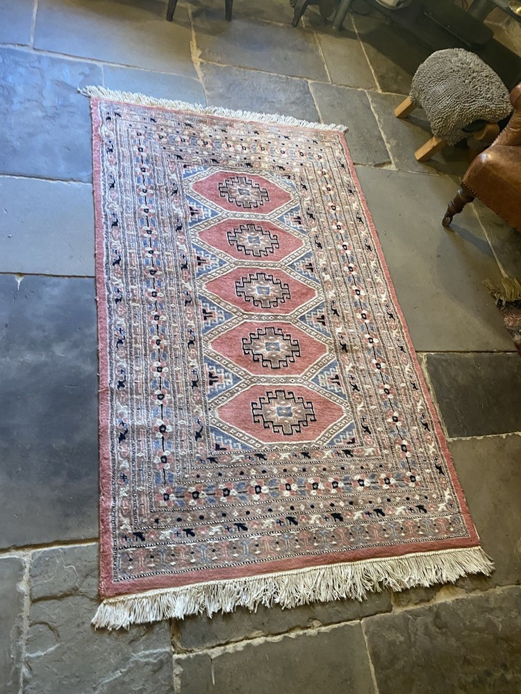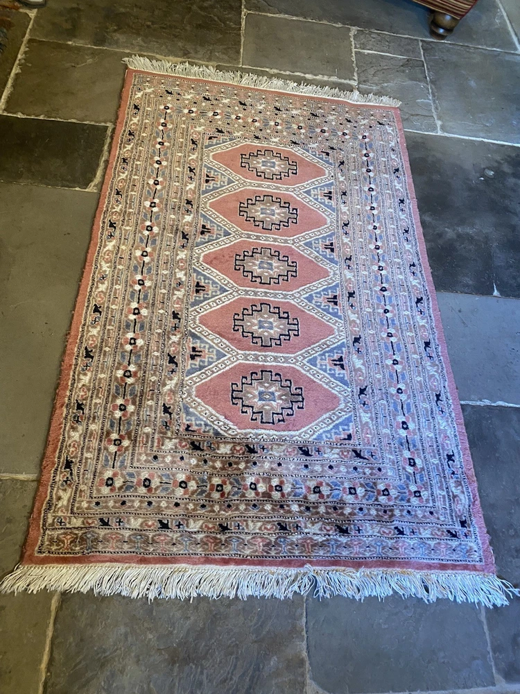 Vintage Afghan oriental kilim hand knotted 100% wool rug in muted pinks reds and beige colours with geometric and central medallion designs quality attractive stylish with label. Approx sizes 157cm x 99cm (5ft15 x 3ft25) Would suit most rooms nice thick soft quality pile and end fringe clean and tidy. No returns