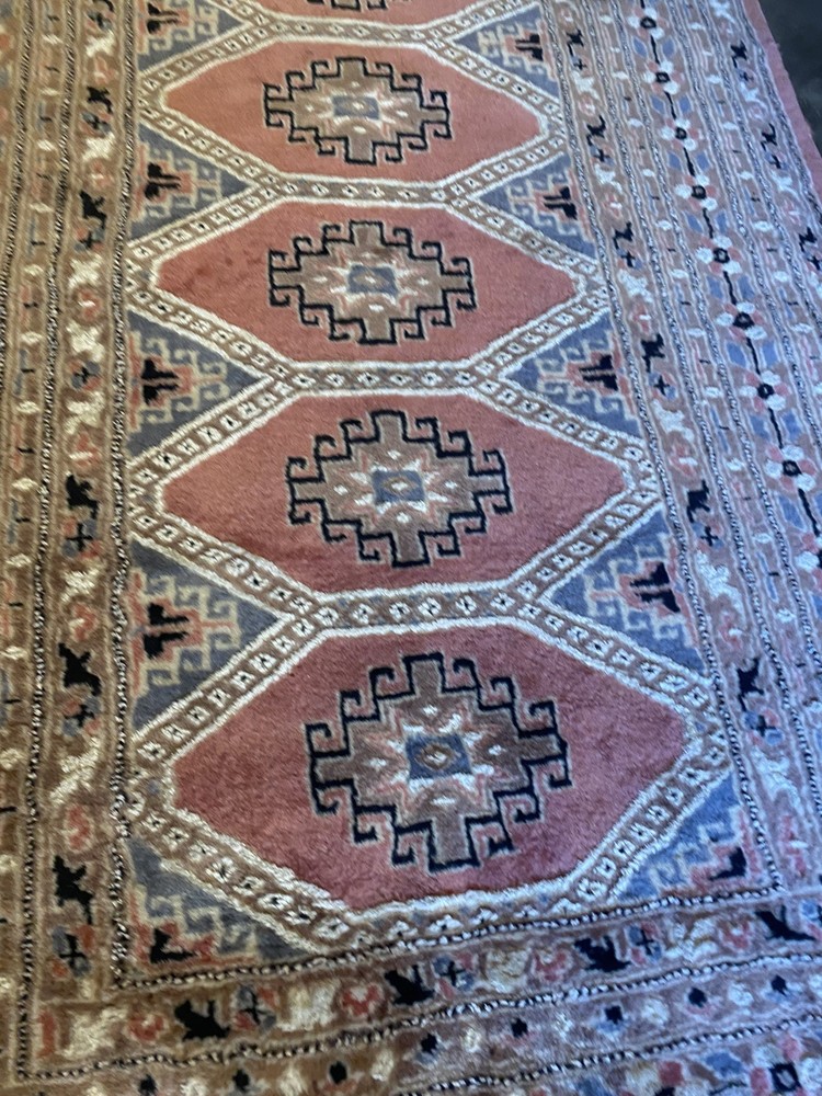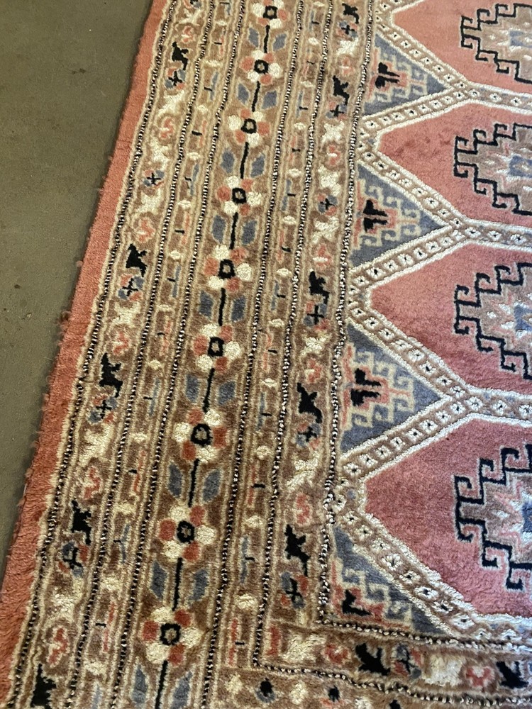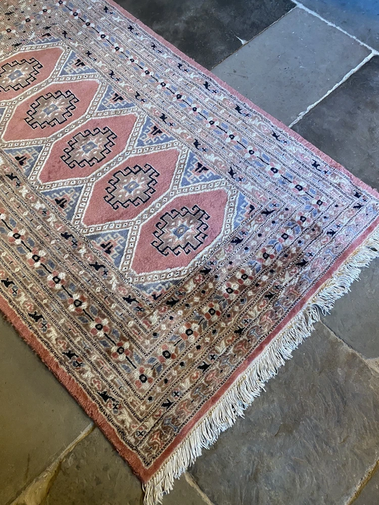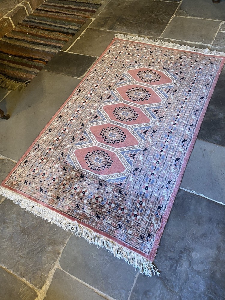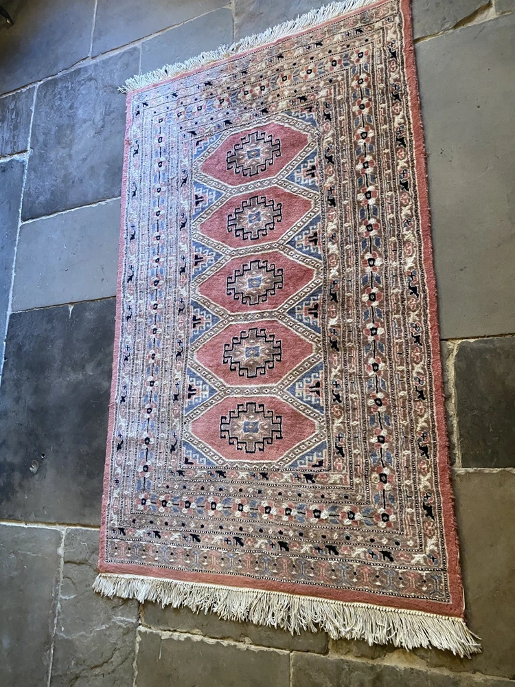 Vintage Afghan oriental kilim hand knotted 100% wool rug in muted pinks reds and beige colours with geometric and central medallion designs quality attractive stylish with label. Approx sizes 157cm x 99cm (5ft15 x 3ft25) Would suit most rooms nice thick soft quality pile and end fringe clean and tidy. No returns