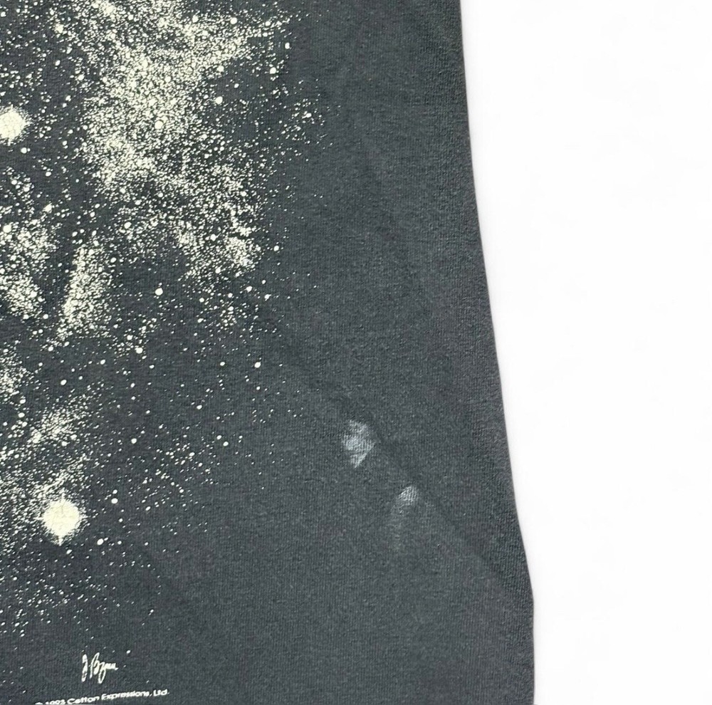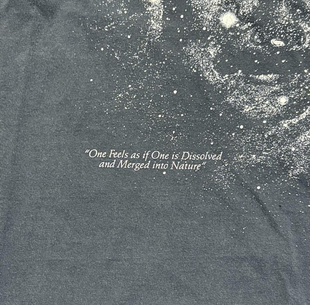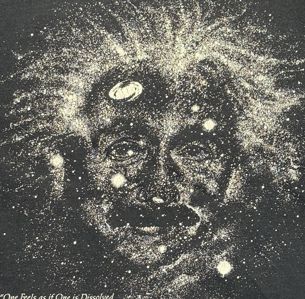 This vintage Albert Einstein Galaxy Science abstract black graphic t-shirt in size XL features a solid black color with a collared neckline and short sleeves. Made of cotton, this regular fit t-shirt by Bayside is designed for men who appreciate space-themed fashion. The iconic image of Albert Einstein adds a touch of scientific and intellectual flair to this classic wardrobe staple.