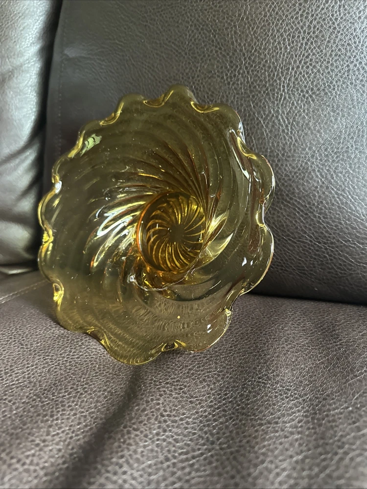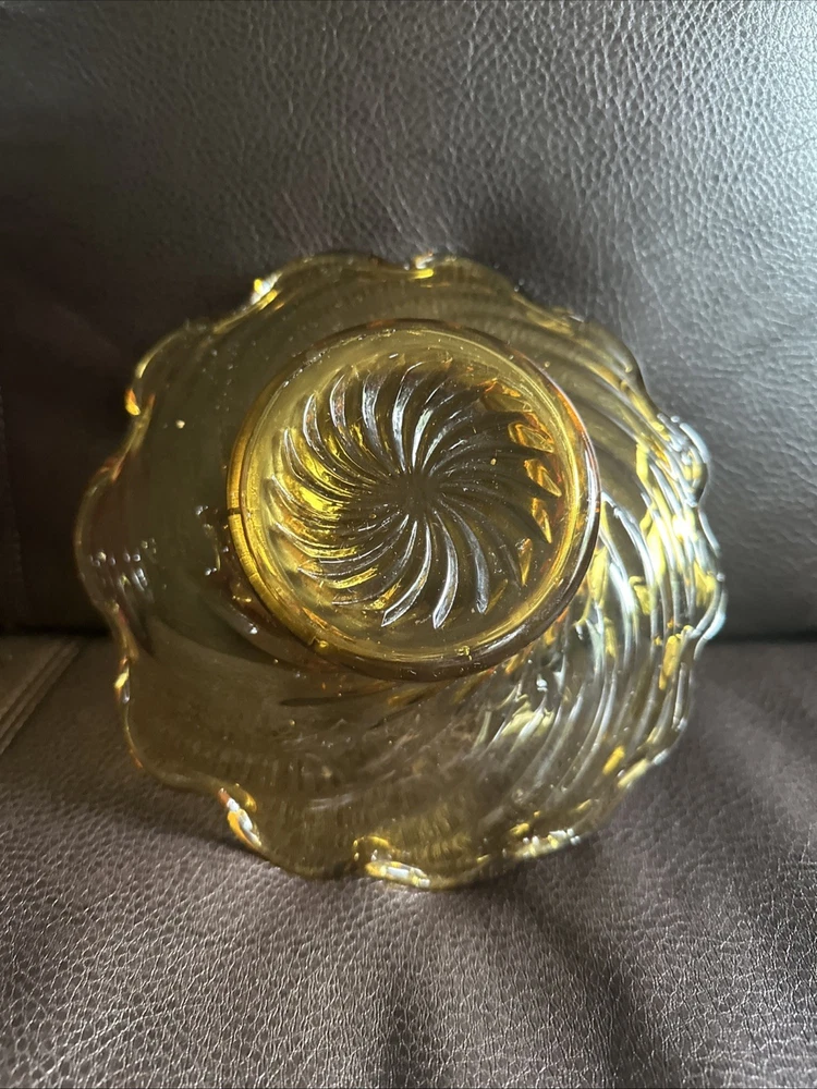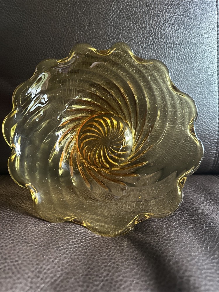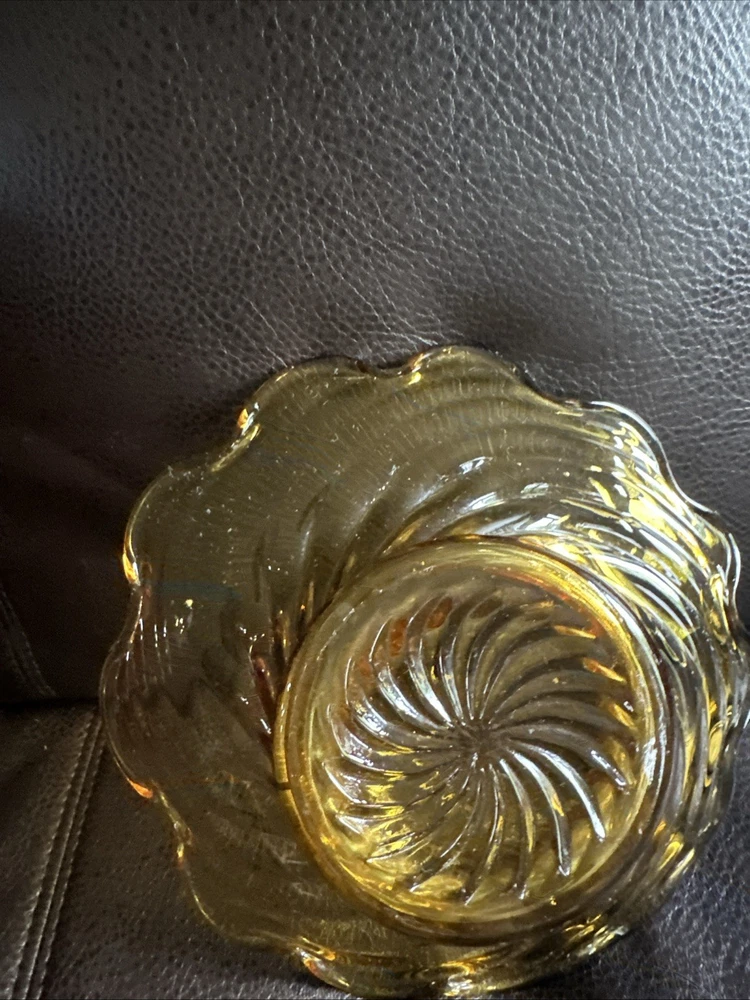 This vintage amber glass bowl is a beautiful addition to any kitchen or collection. With a scalloped edge and round shape, it can be used as a candy dish or serving bowl. The bowl is made of glass and has a mid-century modern style. It is an original piece and includes a pedestal base. The bowl measures 8.5 inches in diameter and is perfect for serving small desserts or appetizers. Good used condition, no chips or cracks.