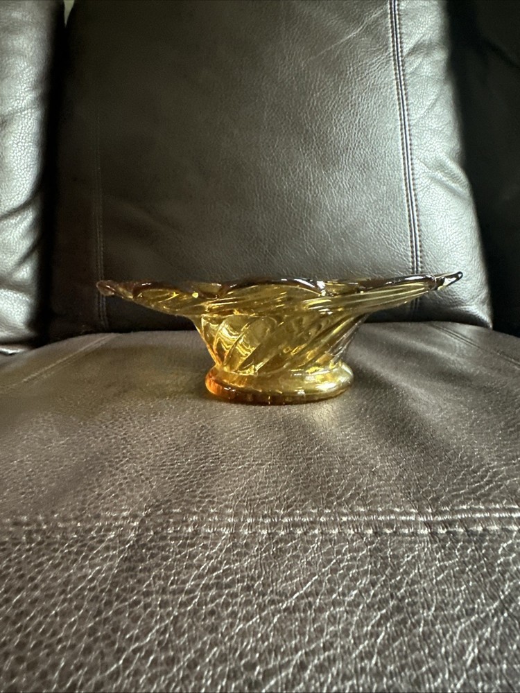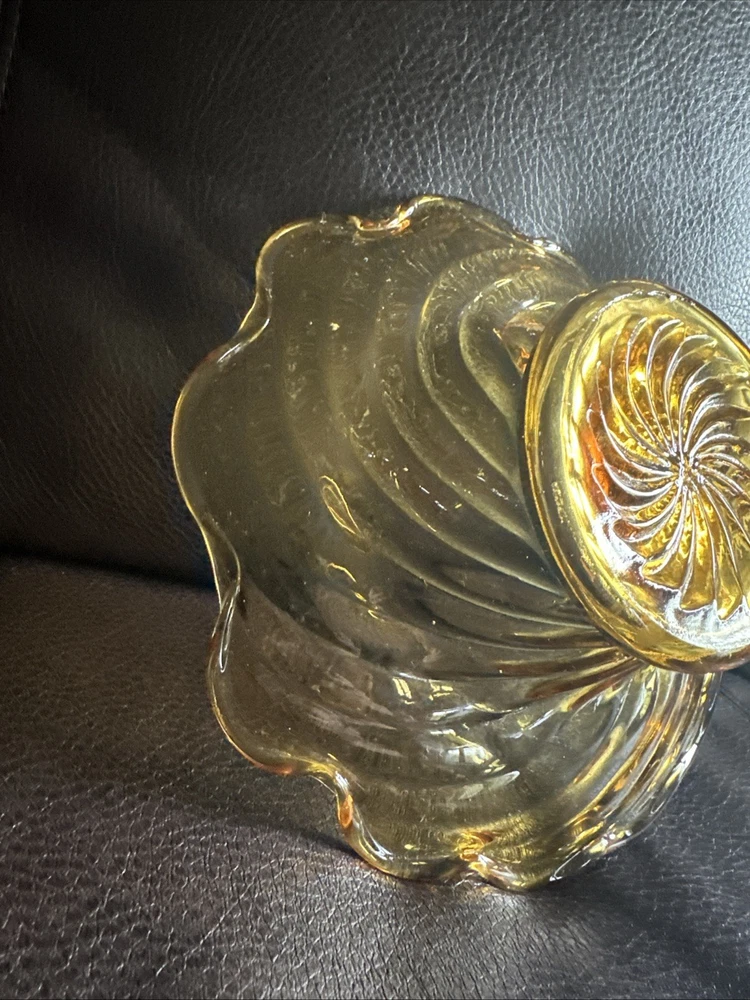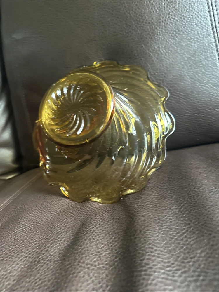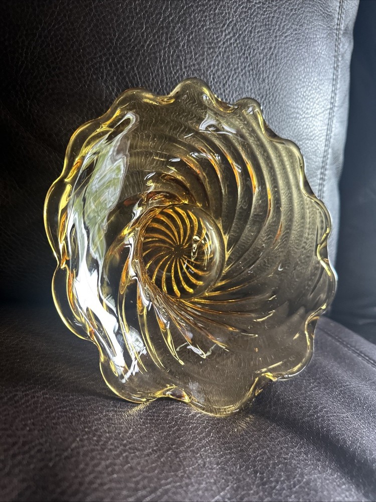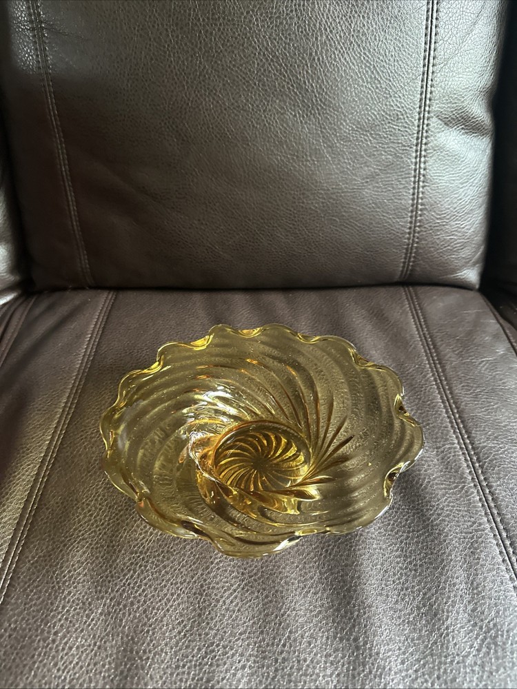 This vintage amber glass bowl is a beautiful addition to any kitchen or collection. With a scalloped edge and round shape, it can be used as a candy dish or serving bowl. The bowl is made of glass and has a mid-century modern style. It is an original piece and includes a pedestal base. The bowl measures 8.5 inches in diameter and is perfect for serving small desserts or appetizers. Good used condition, no chips or cracks.