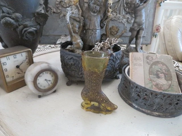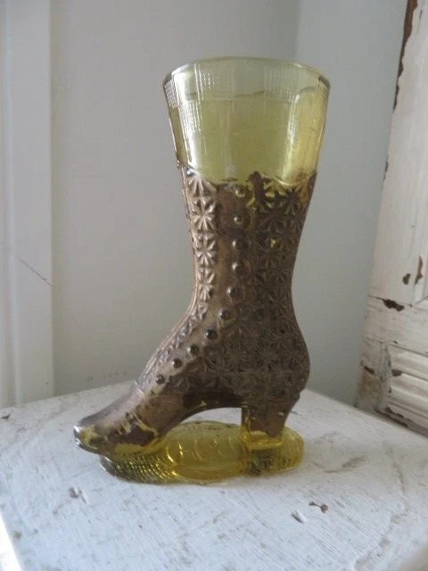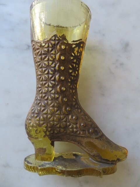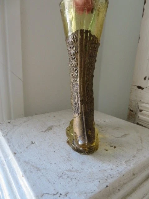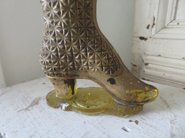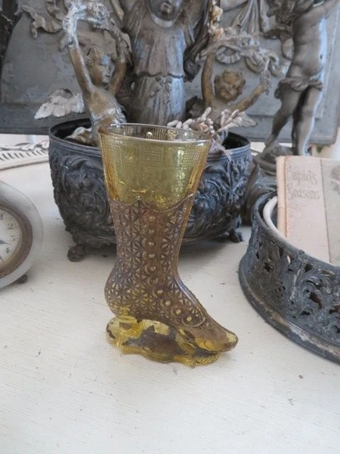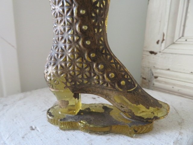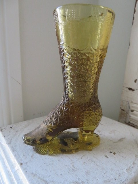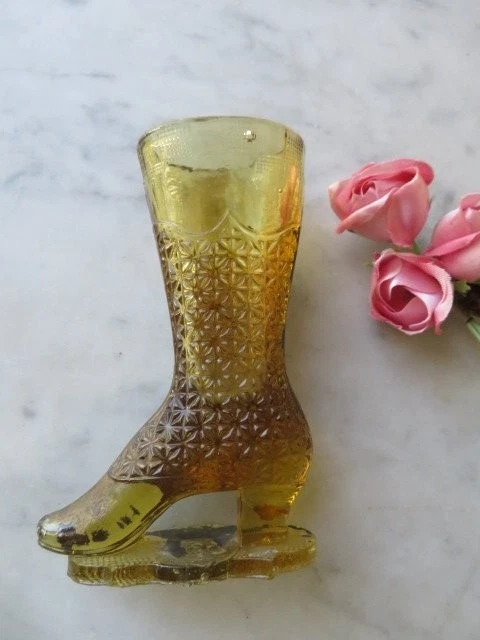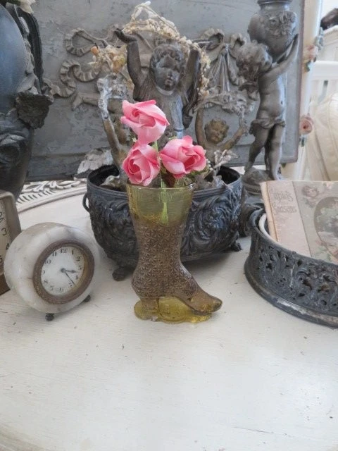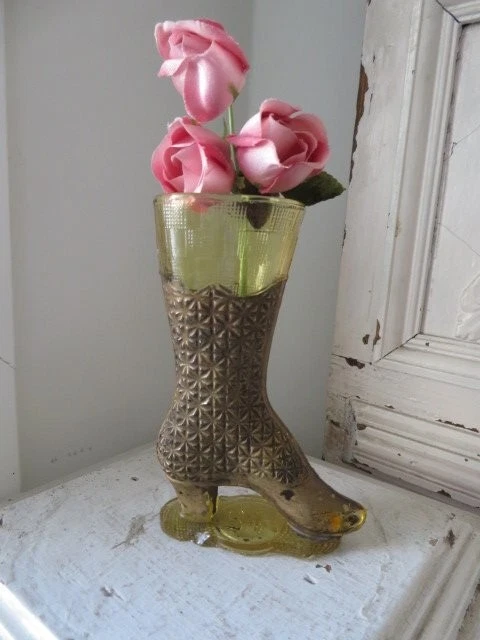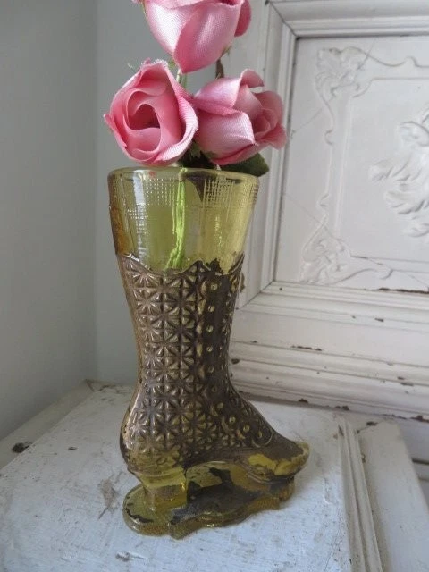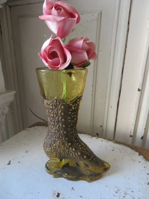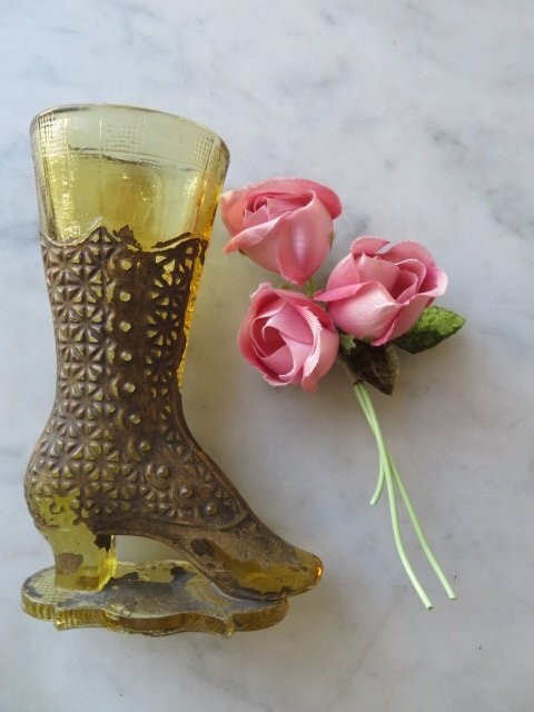 VERY PRETTY Vintage AMBER GLASS & Gold Tone Ladies BOOT Vase with PINK ROSES THIS IS A SMALL VINTAGE AMBER GLASS BOOT VASE AND VINTAGE MILLINERY ROSES. The vase glass boot and roses are not original to each other. The glass boot has some original gold paint with paint loss and wear. It is stamped B & H. The boot is about 5 1/2" by 3 1/2". Buyer to pay shipping and insurance of $9.00 to the lower 48.. BE SURE TO ADD SHABBYTOWNUSA TO YOUR FAVORITES AND CHECK BACK OFTEN. PLEASE SCROLL ALL THE WAY DOWN TO SEE ALL THE PHOTOS. See my other listings for more great items! Buyer to pay shipping and insurance. txzj pxzj1036 txzj-12