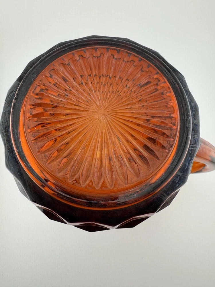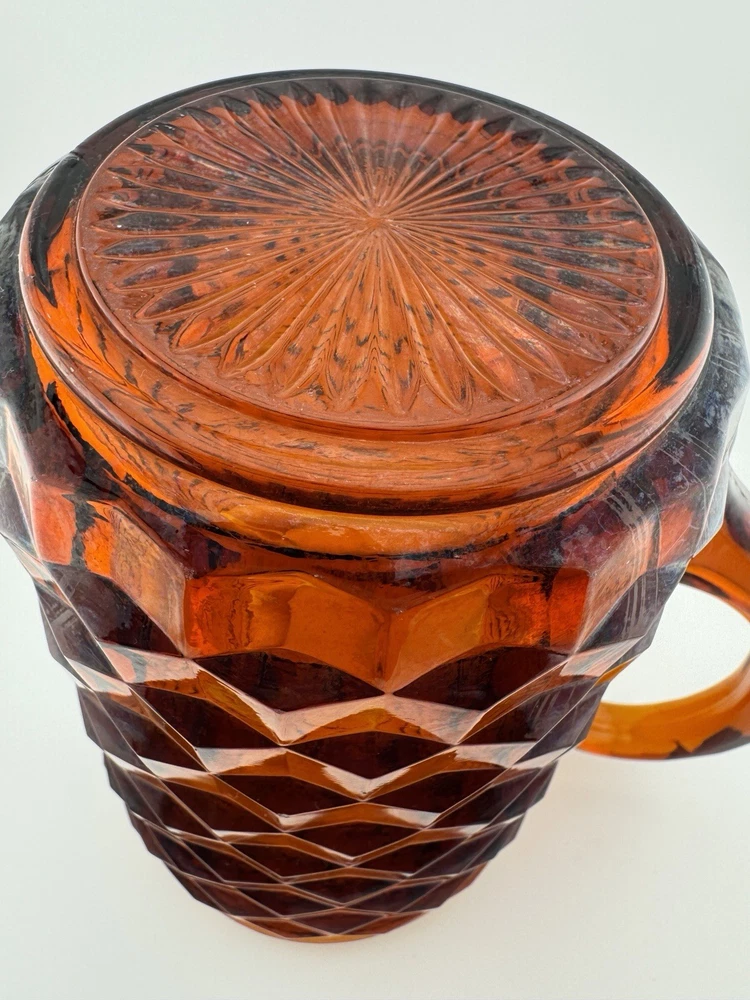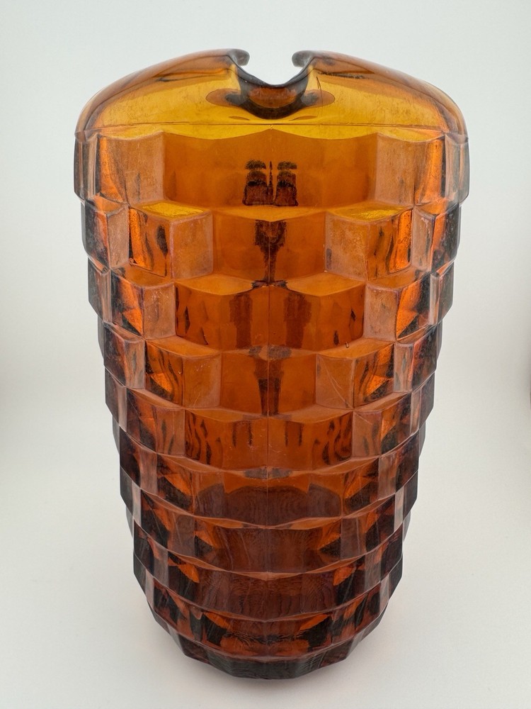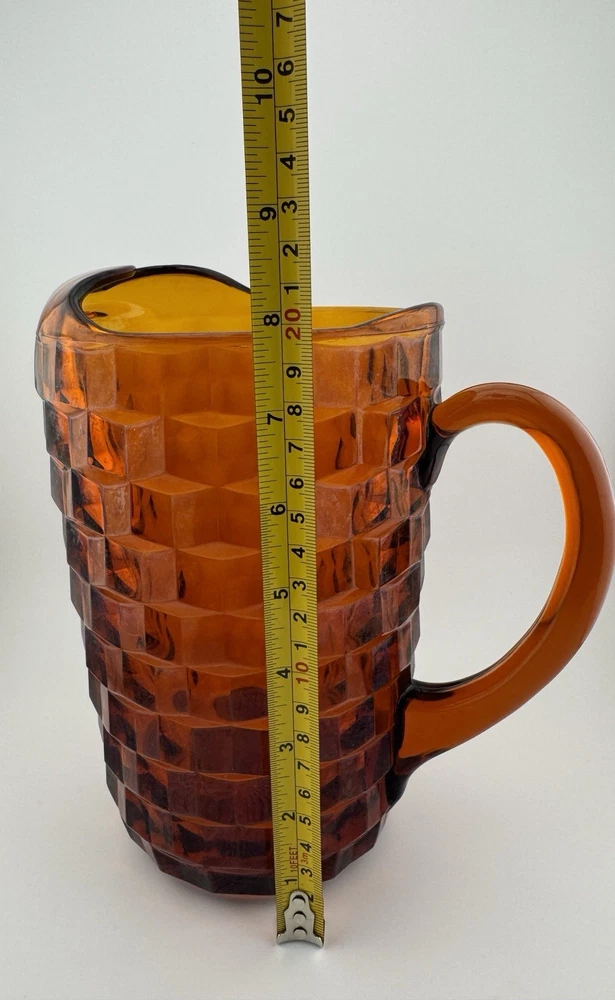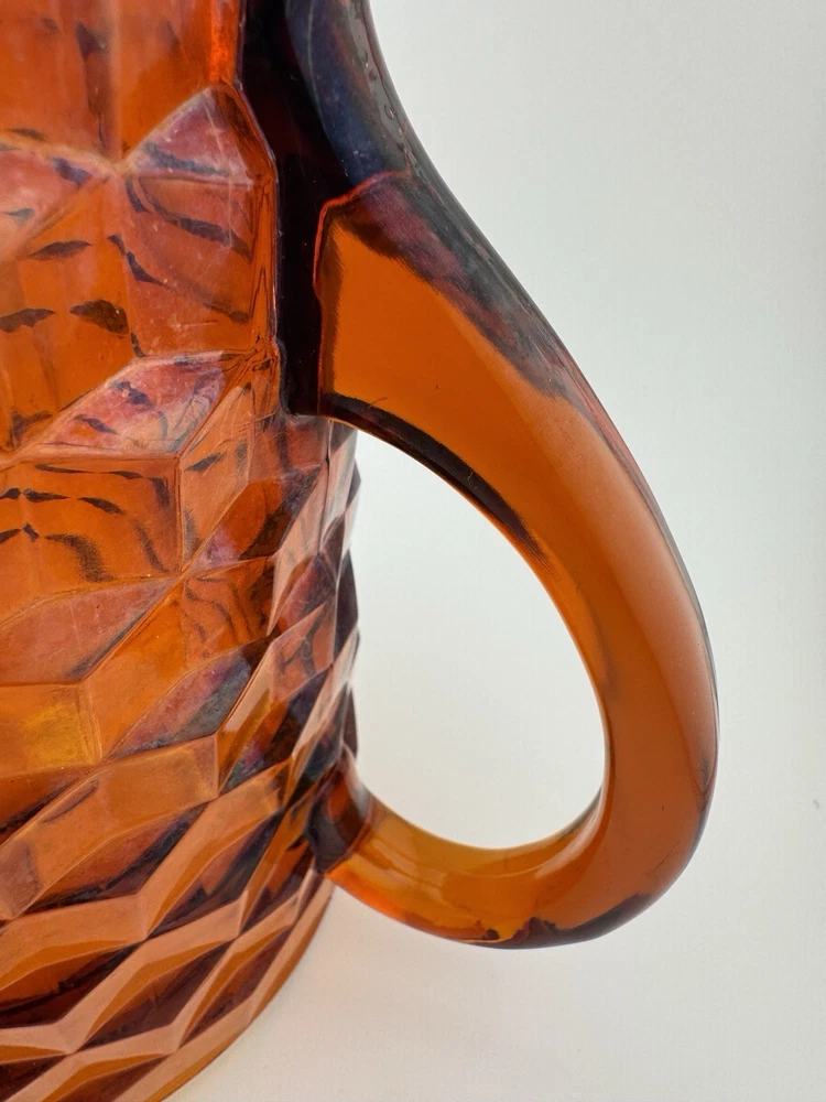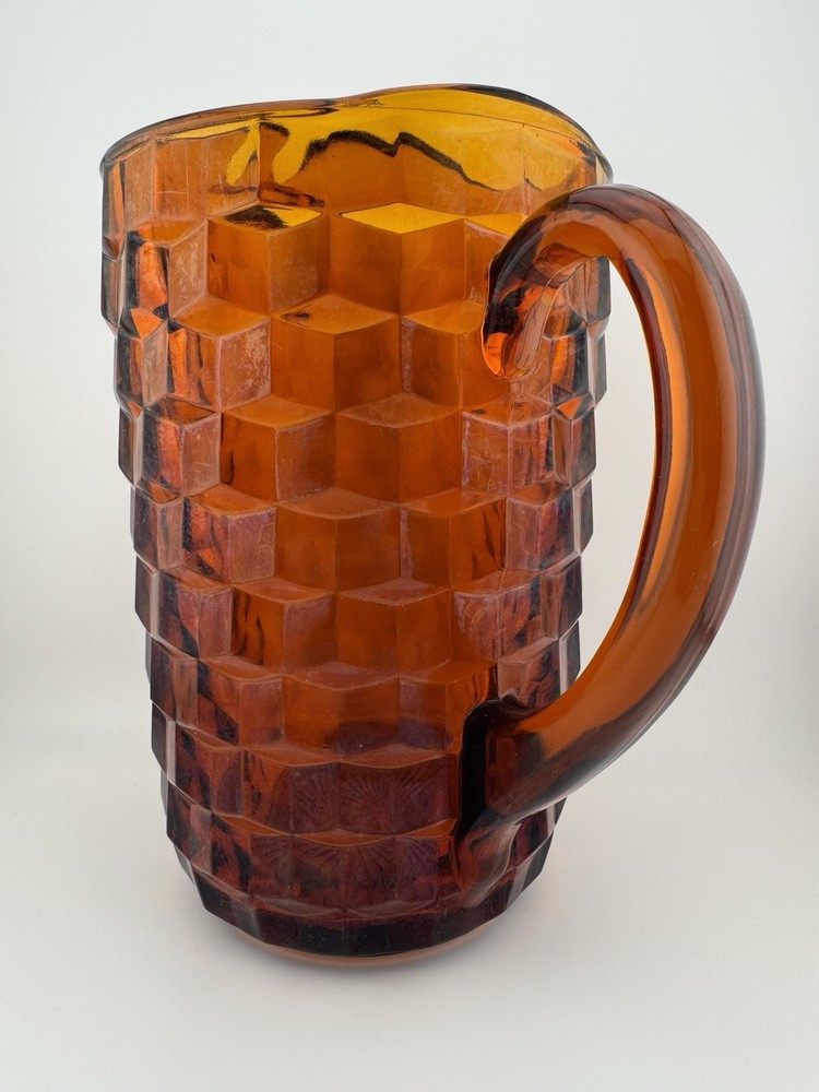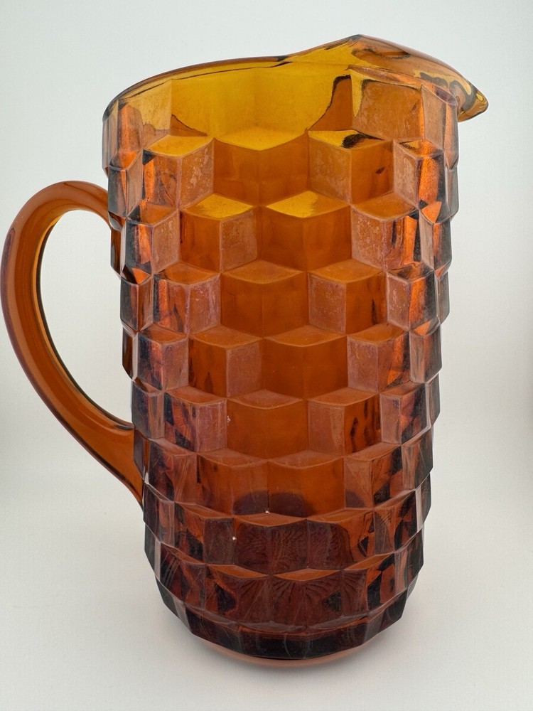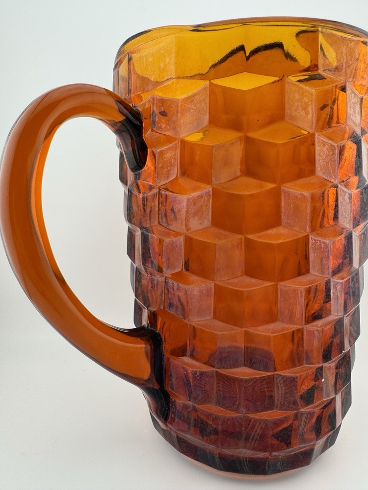 Time Period Manufactured:1960-1969Features:HandlesShape:RoundPackaging:UnboxedCountry of Origin:United StatesFinish:GlossyProduction Style:Elegant GlassHandmade:NoAntique:NoProduct Line:Cube/CubistMaterial:GlassTheme:AmericanVintage:YesType:PitcherPattern:CubistBrand:FostoriaProduction Technique:Fused GlassCare Instructions:Hand Wash OnlyColor:AmberOriginal/Licensed Reproduction:Original