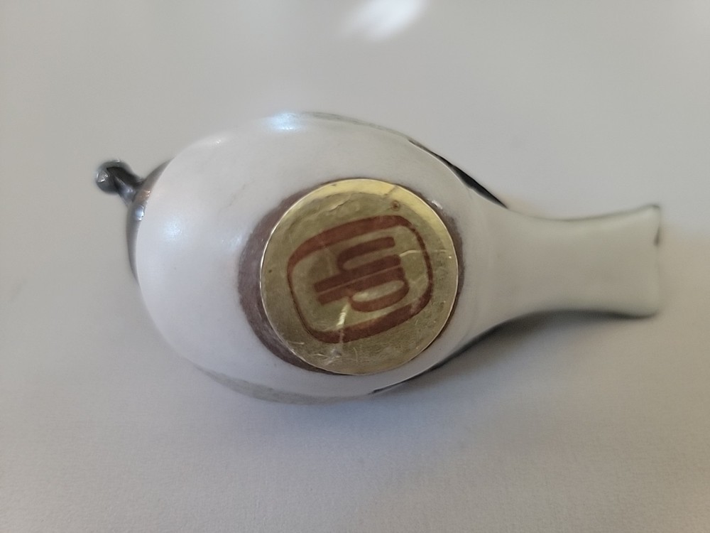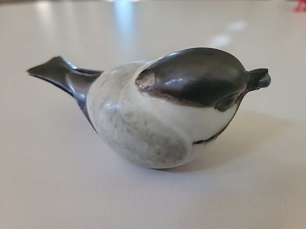 This product is a vintage 1989 Andersen Design Studio pottery chickadee bird with a blueberry, originating from North America. Made of ceramic in a multicolor finish with a matte texture, this figurine represents a decorative piece from the late 20th century. Handmade and produced using pottery techniques, this unique studio art pottery showcases the craftsmanship of the brand Andersen Design Studio, making it a charming addition to any collection or decor.