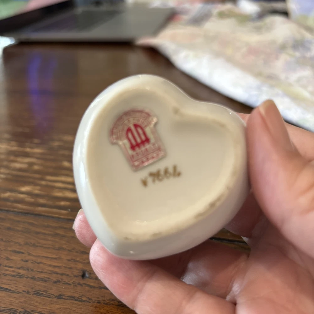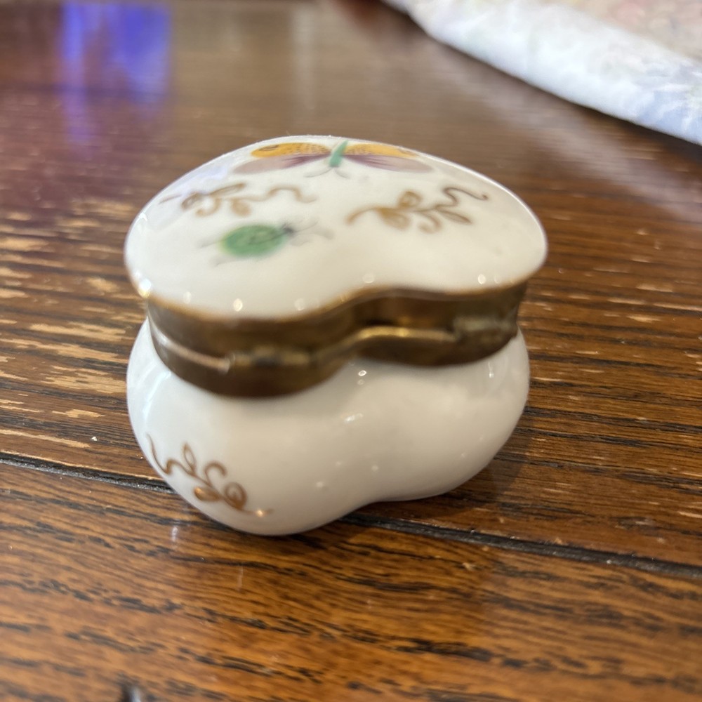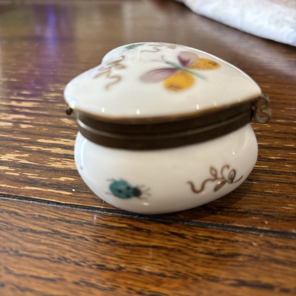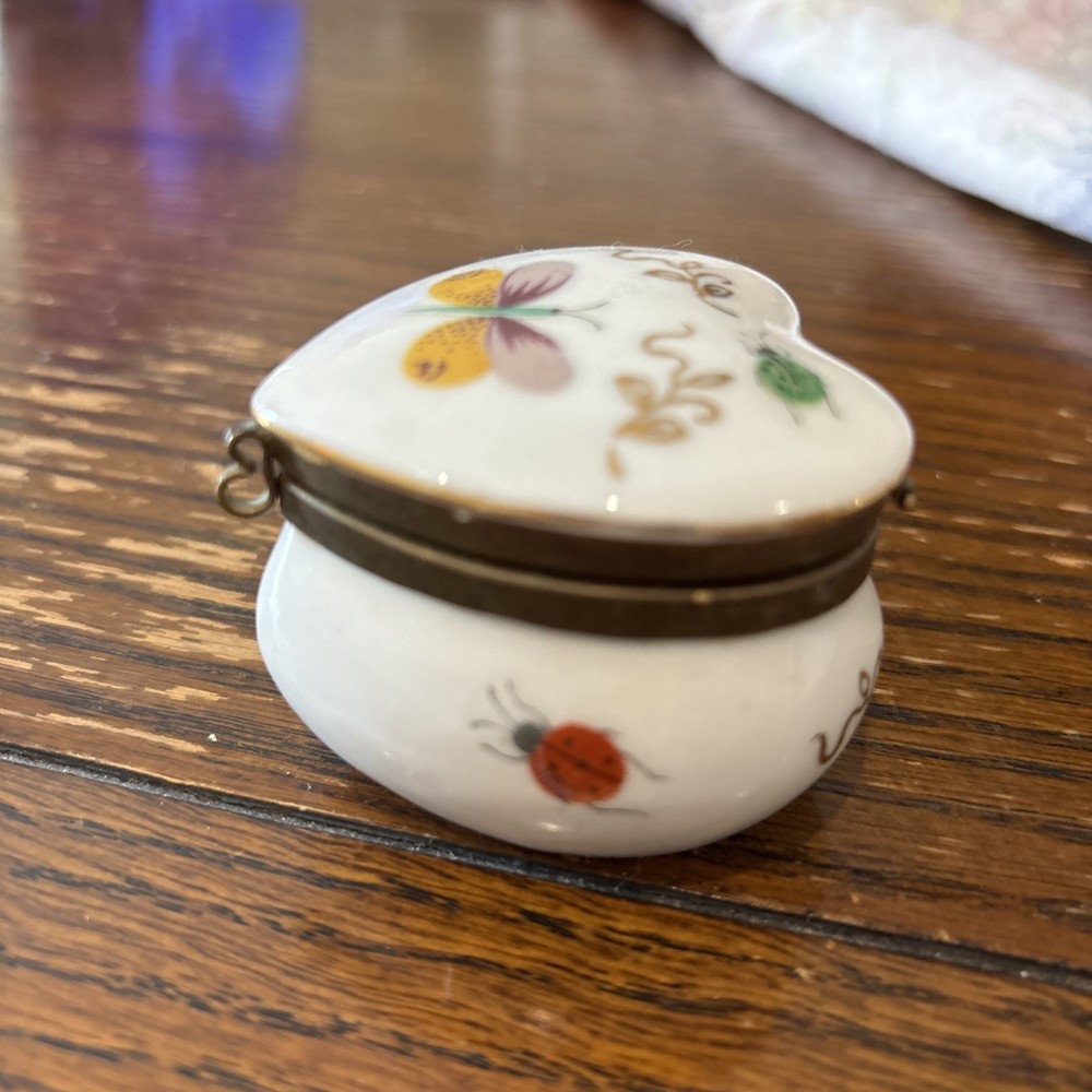 This vintage Ardalt Japan heart-shaped porcelain trinket pill box with a hinged lid features a multicolor glossy finish, making it a unique and charming decorative collectible. Manufactured between 1970-1979 in Japan, this trinket box is adorned with a heart pattern and a subject of a butterfly, adding a touch of elegance and nostalgia to any space. Perfect for storing small treasures or jewelry, this collectible piece is a lovely addition to any collection or home decor.