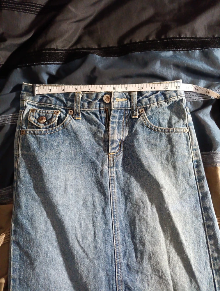 This is a vintage Arizona denim maxi pencil skirt in size 8 for women. It features side slits and a logo accent. The skirt is made of cotton denim and is machine washable. With a casual style, this long skirt is suitable for various occasions throughout the seasons. Perfect for a Y2K or 90's inspired look.