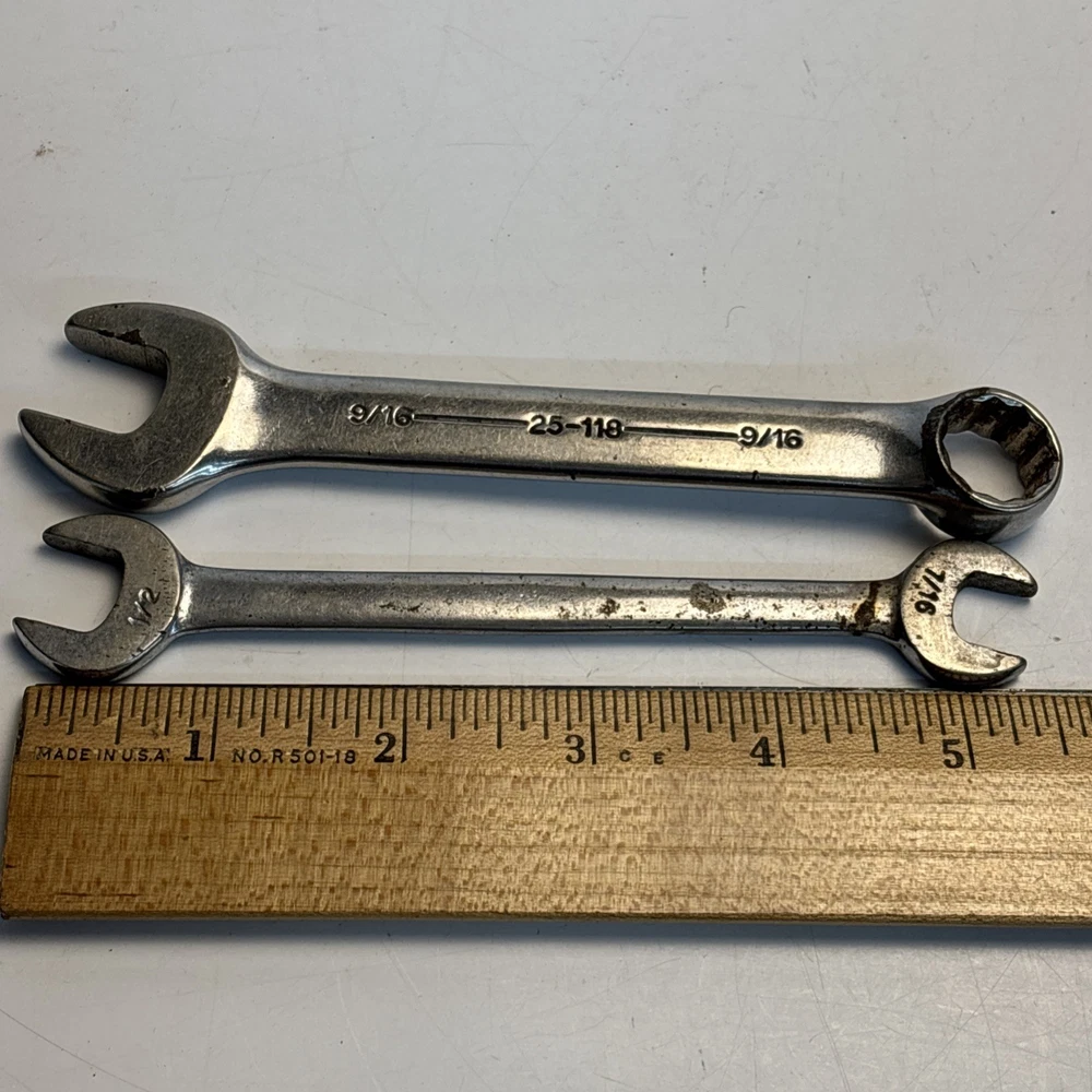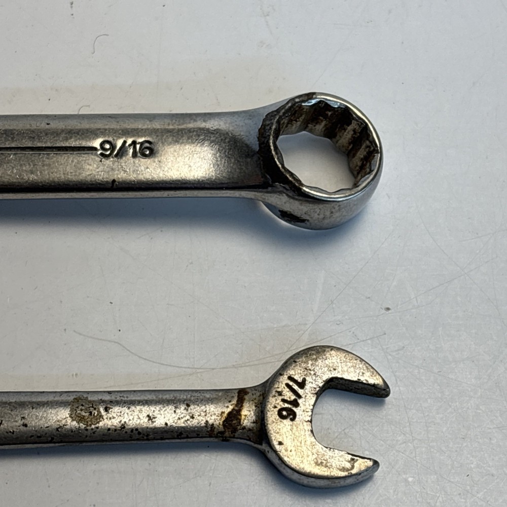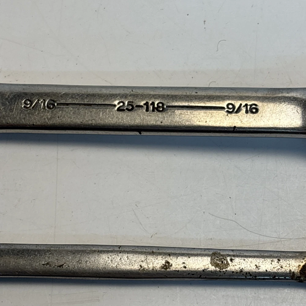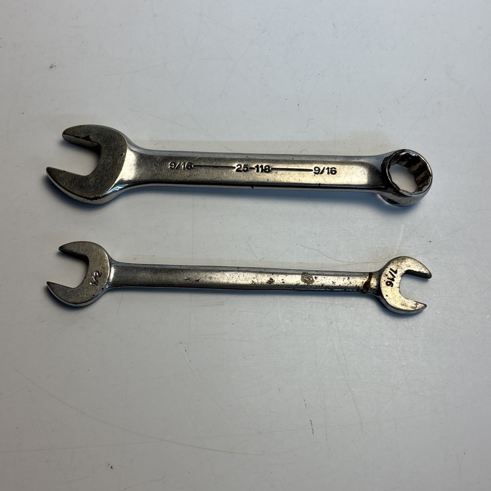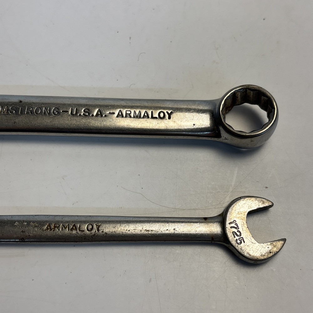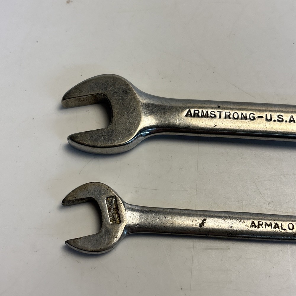 Vintage lot of two Armstrong USA Armaloy wrenches. Includes one stubby 9/16 combination wrench, model 25-118, and one double open end wrench (7/16” x 1/2”). Both marked Armstrong U.S.A. Armaloy. See photos for details. Condition: Used with typical wear, surface marks, and light corrosion. No major damage observed.
