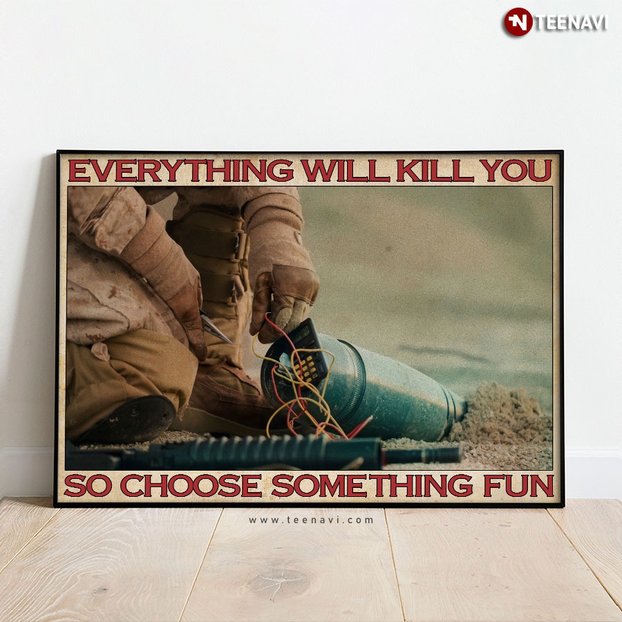 Vintage Army�s Bomb Disposal Expert Everything Will Kill You So Choose Something Fun Poster Premium Matte posters ( No Framed ) Design & Printed in the USA Matte edge-to-edge print on 200 GSM paper Multiple sizes: 11x17, 16x24 Inch Fingerprint and smudging resistant Shipped in well-protected cardboard tube packaging For indoor use SHIPPING On average, merchandise is produced and shipped from our facility 2-3 business days after purchase. Standard shipping/transit times apply (1-7 days for domestic and 4-15 days for international). Replacement/return policy We stand behind the quality of our products and guarantee our workmanship 100%. Any defects or errors on our part will result in a replacement at no charge. We typically do not accept returns due to user error such as incorrect selection of sizes, designs, colors, etc.