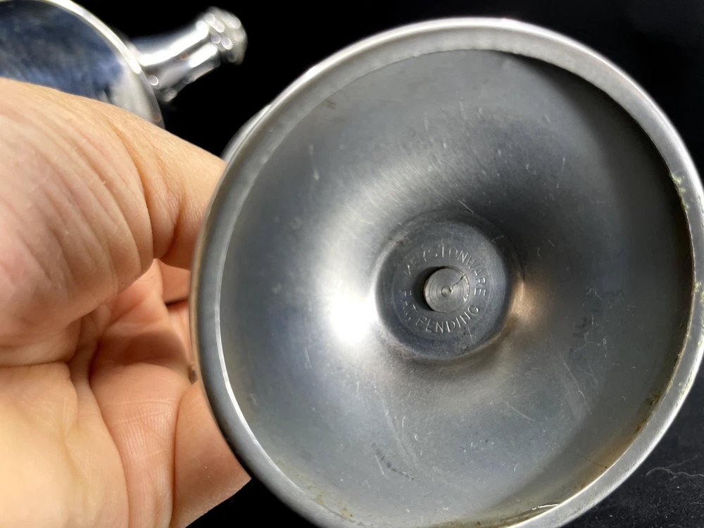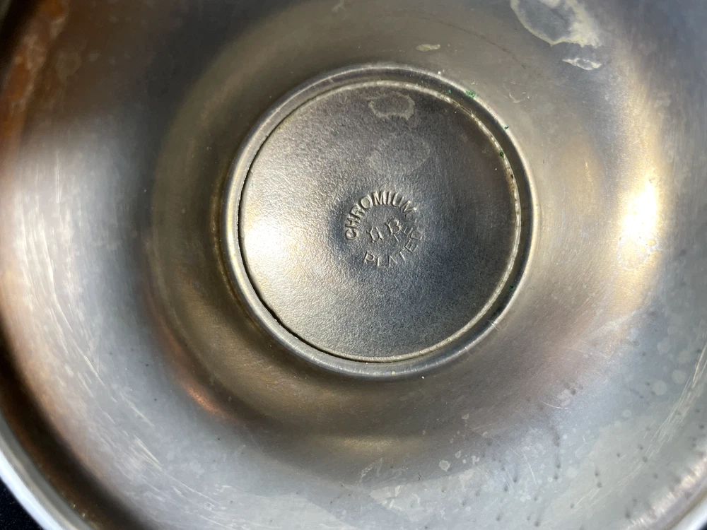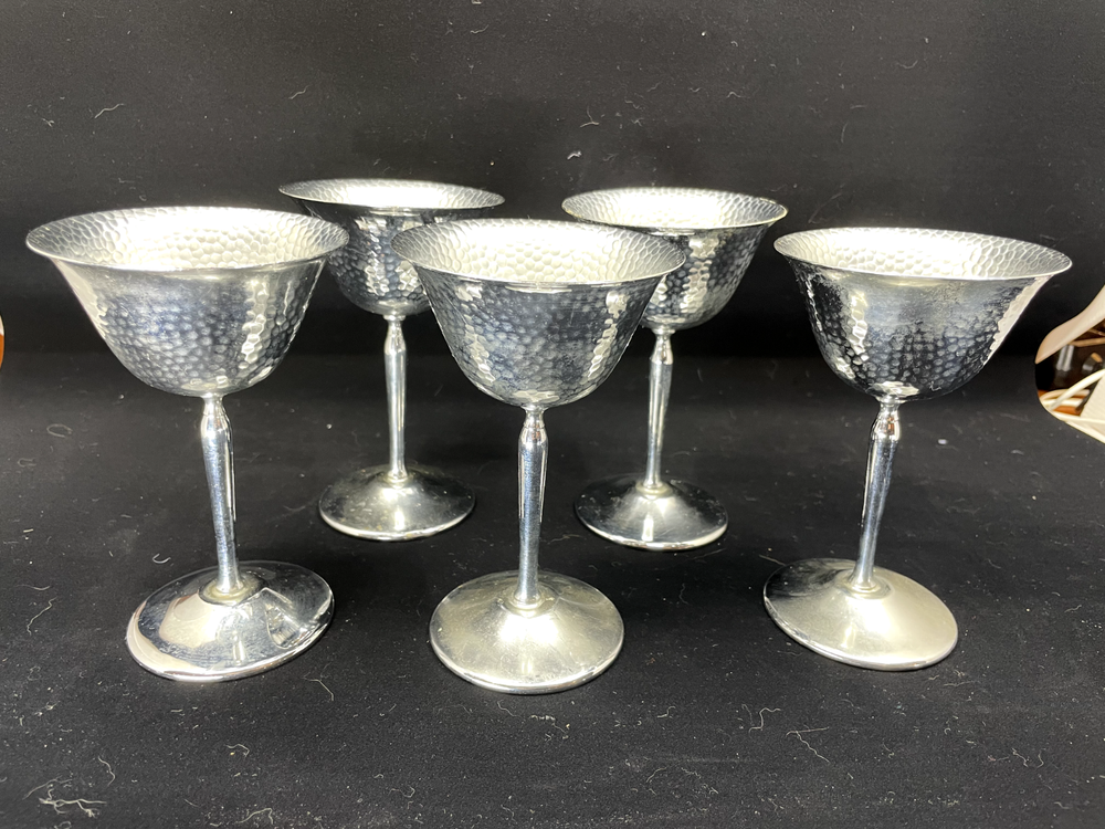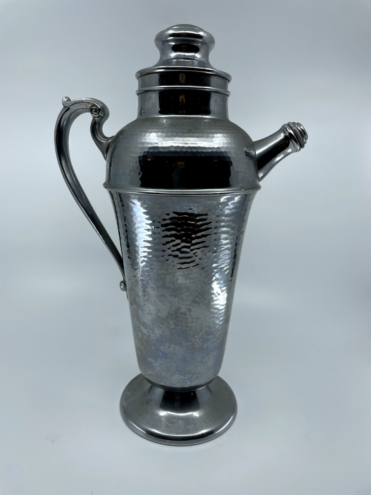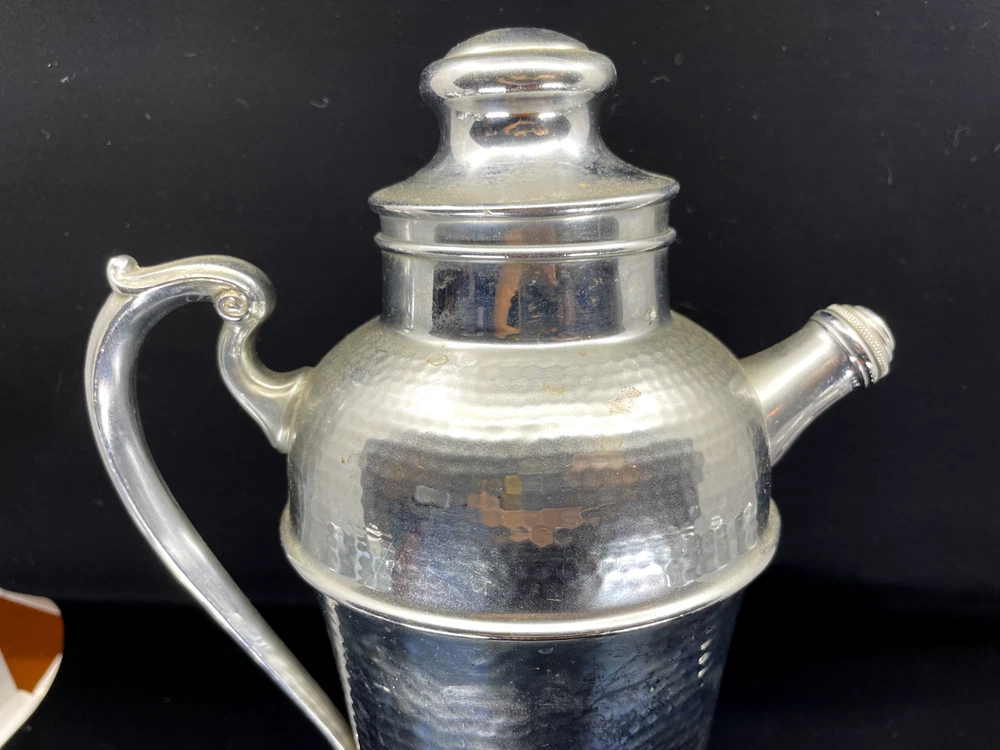 Chrome plated art deco mid century modern MCM large cocktail shaker and 5 matching silver coupes Vintage Chromium shaker has a hammered finish. It is large enough for many drinks and is very clean inside - likely never or very rarely used. We think a wedding present for my teatotaling grandparents. Shaker is stamped Chromium Plated UB (or GB?) on the bottom Set includes five matching cups (coupes or glasses) also with a hammered finish. Cups are stamped 'Keystoneware Patent pending' on the bottom. Shaker is 12" tall Cups are 5" tall Great condition and will look fabulous on your bar car! Any questions please ask!