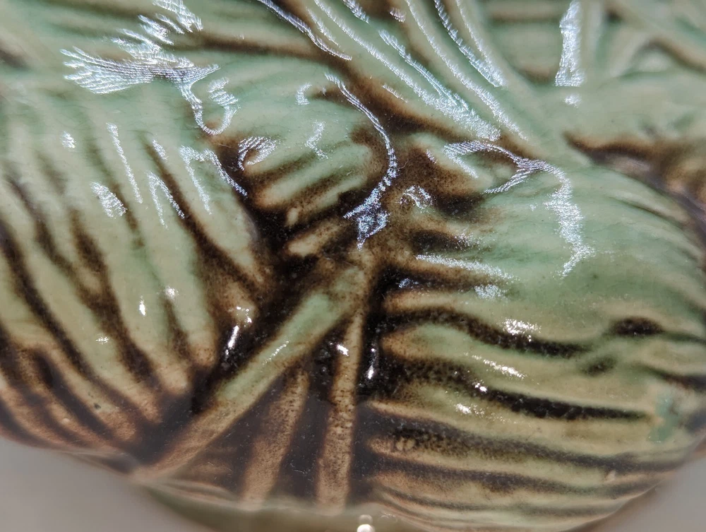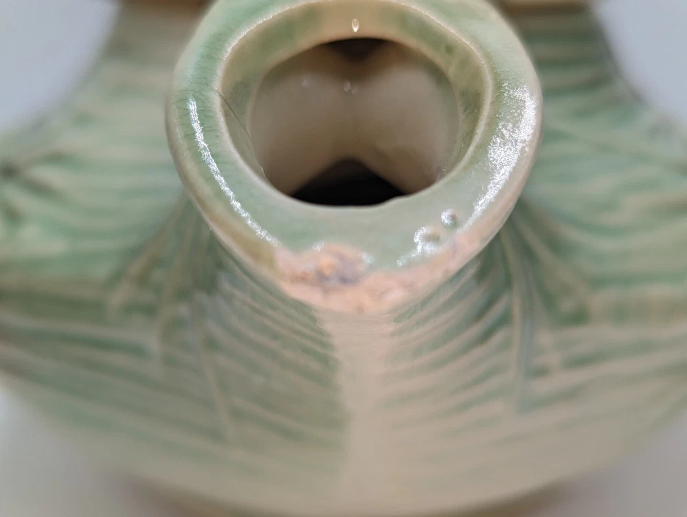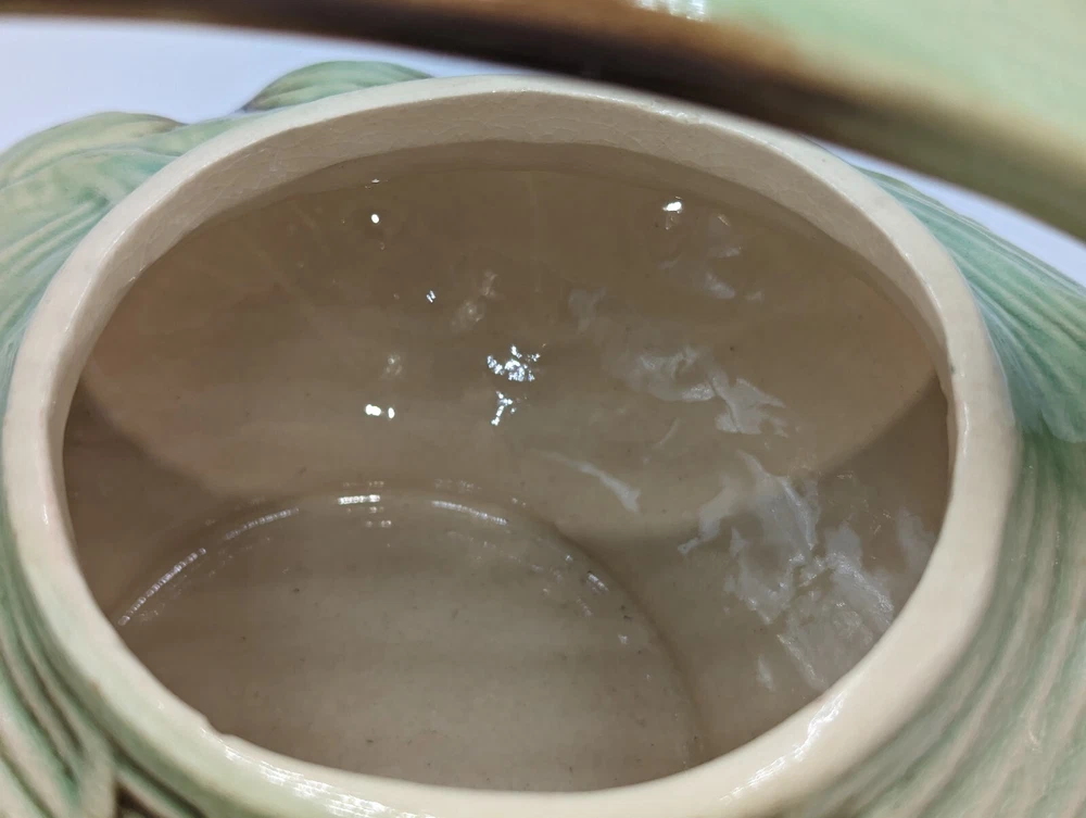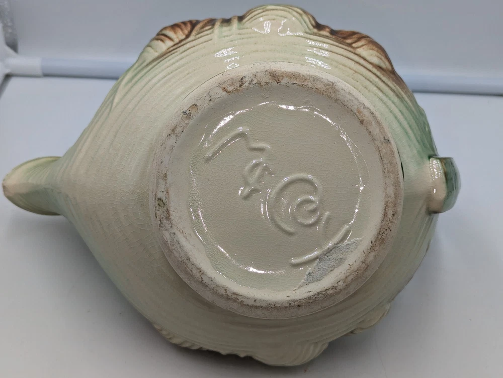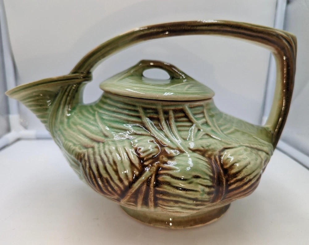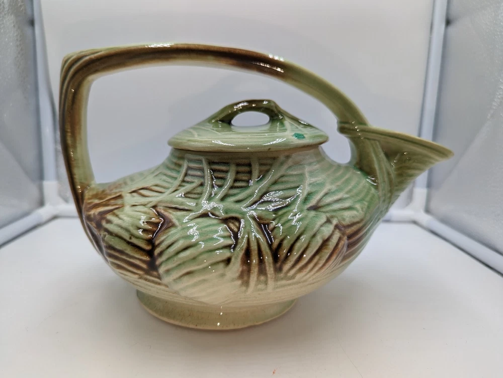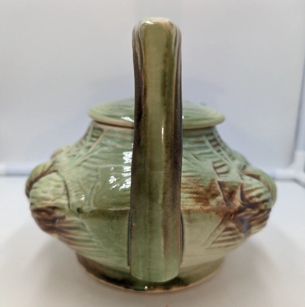 Vintage Art Deco McCoy Pottery Teapot 940s Pinecone & Branch w/Lid AS IS. There are a few condition issues - a couple of small chips on the spout and one small chip on the inside rim. Also there is glaze crazing on most of the teapot and a manufacturer defect - a small glob of green glaze on top of the lid. This would really still make a delightful addition to your teapot collection. All of my items are carefully packed for shipping, no matter their value - $5 items are wrapped with the same care as a $200 item. My goal is to have your purchase arrive safely. I use recycled packaging when possible but mostly use new, high quality products so your item will arrive intact without damage. Large, heavy and fragile items are harder to use combined shipping with but just ask if you would like to purchase more than one item and I am more than happy to do so if feasible. If not, maybe we can work out a shipping discount. Thank you and hopefully you will visit my store again!