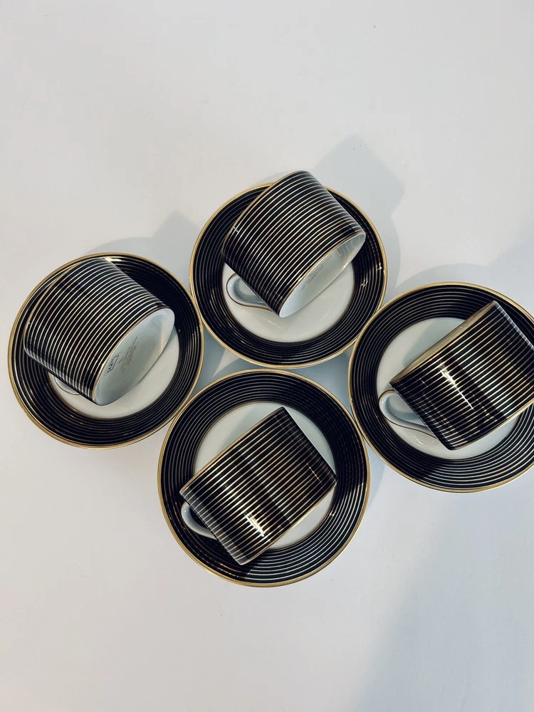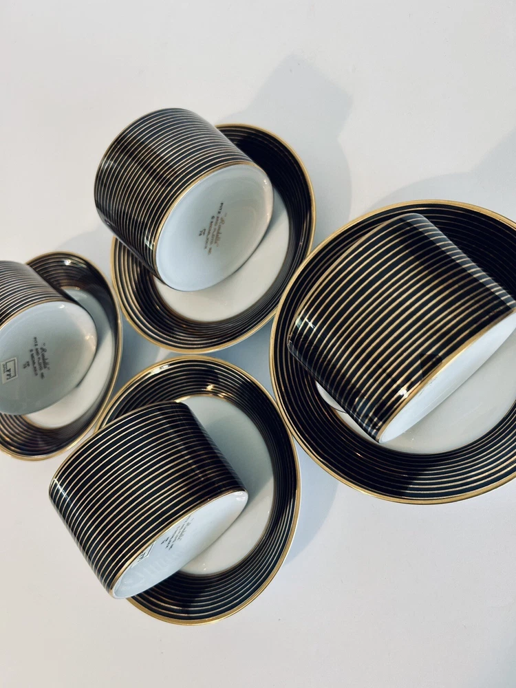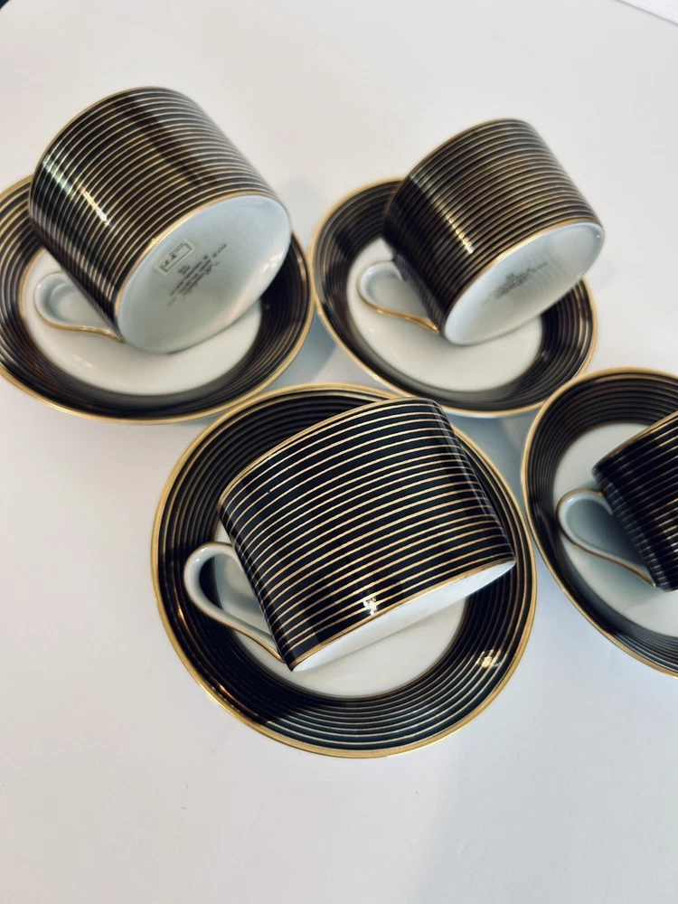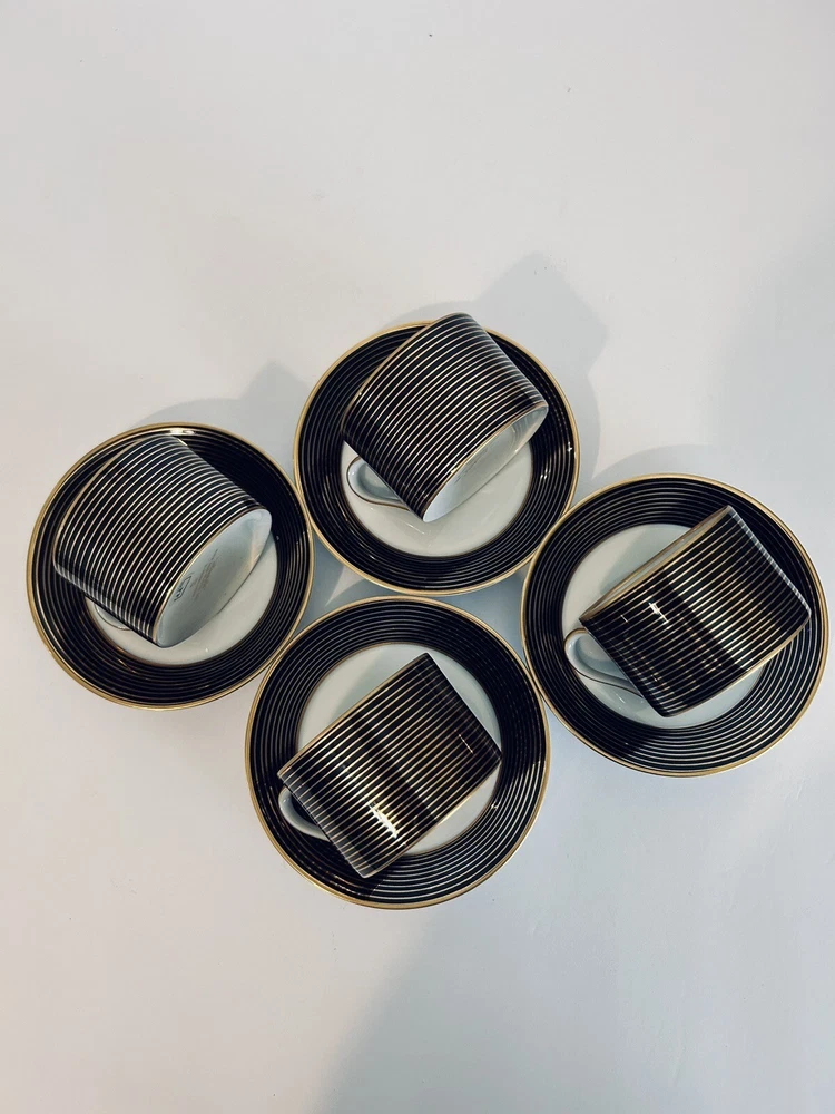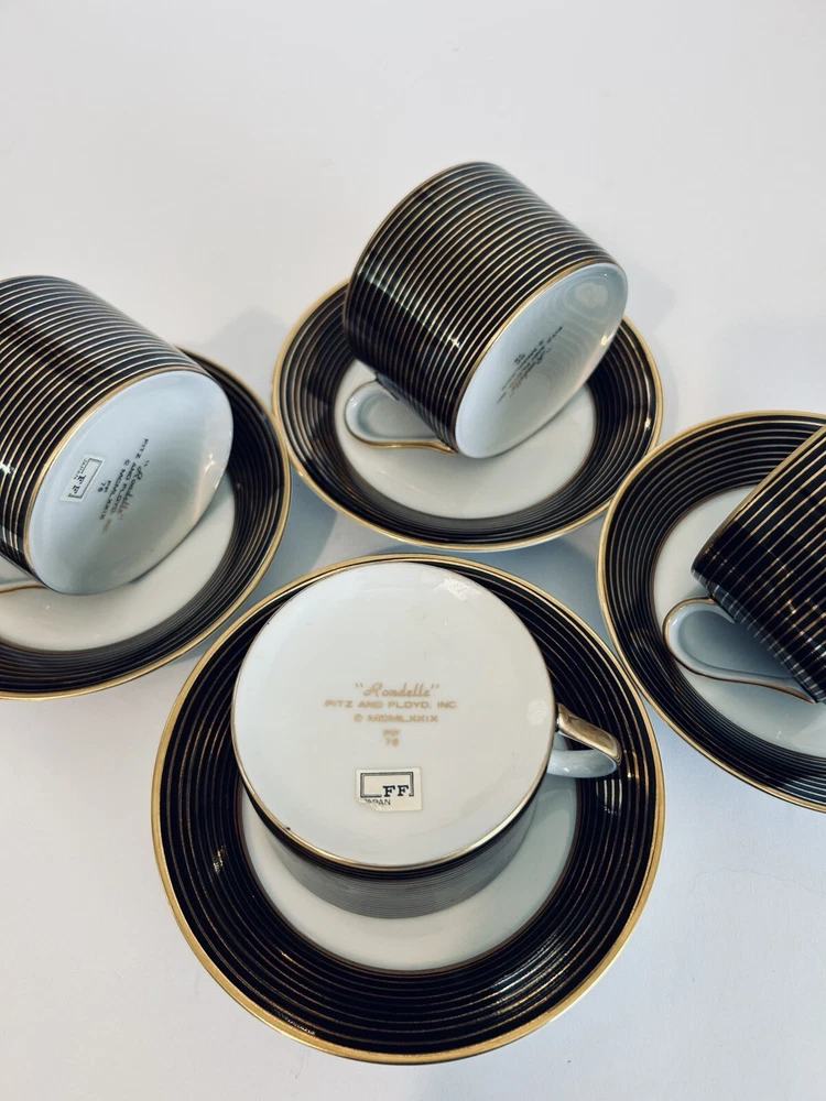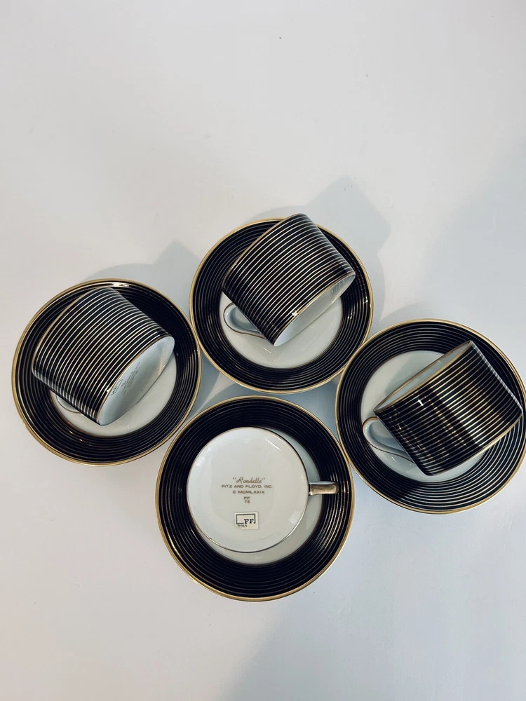 This vintage tea cup and saucer set from Fitz and Floyd's Rondelle collection is a beautiful addition to any art decor piece. The set includes four cups and saucers, each decorated with unique designs that will add a touch of elegance to your tea party. Made of high-quality porcelain, these cups and saucers are perfect for enjoying your favorite tea and coffee. The set is perfect for collectors, and the decorative style will complement any home decor. Beautiful set of (4) 10.1.24