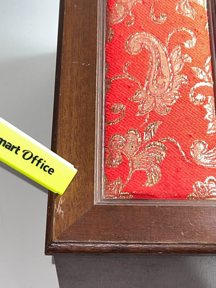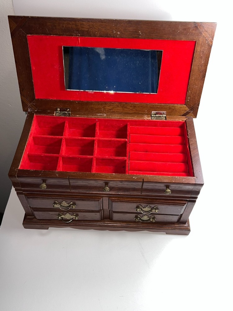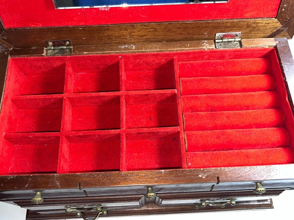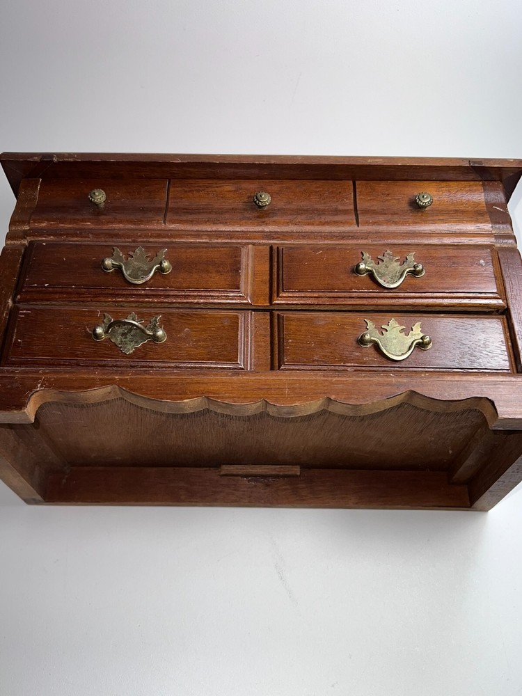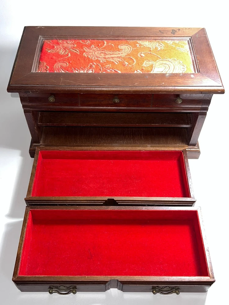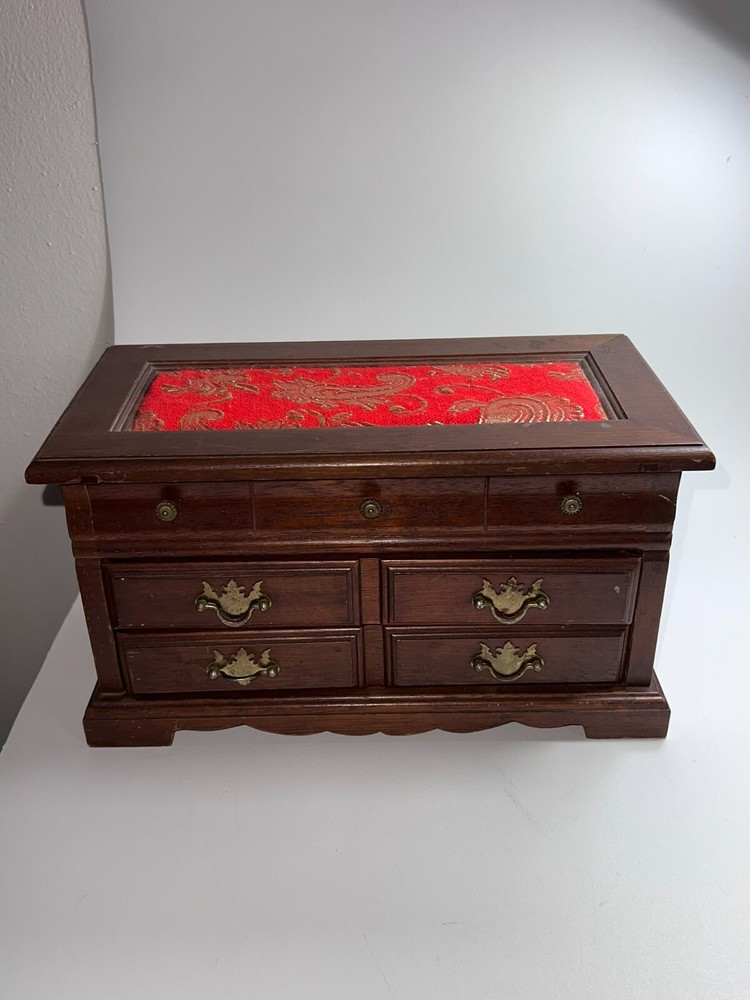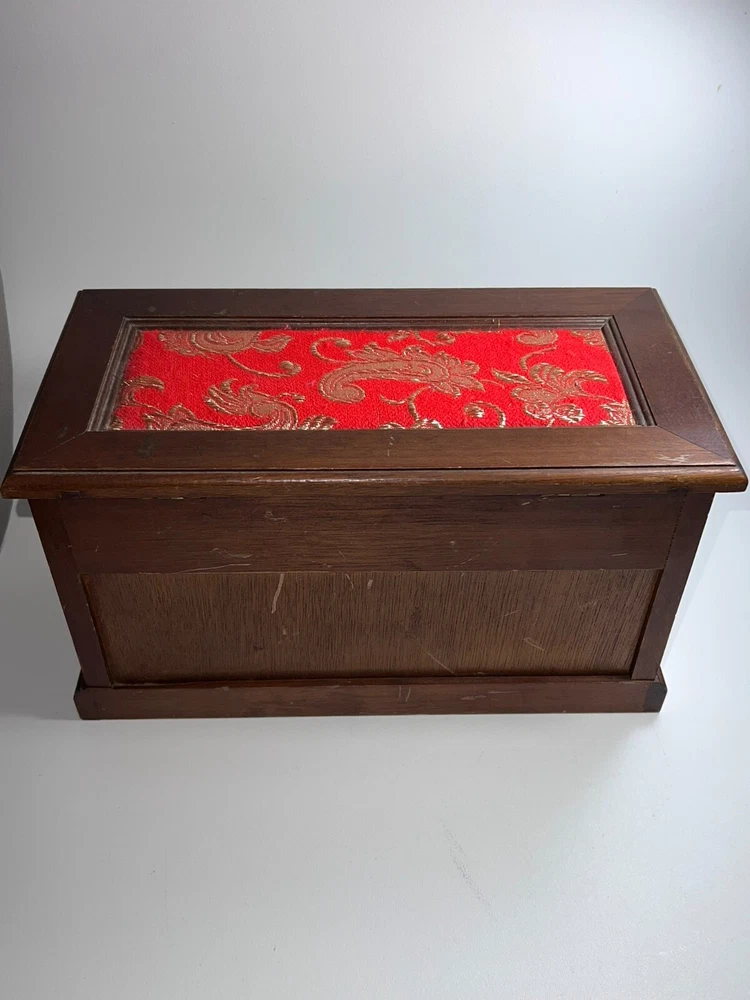 Crafted with an eye for detail, this Vintage Asian Wooden Trinket Keepsake Jewelry Box embodies the elegance of Asian culture. The medium-sized box measures 13 inches in width and 7 inches in height, offering ample space for your cherished jewelry and keepsakes. Its rich brown color and intricately carved design evoke the serenity of a temple, making it a tasteful addition to any collection. The box features a combination of wood and brass materials, ensuring both durability and a touch of sophistication. It comes beautifully boxed, ideal for gifting or as a personal treasure. With its Asian, Chinese, and Japanese thematic influences, this piece is not just a storage container but a piece of art that celebrates the beauty of Asian heritage. Good Condition show normal wear . See ALL photos