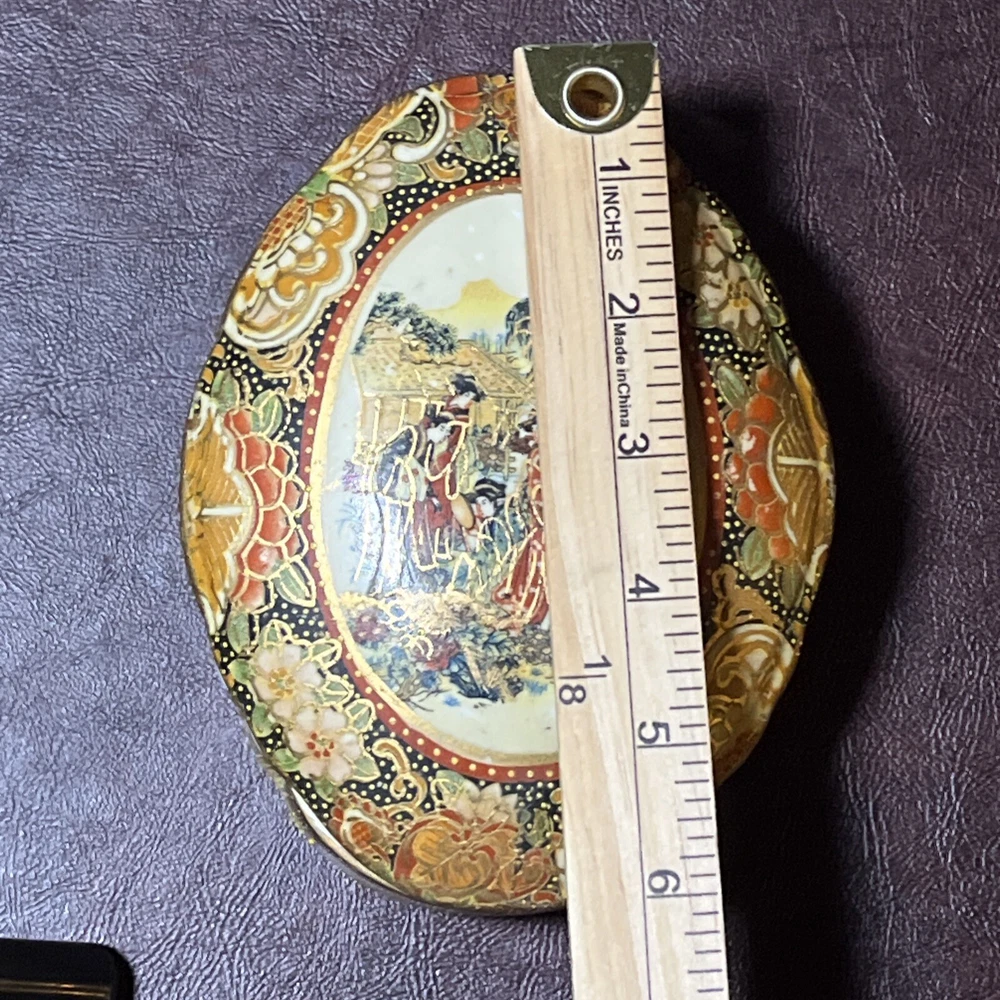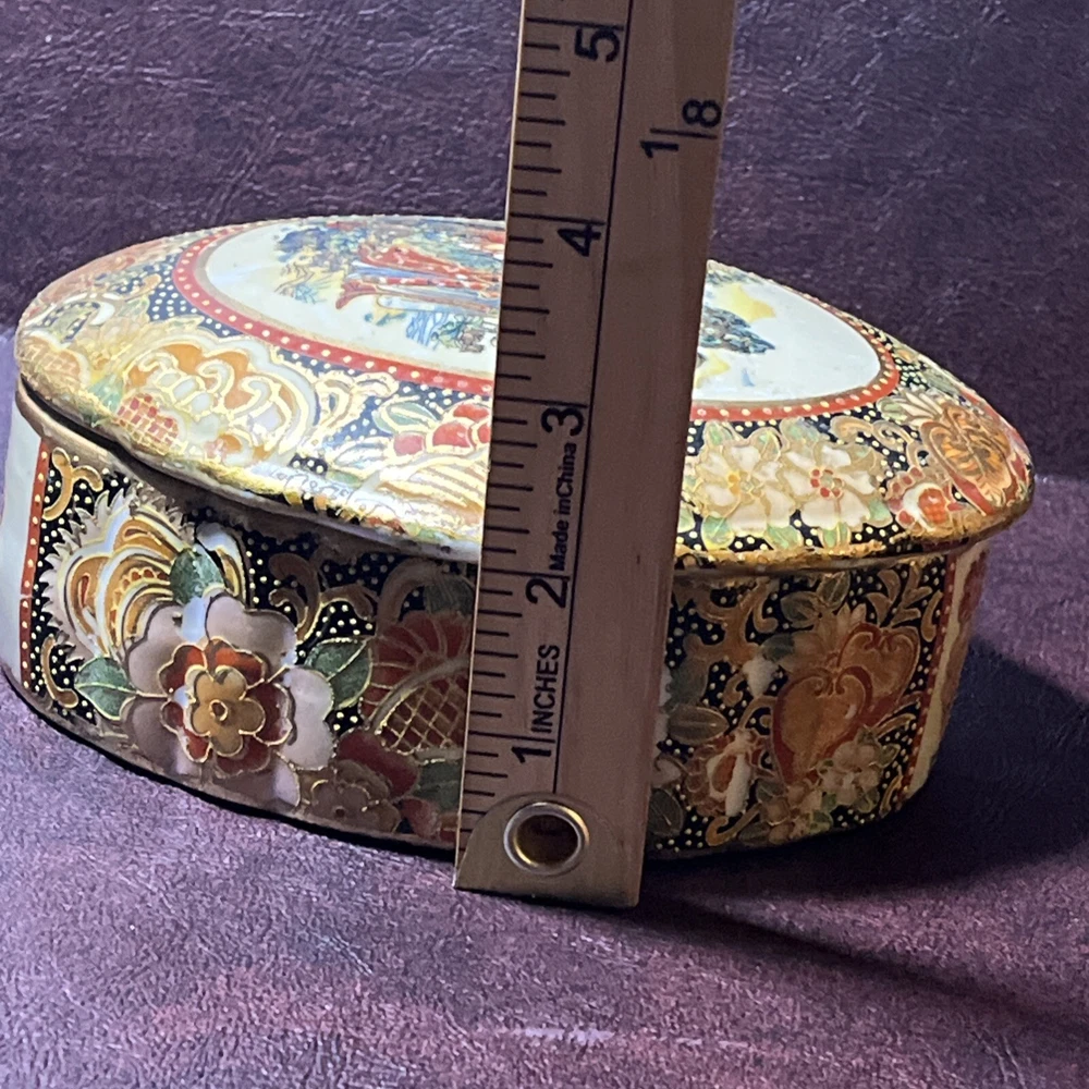 This vintage Asian ceramic jewelry box features a beautifully painted floral design with a Geisha motif, making it a charming decorative piece. The oval-shaped box with a lid provides storage for small trinkets and jewelry, perfect for all occasions. Made in China, this medium-sized trinket box showcases multicolor artwork in an Asian style, ideal for collectors and those who appreciate period styles.