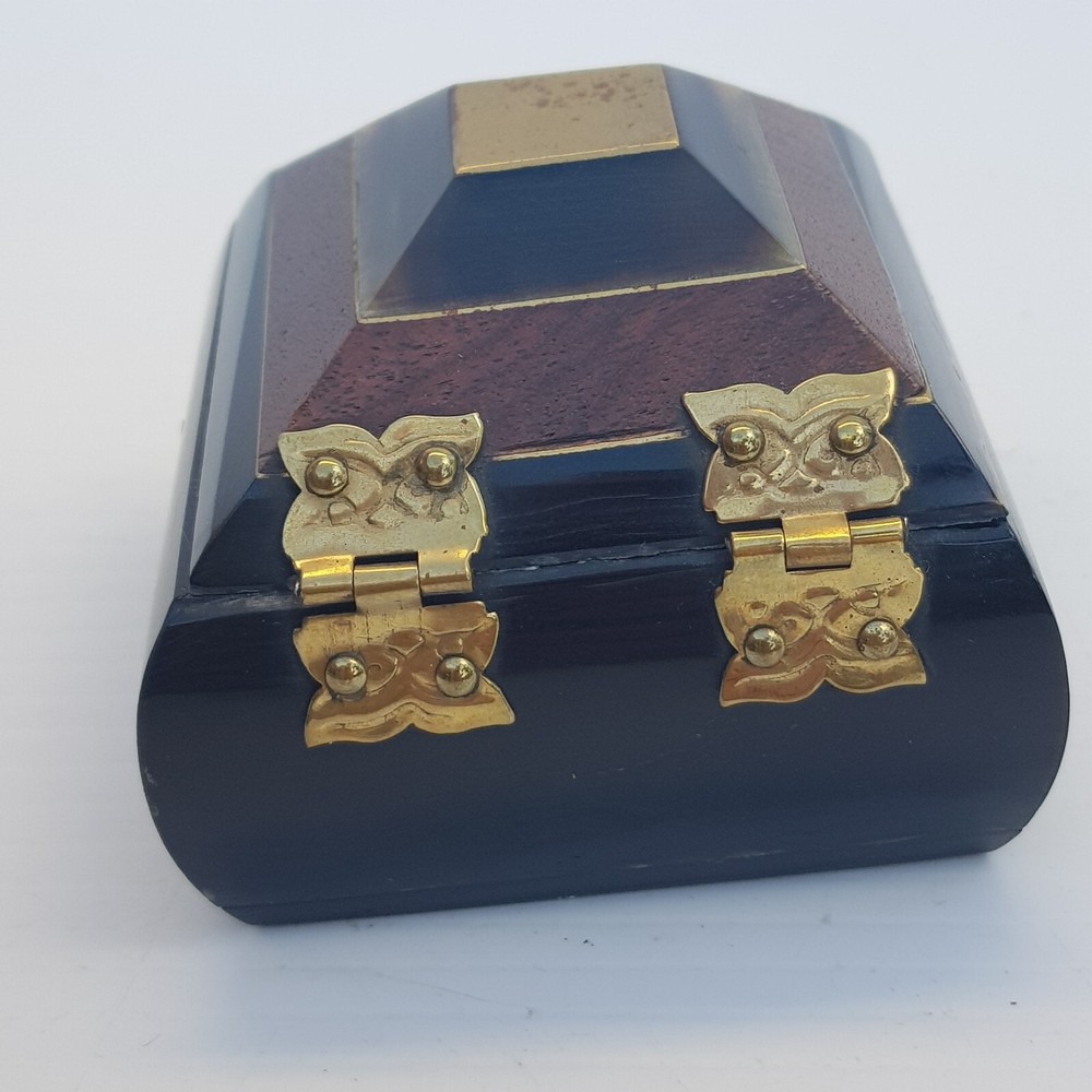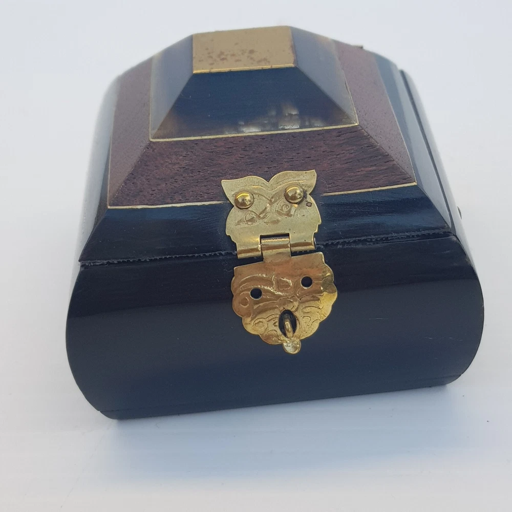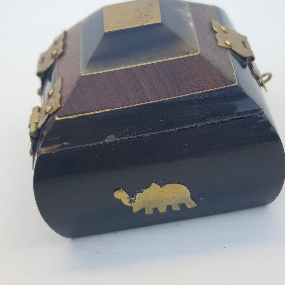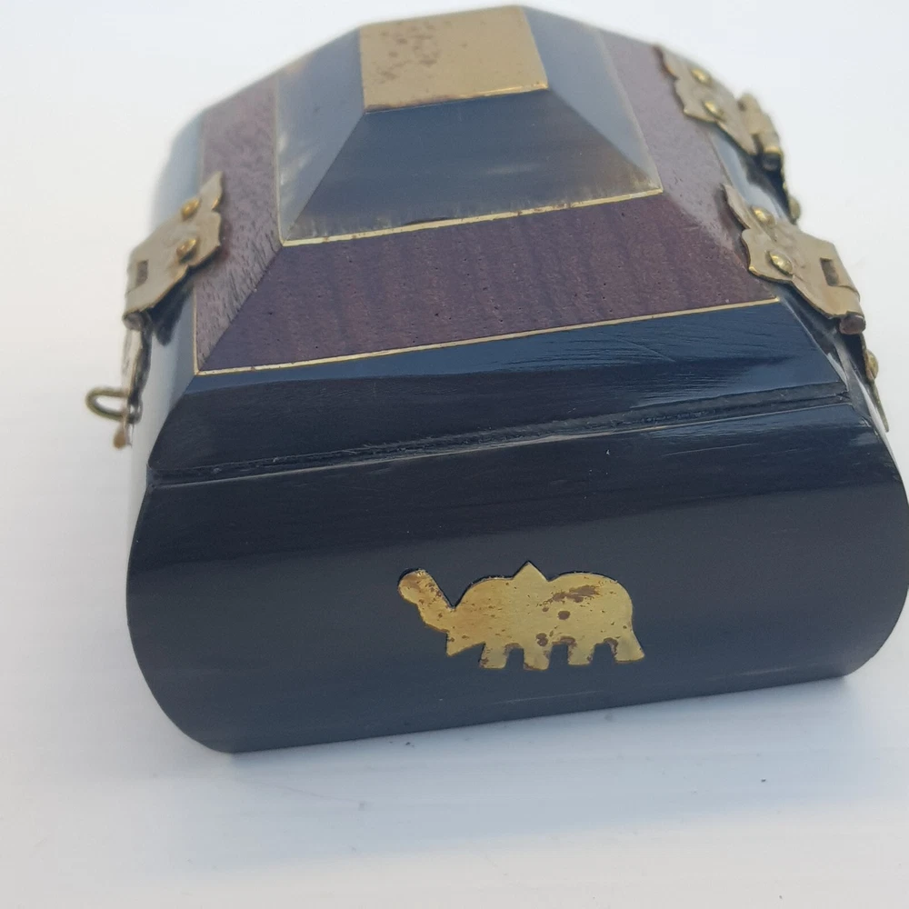 Crafted with an eye for detail, this Vintage Ring Jewelry Box is a charming addition to any collection. The brass accents paired with a wooden base create a classic look that's both elegant and sturdy. Its unique design features an Asian elephant motif, adding a touch of Asian cultural flair to your keepsakes. The trinket box is perfect for safeguarding your precious rings and other jewelry items. This is a quality item with distinction, making this piece not just a container but a work of art. Whether for personal use or as a thoughtful gift, this jewelry box is sure to be appreciated.