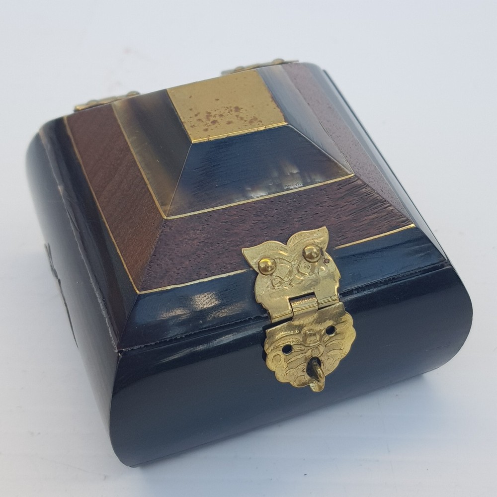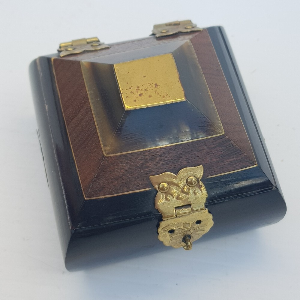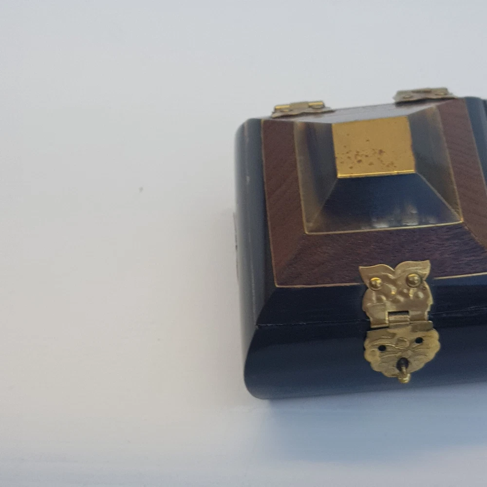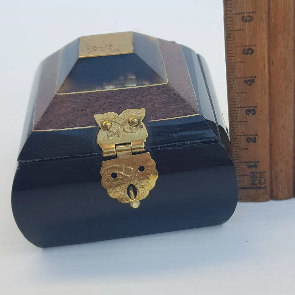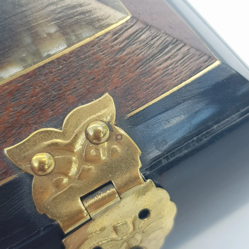 Crafted with an eye for detail, this Vintage Ring Jewelry Box is a charming addition to any collection. The brass accents paired with a wooden base create a classic look that's both elegant and sturdy. Its unique design features an Asian elephant motif, adding a touch of Asian cultural flair to your keepsakes. The trinket box is perfect for safeguarding your precious rings and other jewelry items. This is a quality item with distinction, making this piece not just a container but a work of art. Whether for personal use or as a thoughtful gift, this jewelry box is sure to be appreciated.