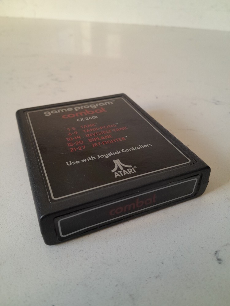 Vintage Atari 2600 Combat CX-2601 Video Game Cartridge features the game "Combat" with various modes such as Tank, Tank Pong, Invisible Tank, Biplane, and Jet Fighter. Published by Atari and designed for the Atari 2600 platform, this E-Everyone rated game was manufactured in Taiwan. The cartridge is in excellent condition and has been tested for functionality.