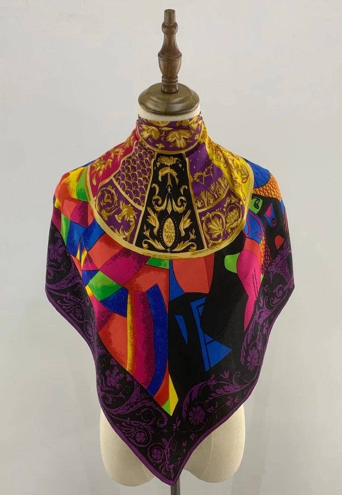 Elevate your style with this vintage Atelier Versace silk scarf, a true testament to classic design and timeless elegance. Featuring a vibrant geometric pattern that captures the essence of the 80s and 90s art theme, this square foulard is as versatile as it is visually striking. The luxurious satin silk fabric ensures a sublime touch and a high-quality finish to any ensemble. Designed for both men and women, this scarf can be worn as a neck warmer, scarf, or even a stylish accessory to accentuate your handbag. Measuring 32 inches in length and 33.5 inches in width, it is perfect for all-season use. The iconic Versace logo adds an exclusive touch to this multifunctional piece, which should be dry-cleaned to maintain its beauty.